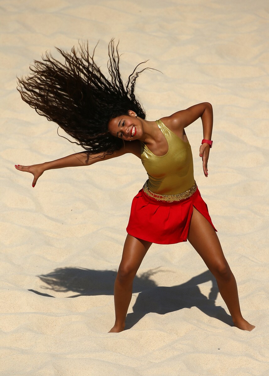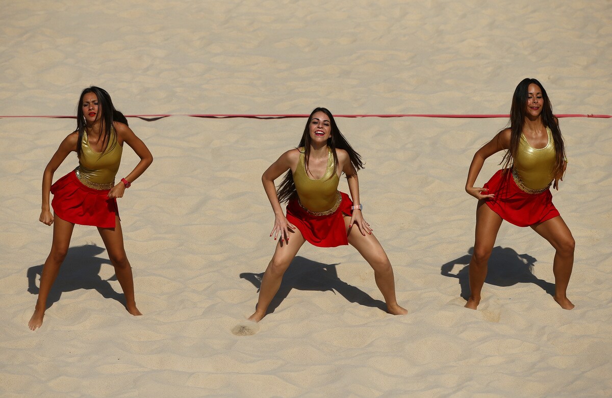 La performance di alcune ballerine prima che inizino le partite sul campo del beachvolley