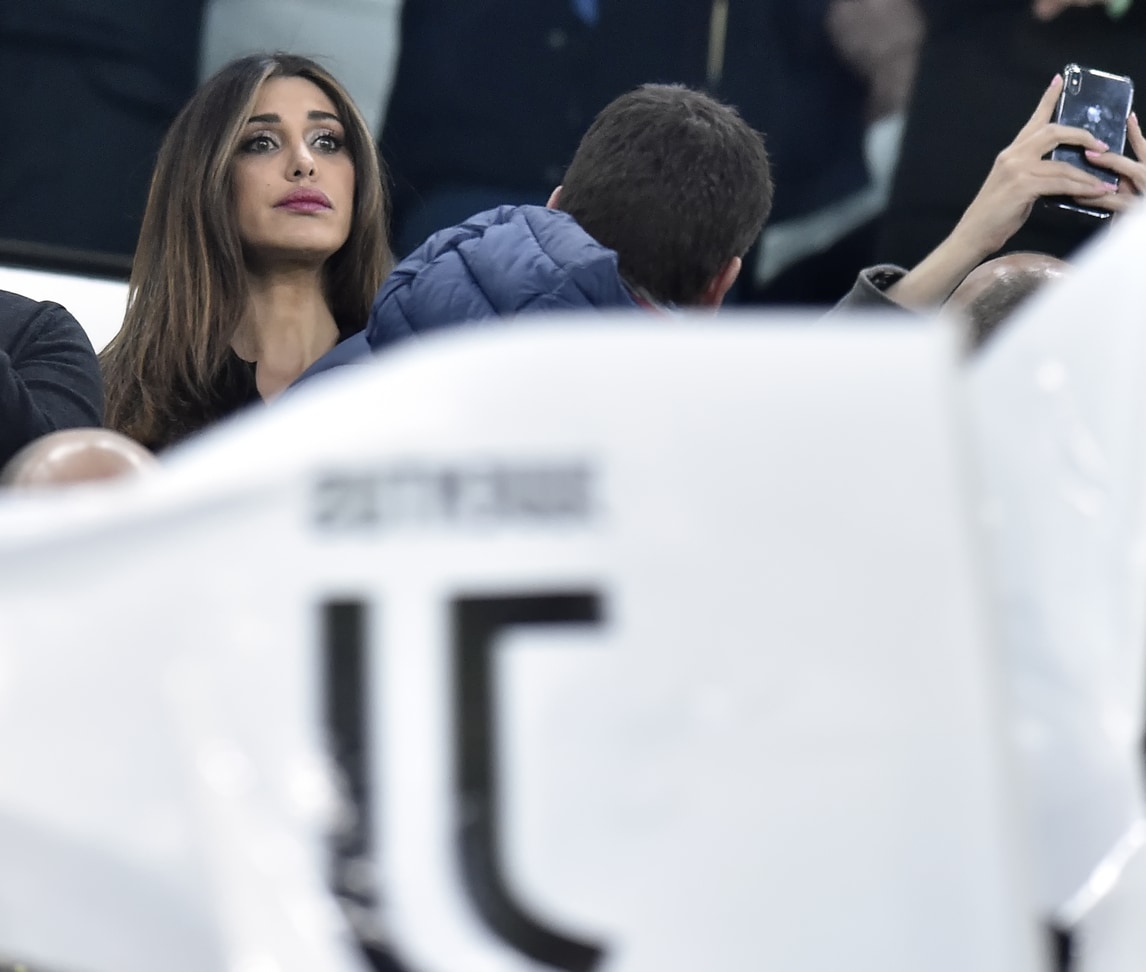 Le foto della showgirl in tribuna all'Allianz Stadium per la sfida con l'Atletico Madrid: storie e selfie su Instagram