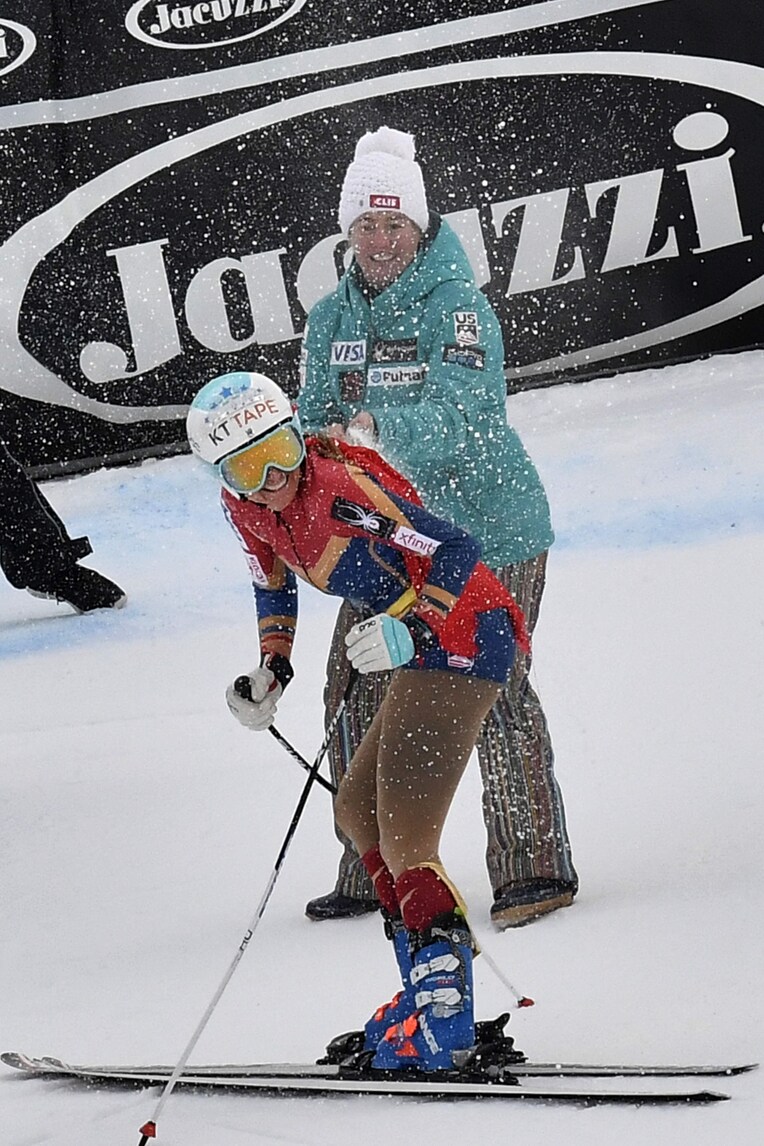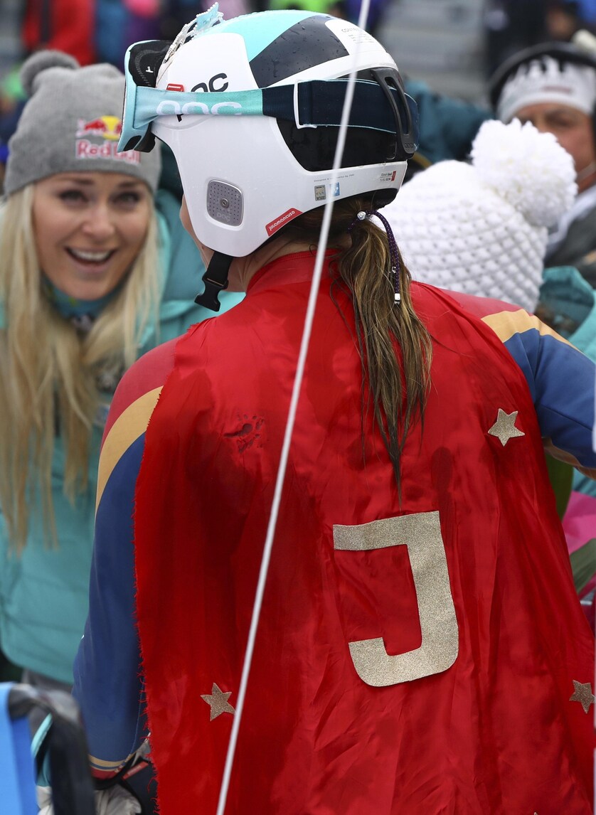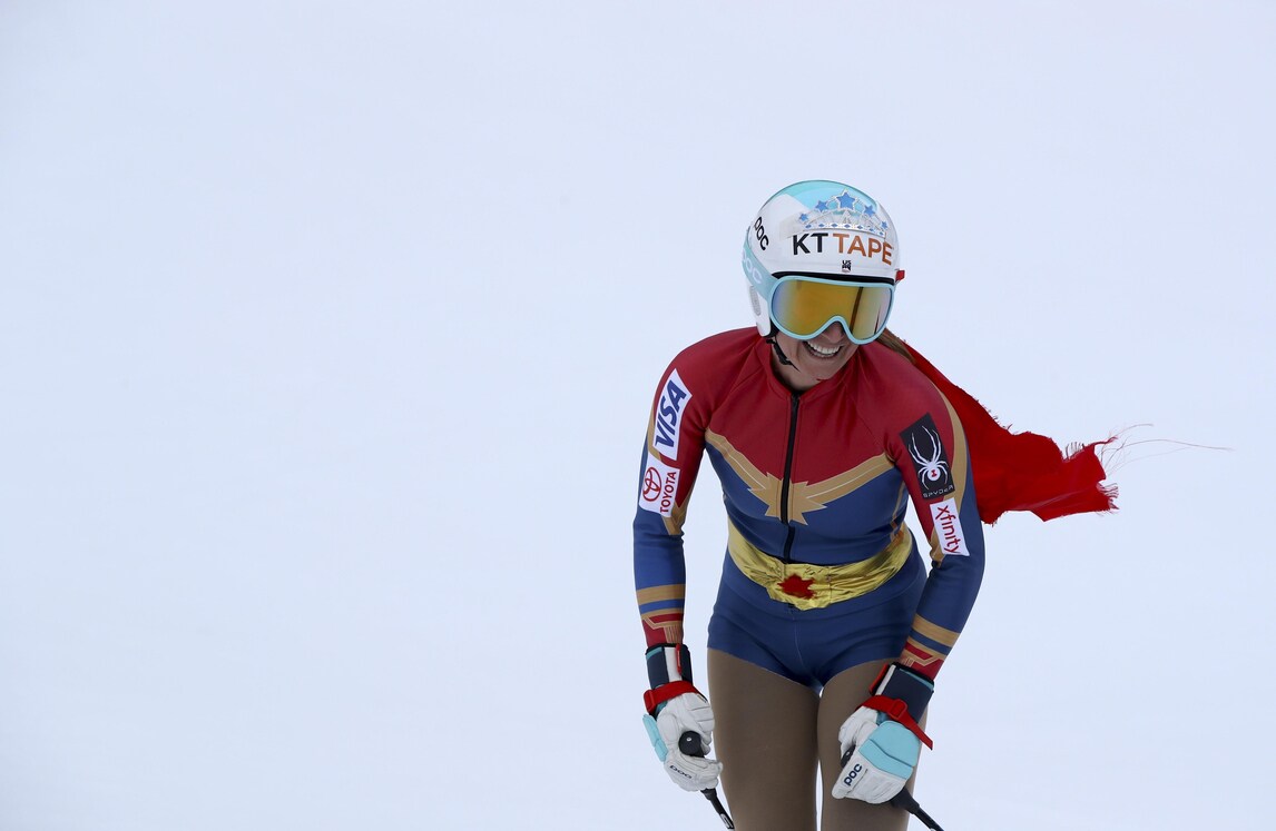 La sciatrice americana indossa il mantello da supereroina nell'ultima gara della carriera