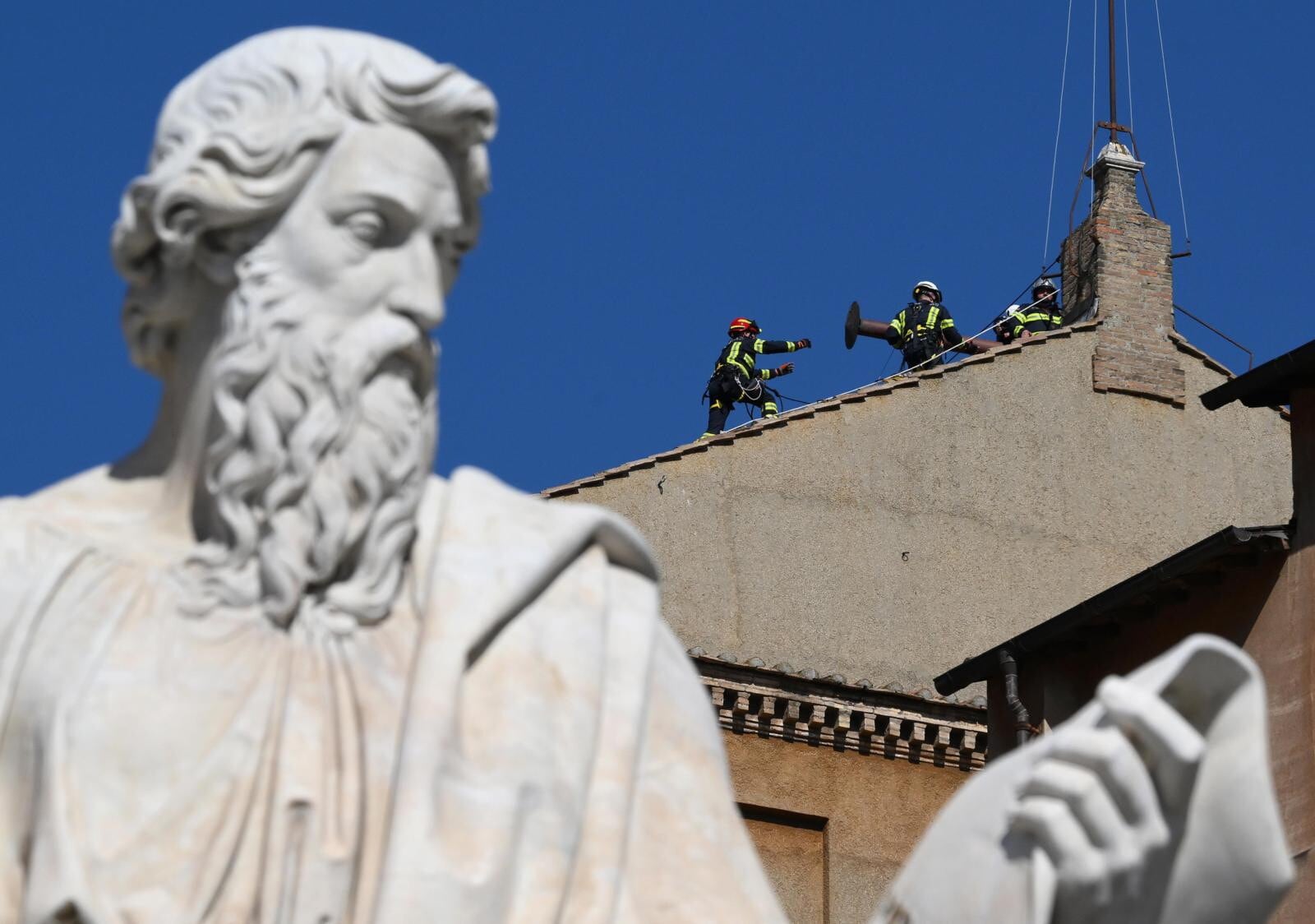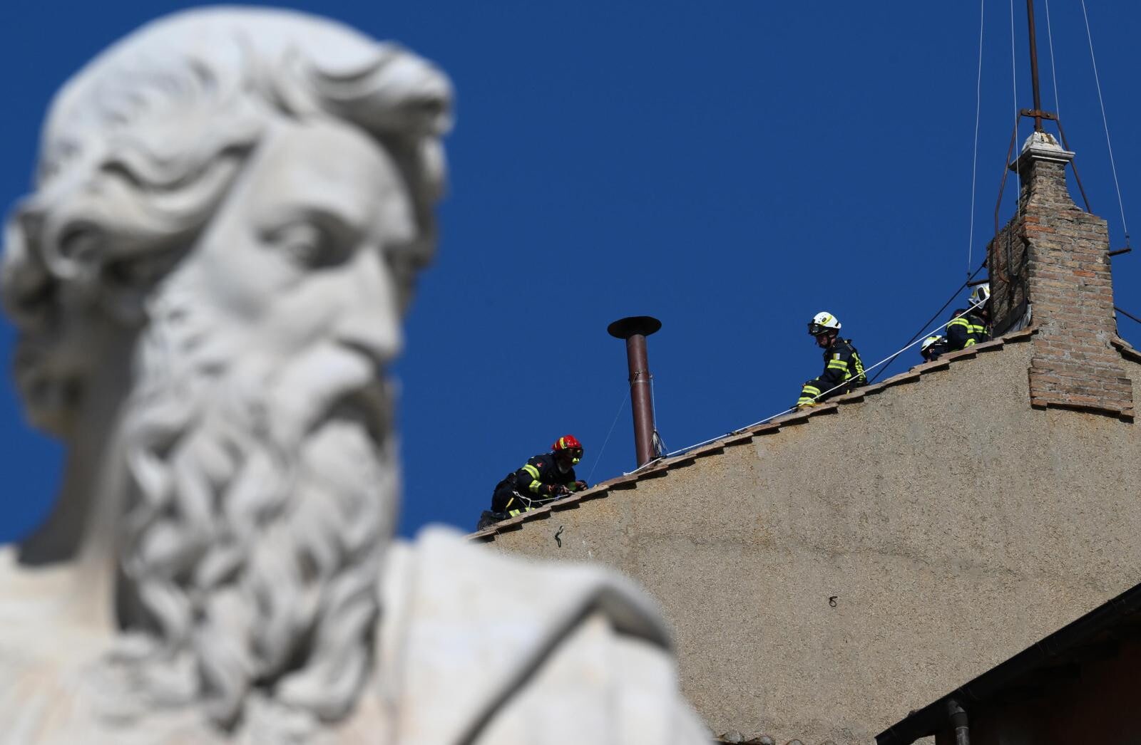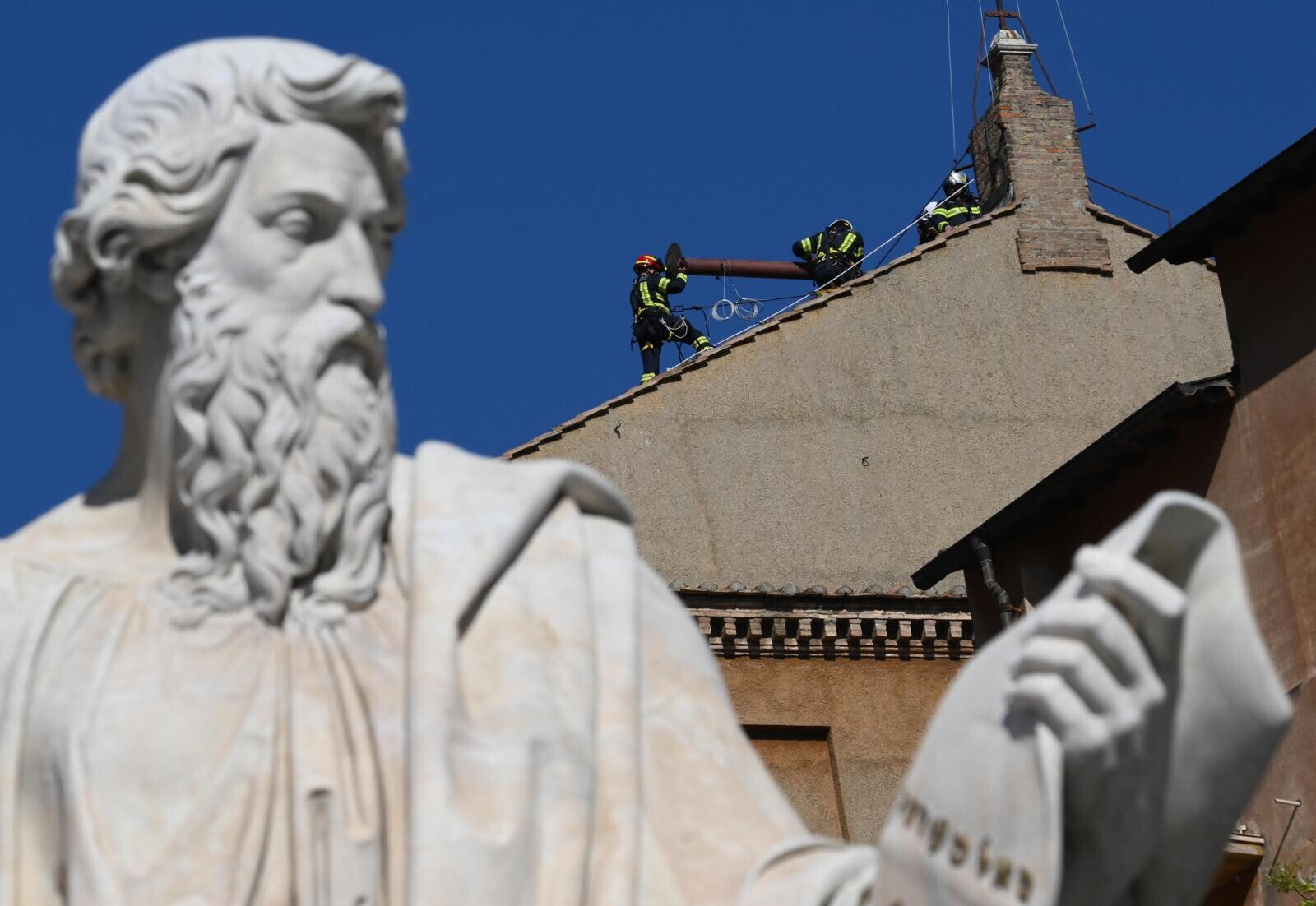 In attesa del 7 maggio i Vigili del Fuoco hanno allestito questa mattina il comignolo dal quale usciranno le fumate