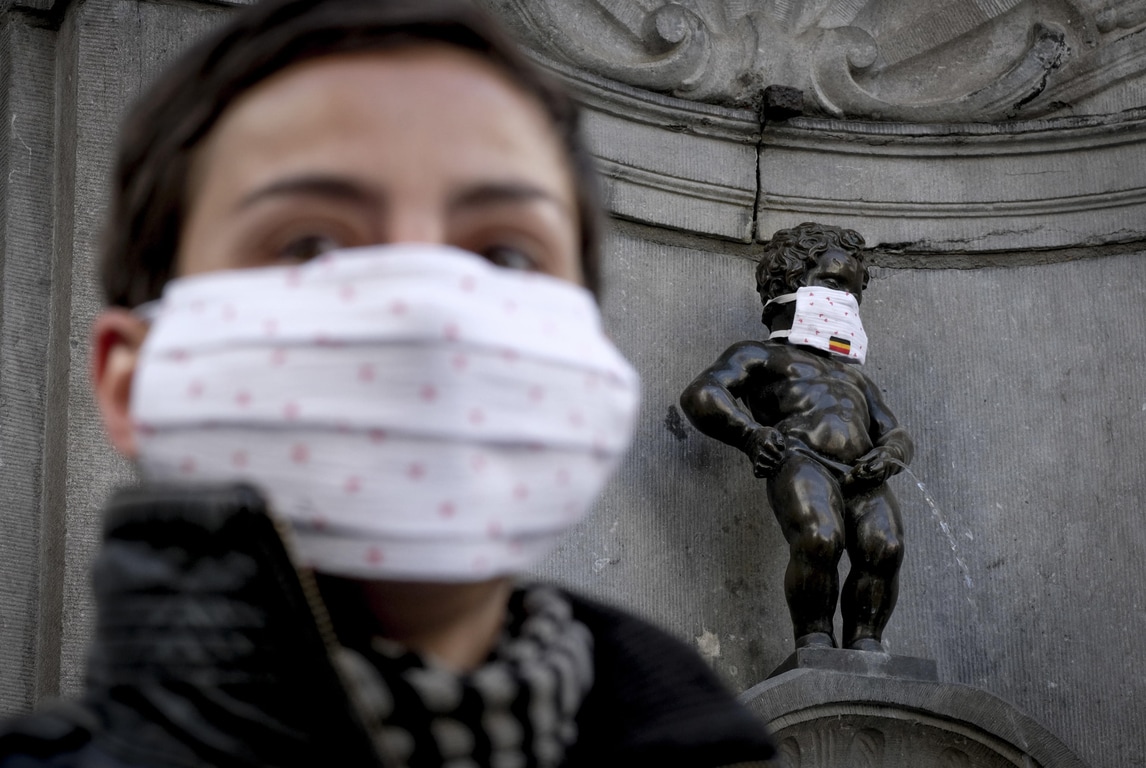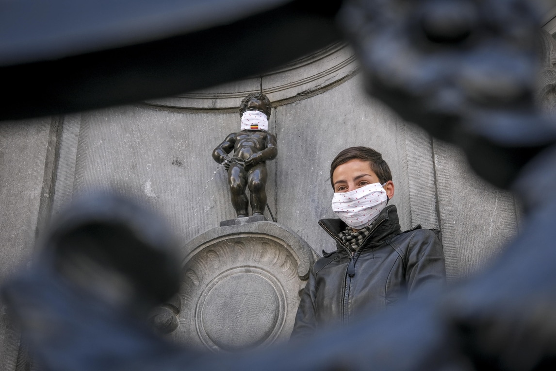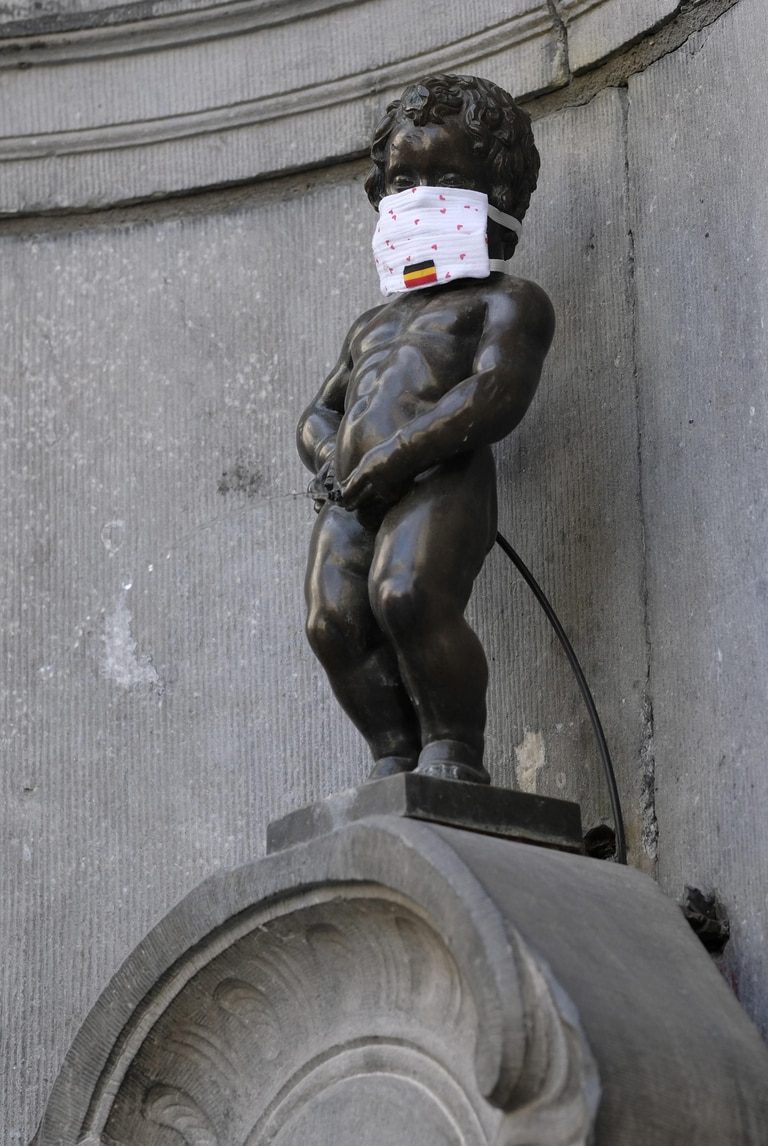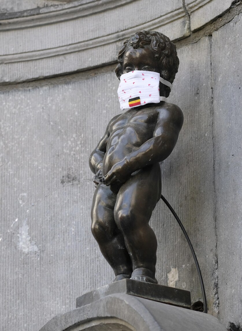 Coronavirus, anche il Manneken-Pis a Bruxelles con la mascherina
