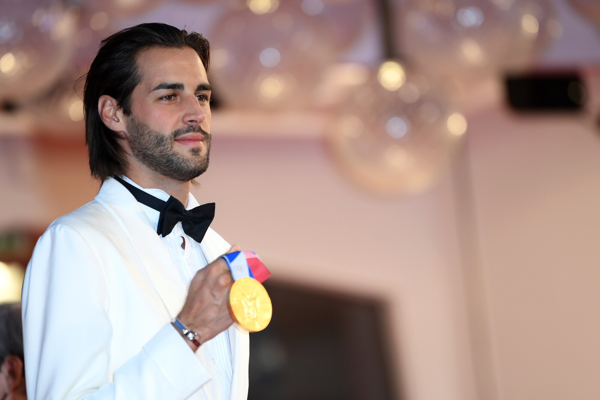 Il campione olimpico sfila alla mostra del Cinema, mostrando orgoglioso l'oro vinto a Tokyo