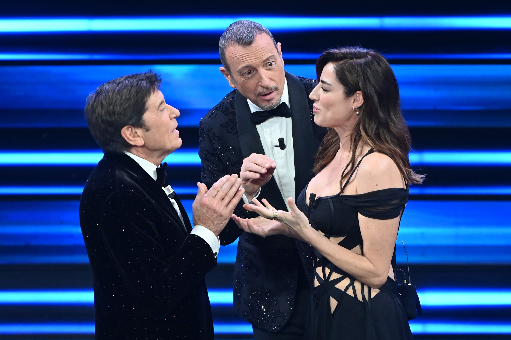 L'attrice è stata invitata da Amadeus per parlare del successo della fiction 'Le indagini di Lolita Lobosco 2'. Si è presentata con un lungo abito nero con spacco inguinale, che si è aperto mentre scendeva le scale