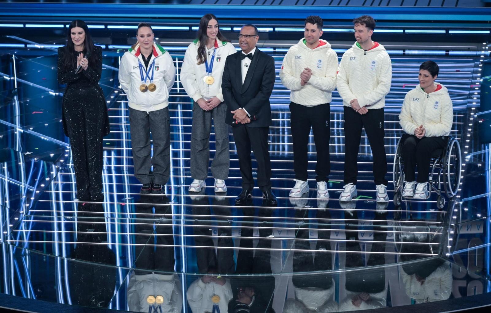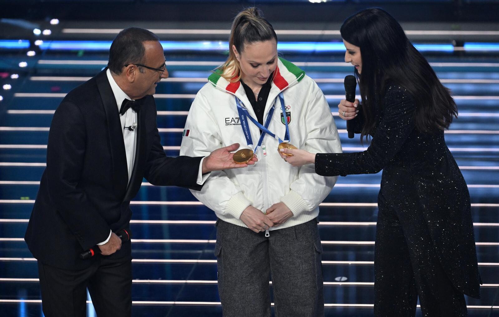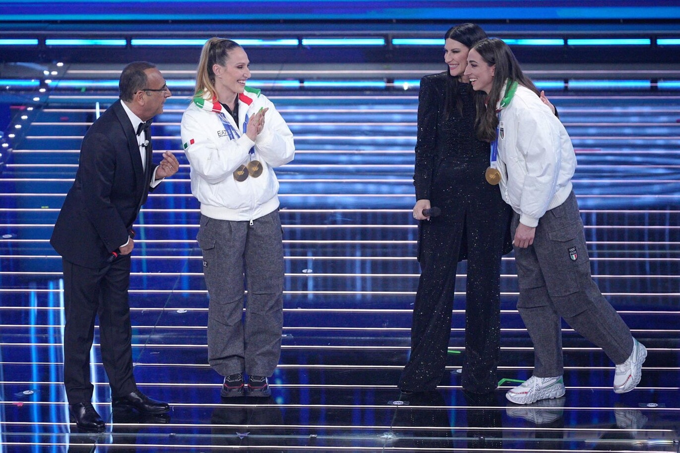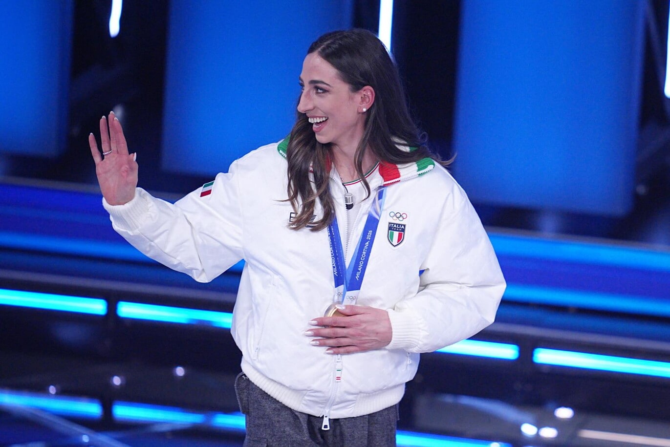Le due azzurre del pattinaggio di velocità (oro nei 3mila metri e nei 5mila metri) e del biathlon (oro inseguimento 10 km donne e argento nella staffetta mista) salgono sul palco insieme agli atleti paralimpici Giacomo Bertagnolli e Giuliana Turra. Grande assente per febbre e influenza invece Arianna Fontana, la sportiva tricolore più medagliata di sempre ai Giochi Olimpici