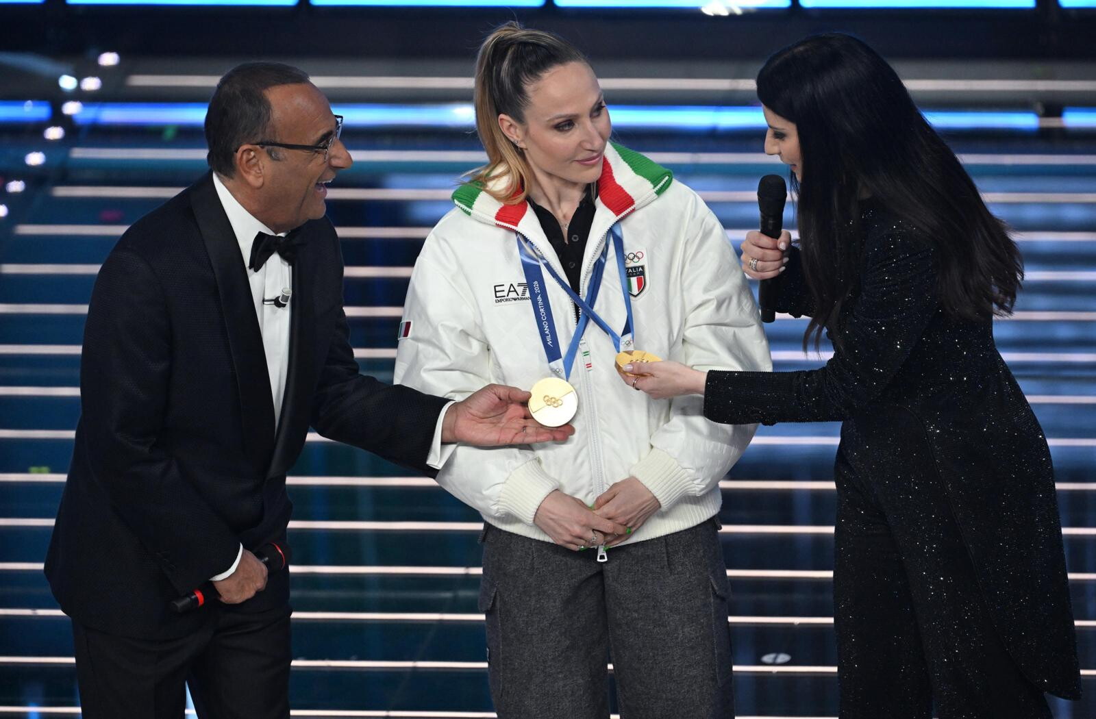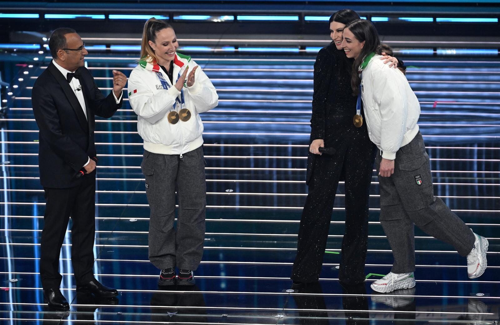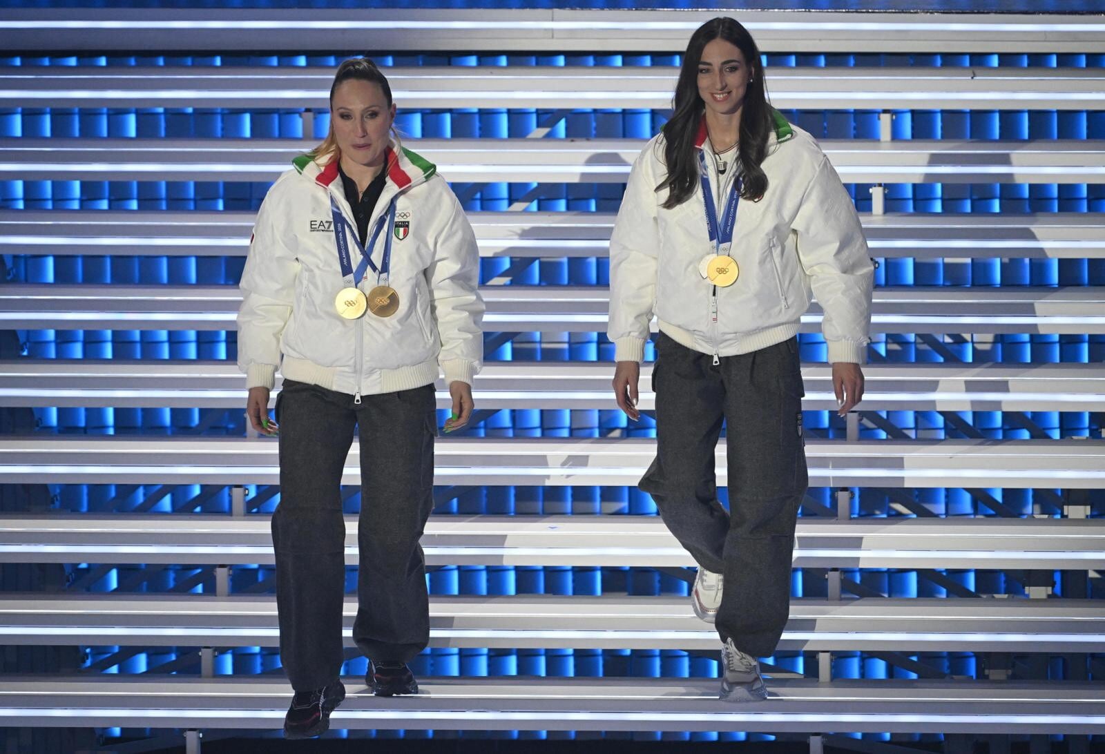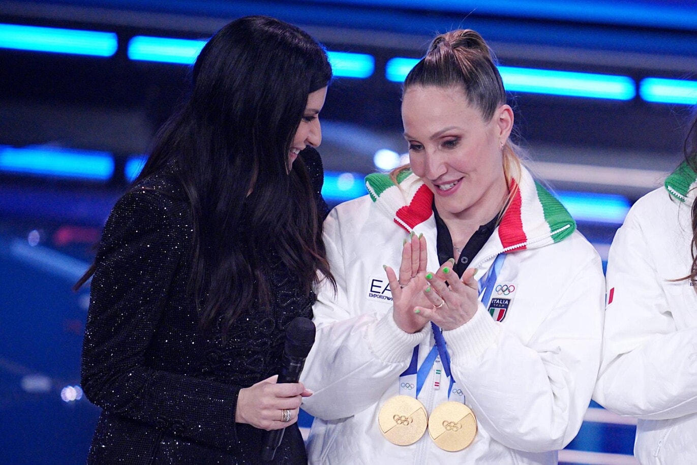 Le due azzurre del pattinaggio di velocità (oro nei 3mila metri e nei 5mila metri) e del biathlon (oro inseguimento 10 km donne e argento nella staffetta mista) salgono sul palco insieme agli atleti paralimpici Giacomo Bertagnolli e Giuliana Turra. Grande assente per febbre e influenza invece Arianna Fontana, la sportiva tricolore più medagliata di sempre ai Giochi Olimpici