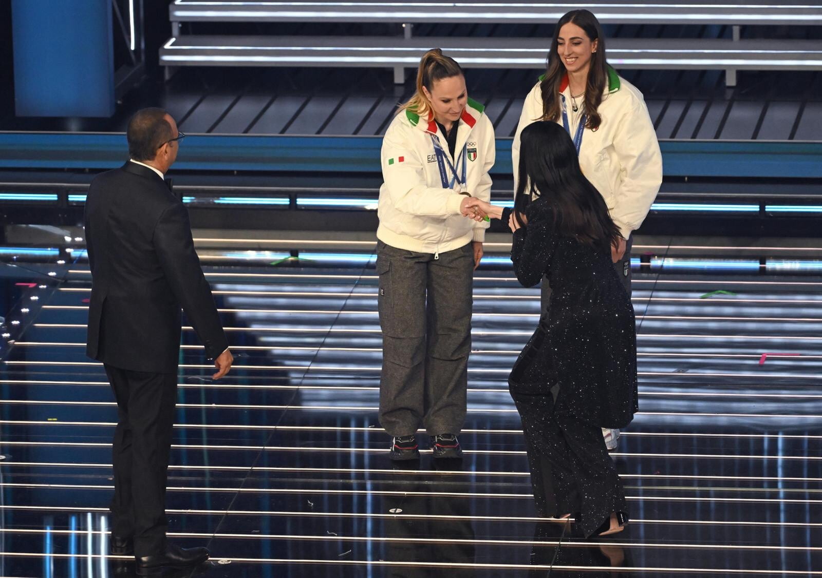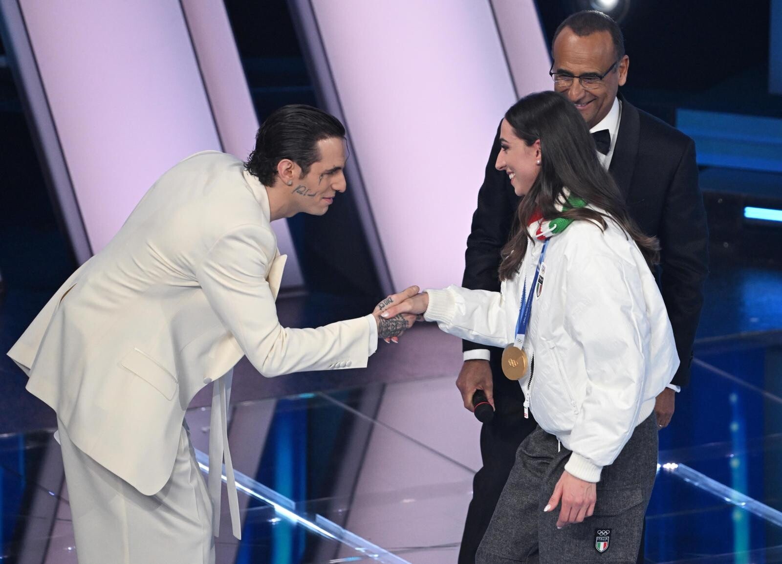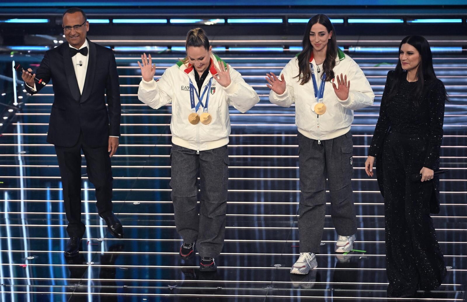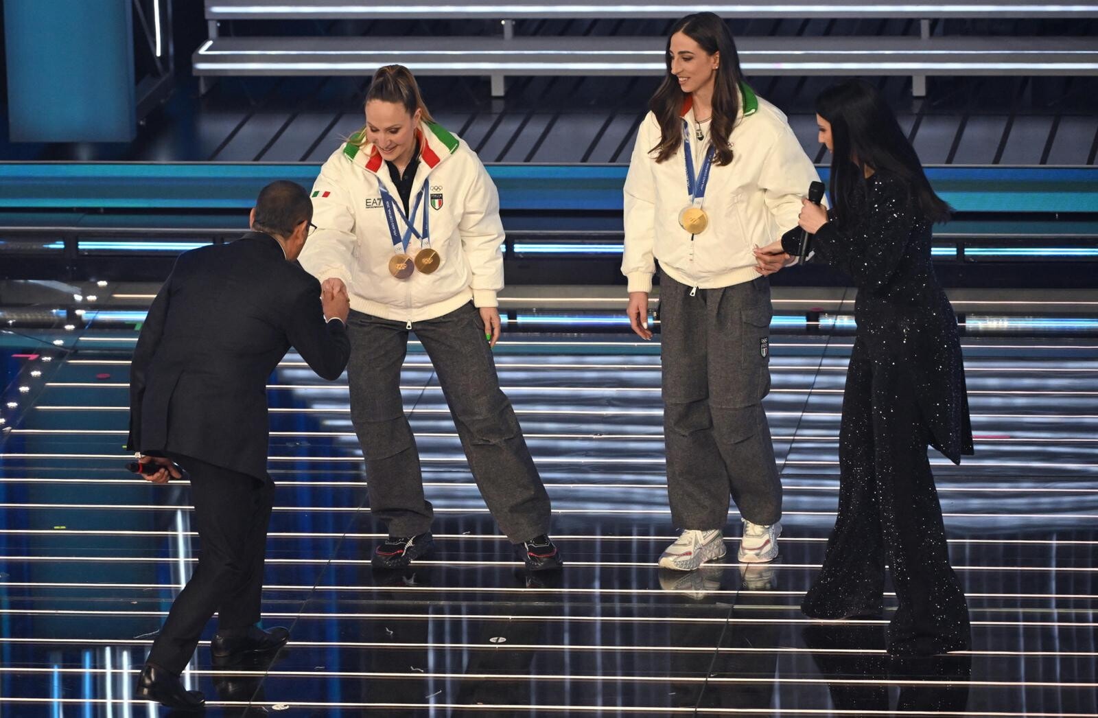 Le due azzurre del pattinaggio di velocità (oro nei 3mila metri e nei 5mila metri) e del biathlon (oro inseguimento 10 km donne e argento nella staffetta mista) salgono sul palco insieme agli atleti paralimpici Giacomo Bertagnolli e Giuliana Turra. Grande assente per febbre e influenza invece Arianna Fontana, la sportiva tricolore più medagliata di sempre ai Giochi Olimpici