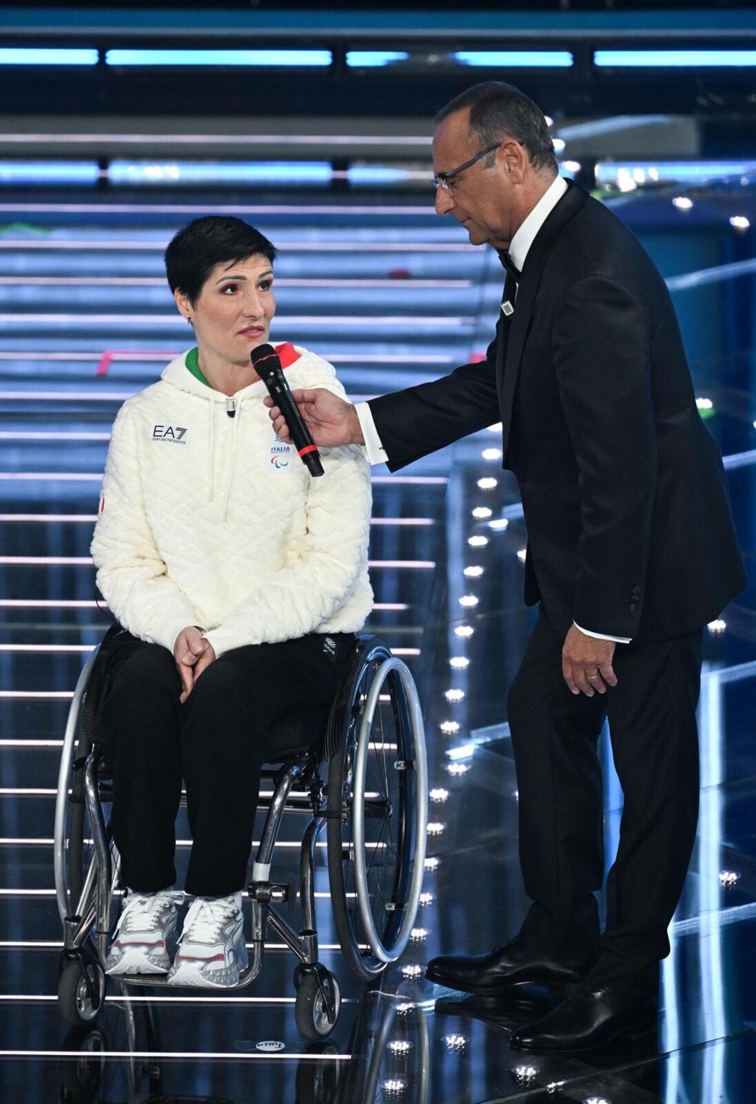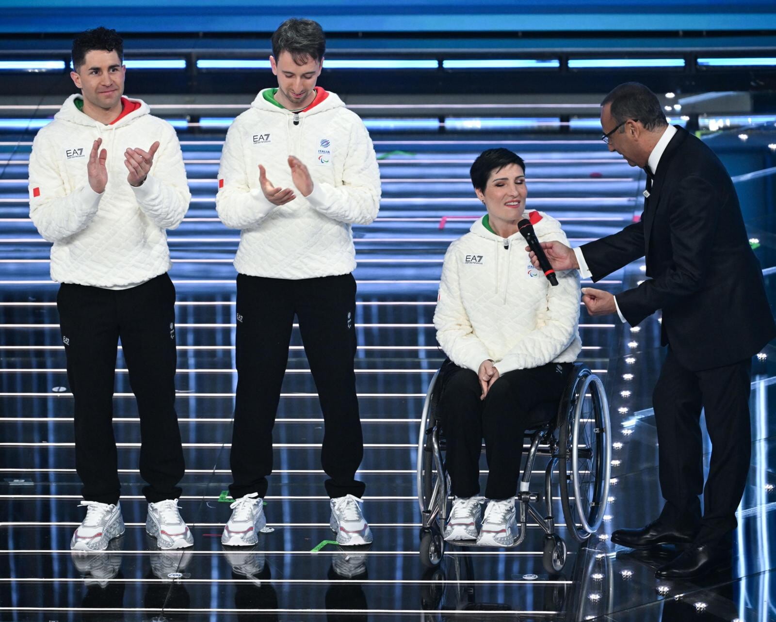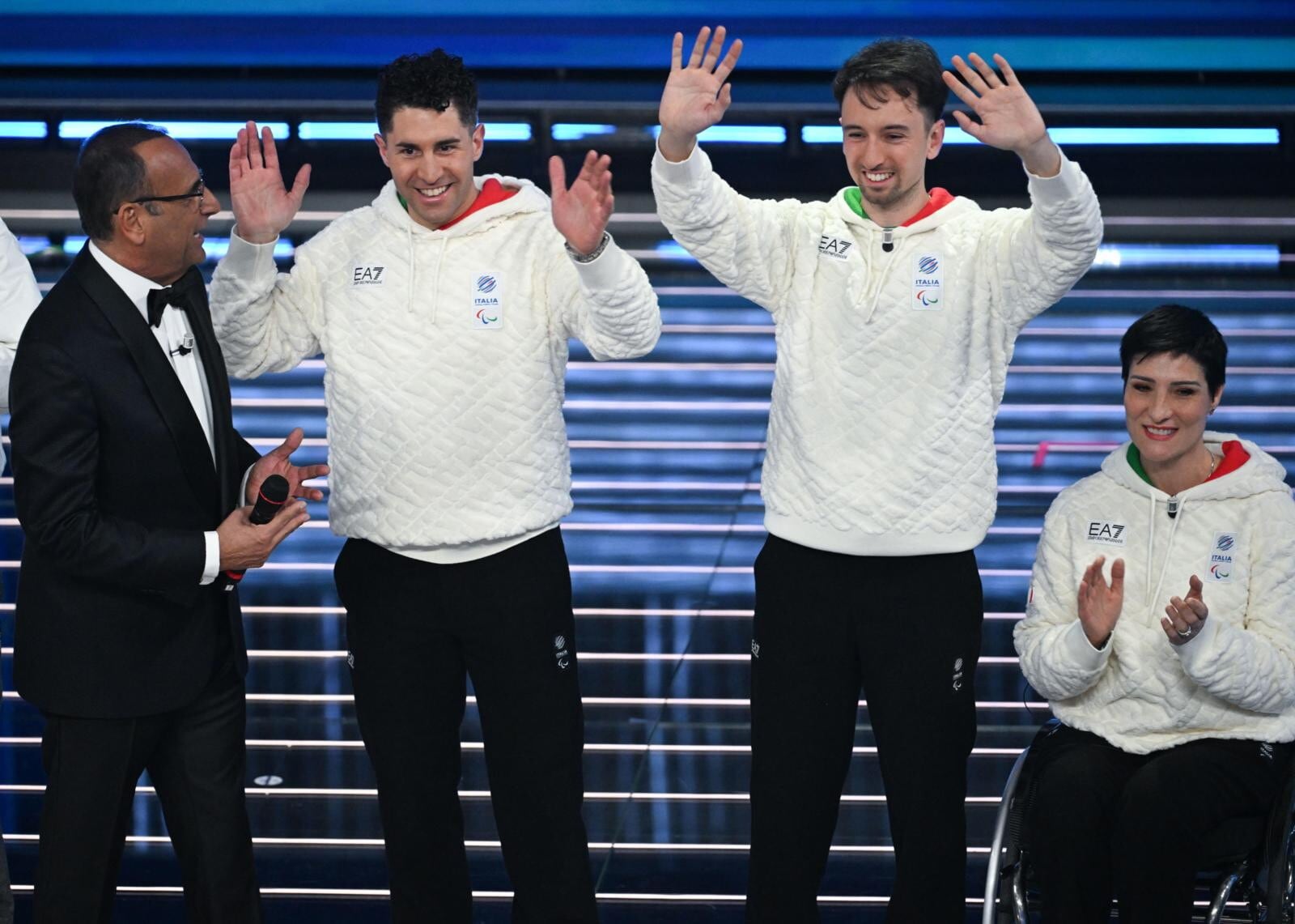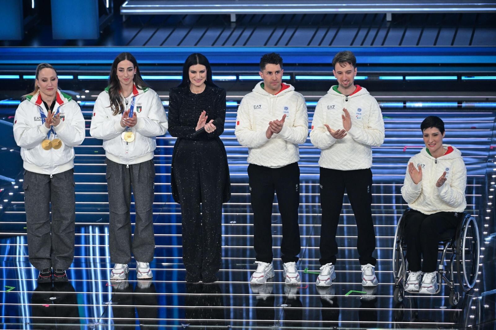 Le due azzurre del pattinaggio di velocità (oro nei 3mila metri e nei 5mila metri) e del biathlon (oro inseguimento 10 km donne e argento nella staffetta mista) salgono sul palco insieme agli atleti paralimpici Giacomo Bertagnolli e Giuliana Turra. Grande assente per febbre e influenza invece Arianna Fontana, la sportiva tricolore più medagliata di sempre ai Giochi Olimpici