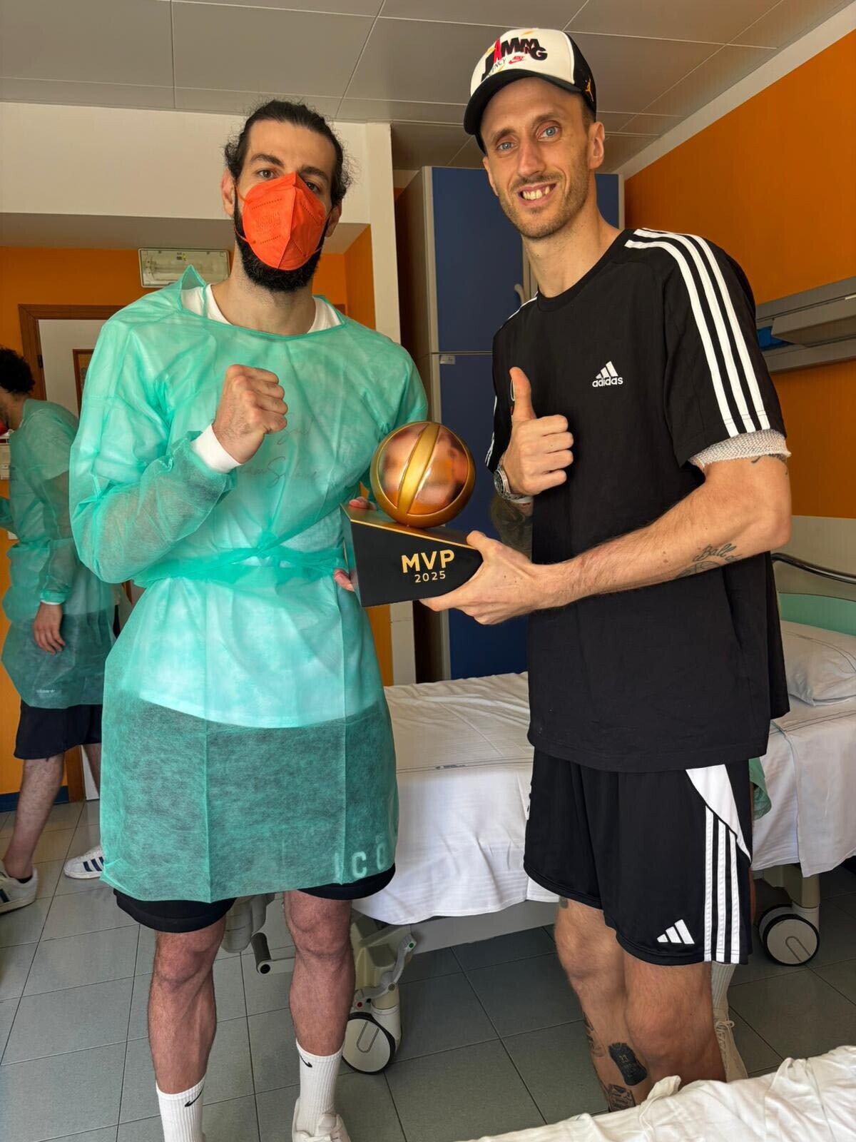 Alessandro Pajola, capitan Marco Belinelli e Toko Shengelia portano la coppa del tricolore e il trofeo Mvp al compagno di squadra, ricoverato per una leucemia al policlinico Sant'Orsola