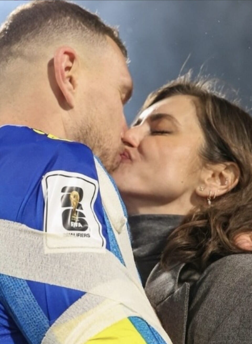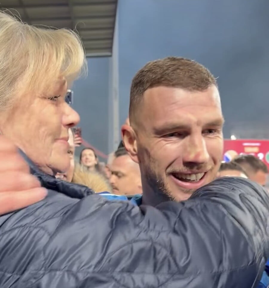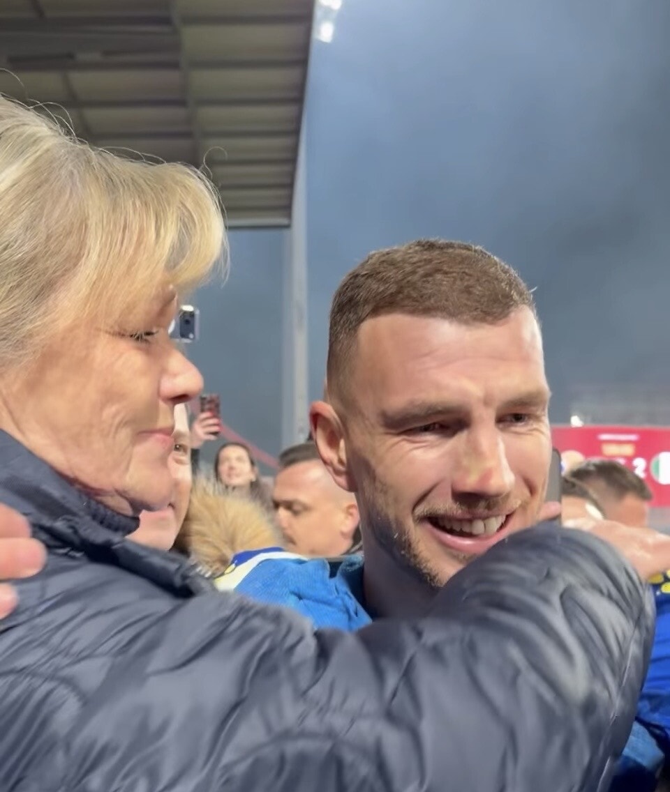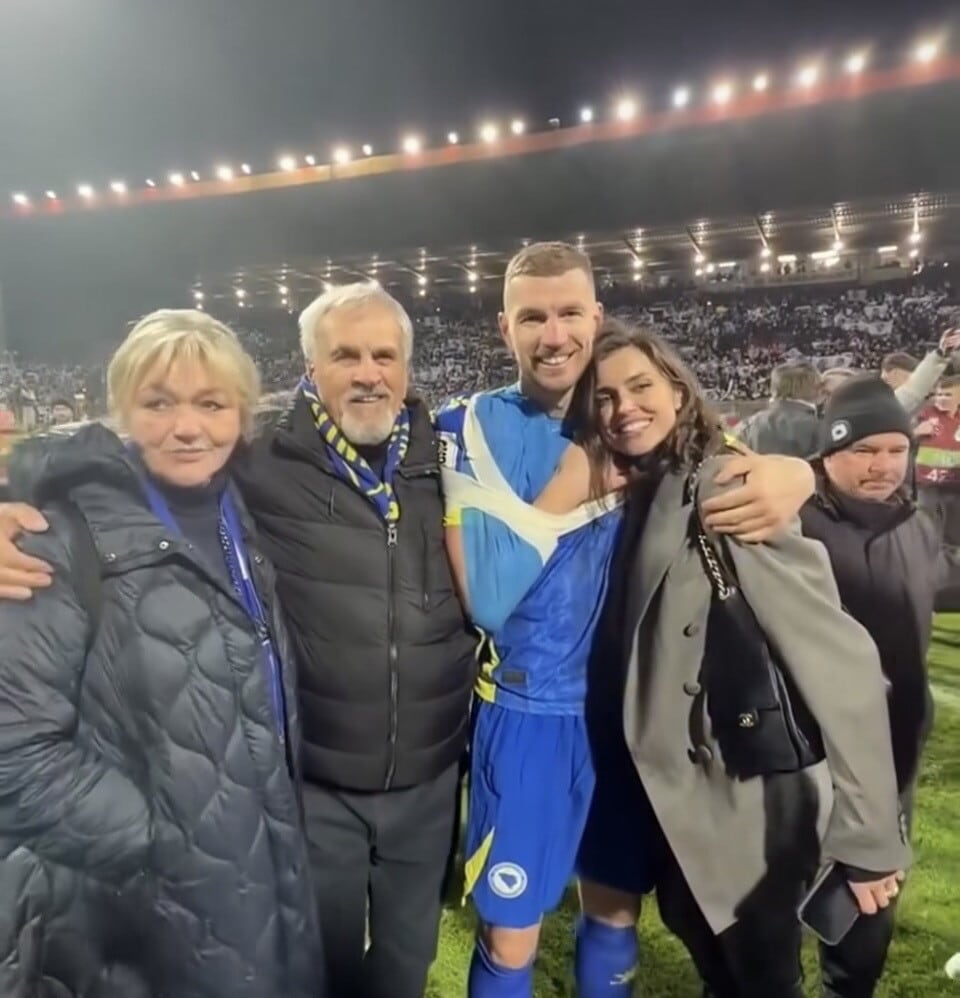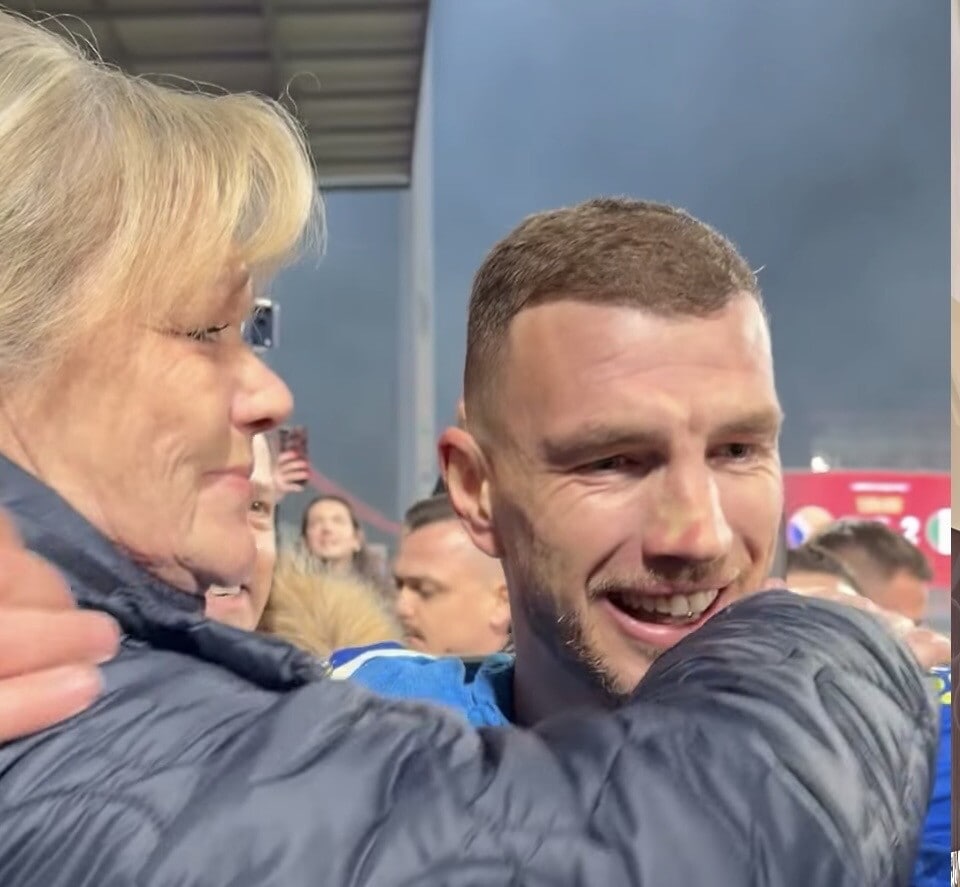 Scoppia a piangere con i genitori, bacia la moglie Amra e abbraccia l'ex compagno Cristante: le foto di Dzeko fanno il giro del mondo