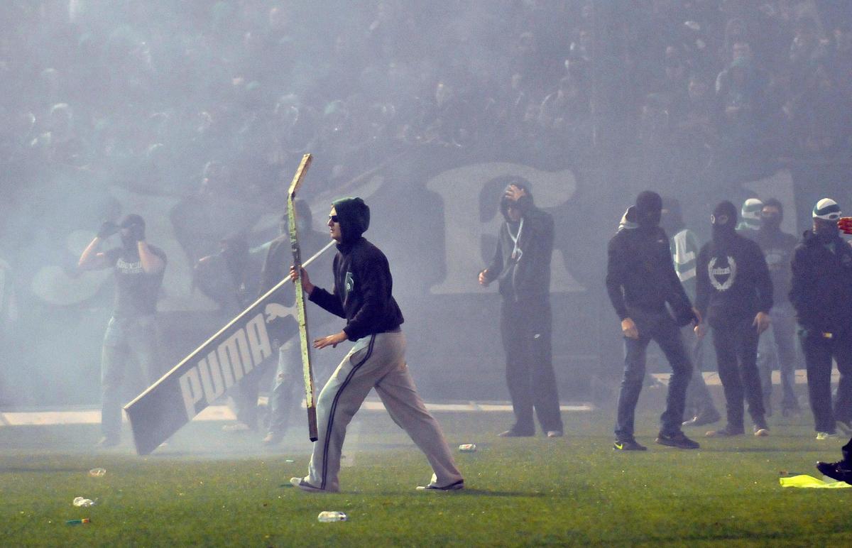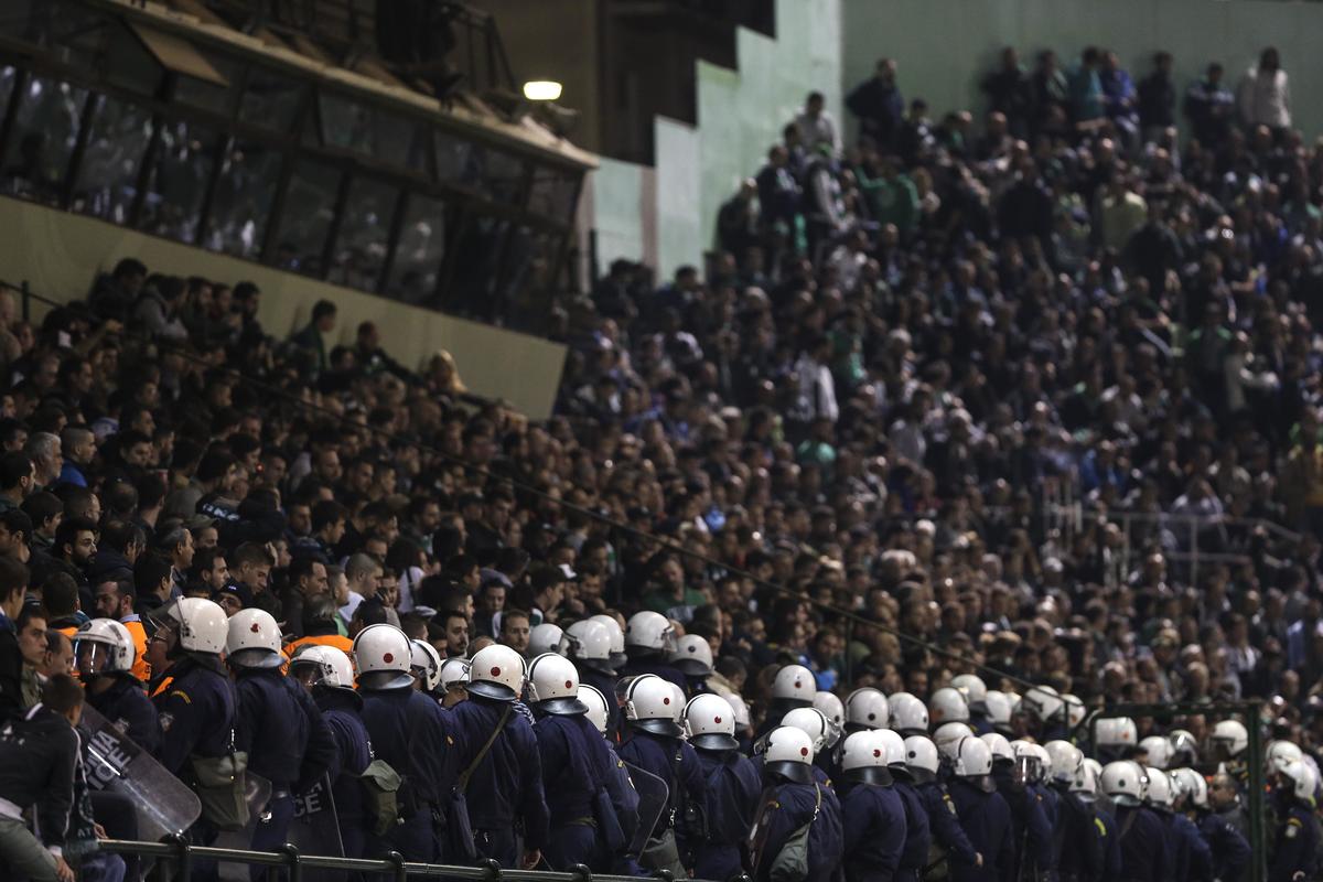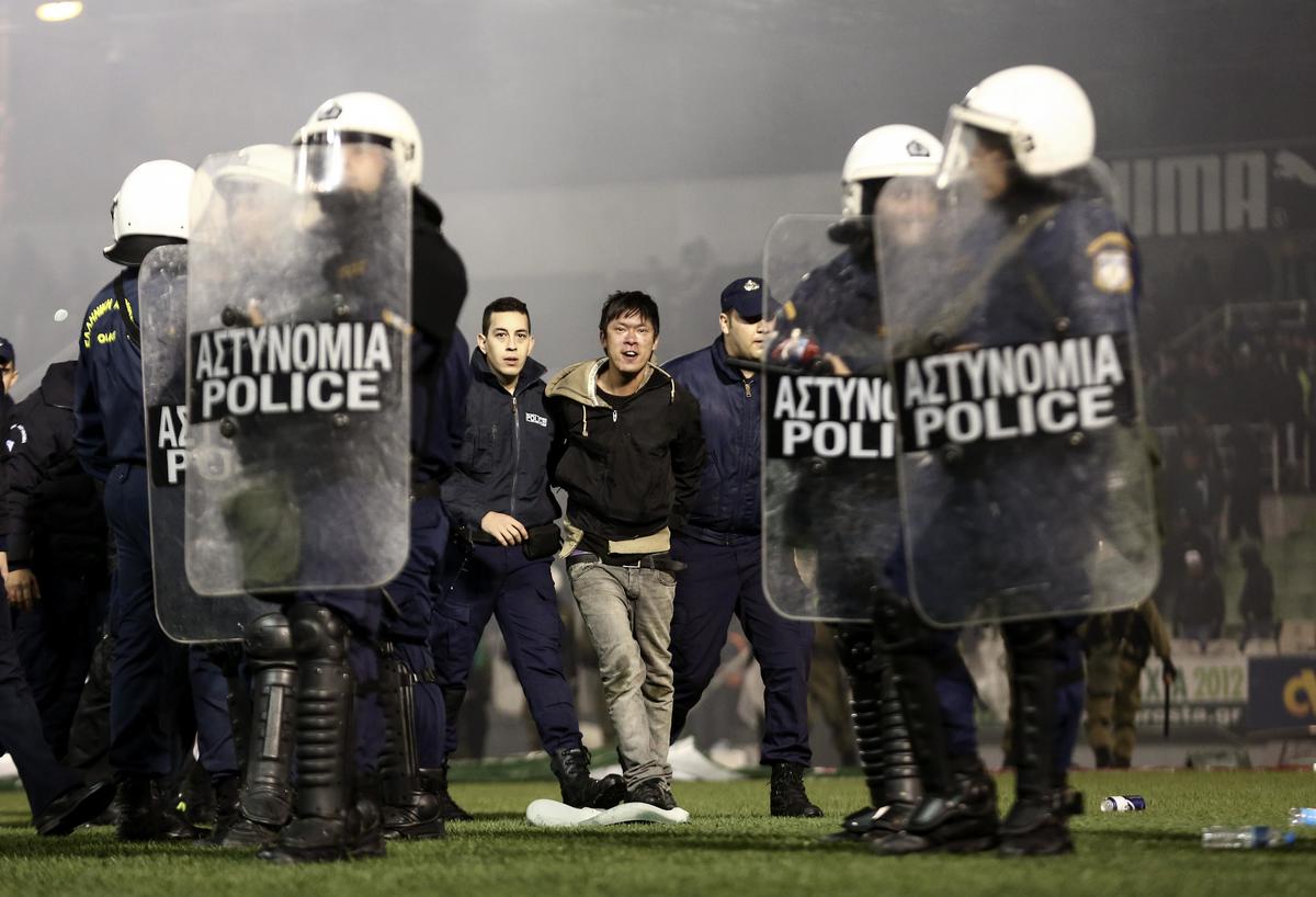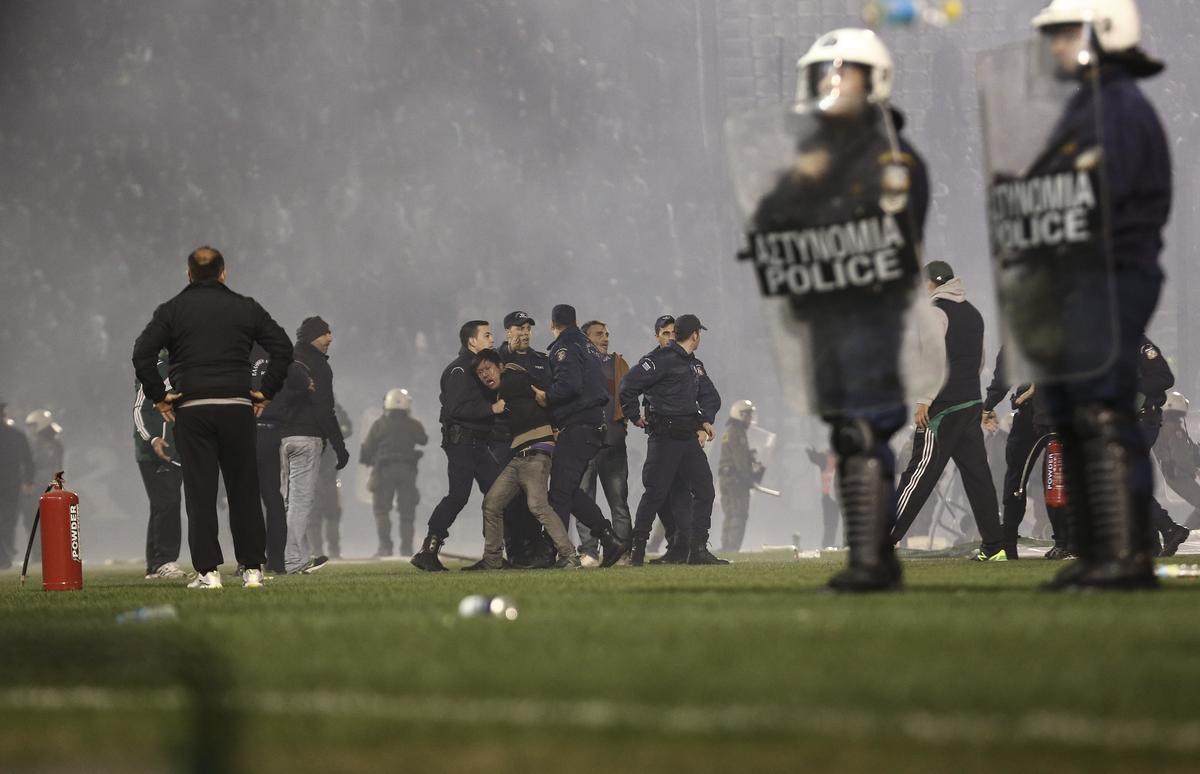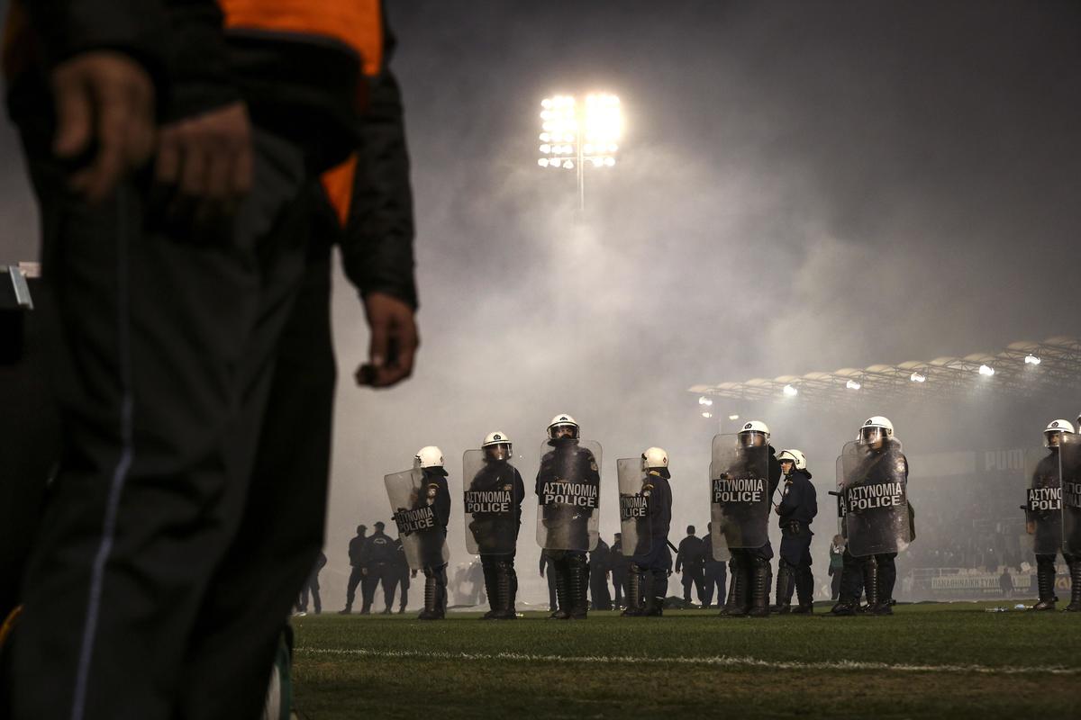 Andrea Stramaccioni dovrà aspettare per l'esordio: scene di violenza fuori e dentro lo stadio ad Atene e salta il derby Panathinaikos-Olympiacos