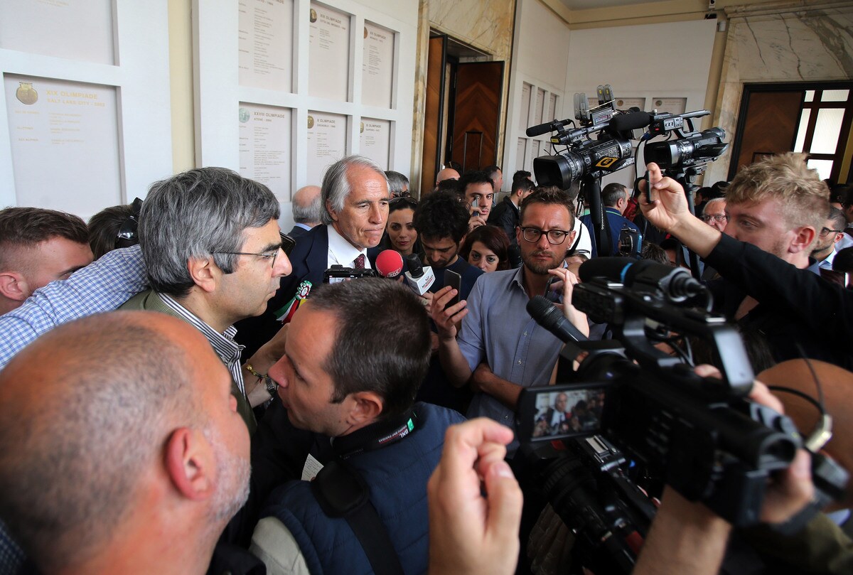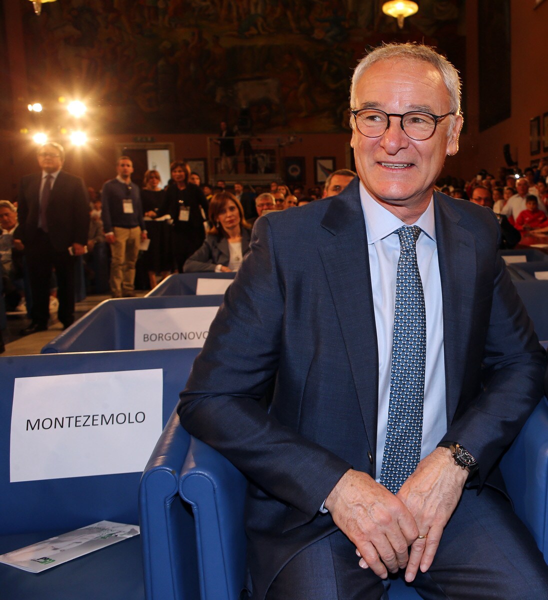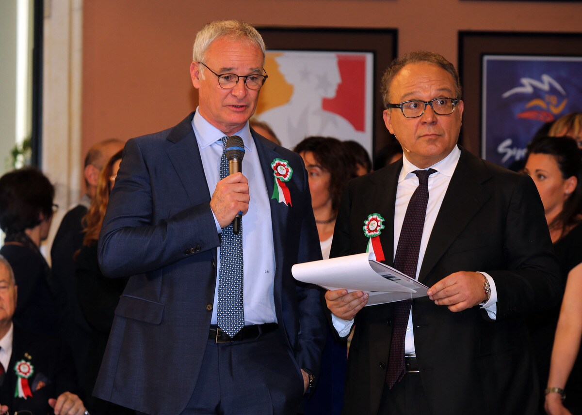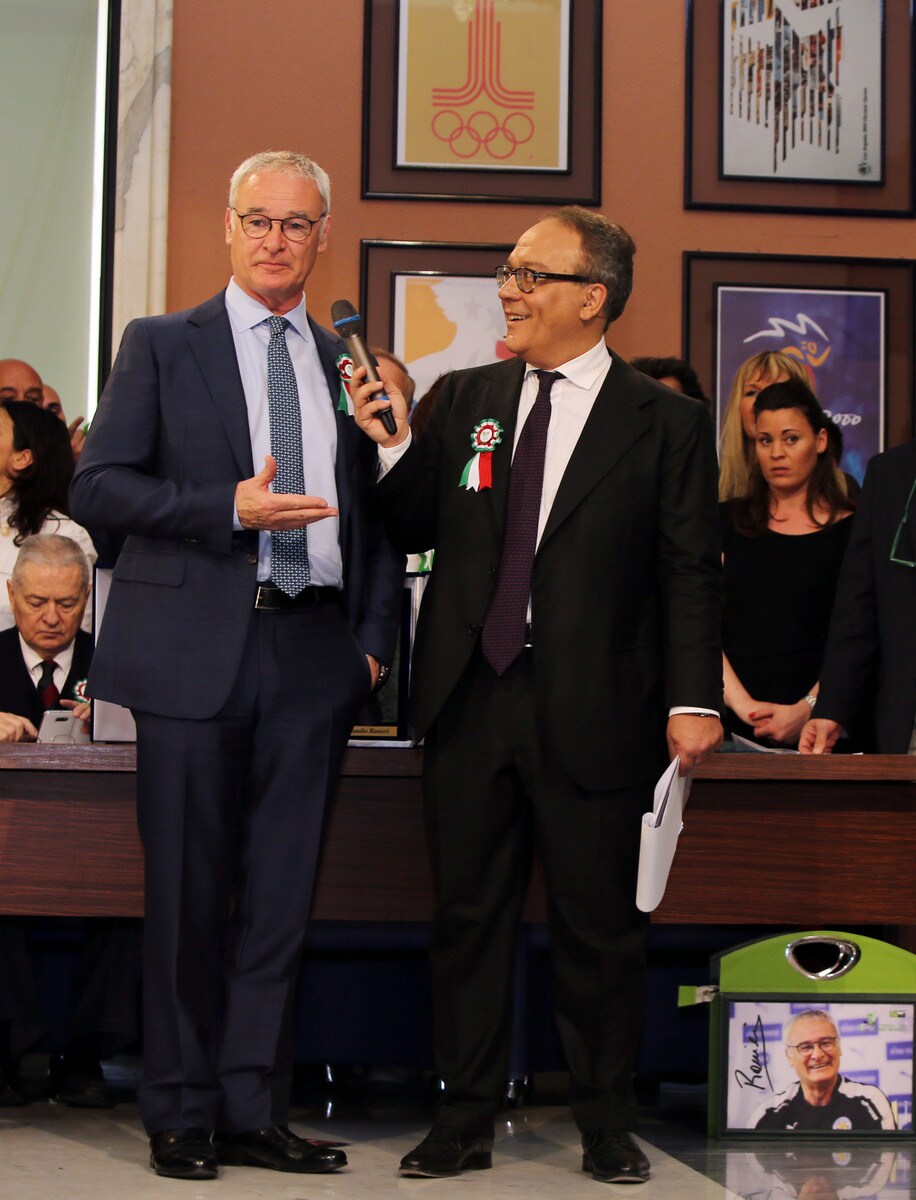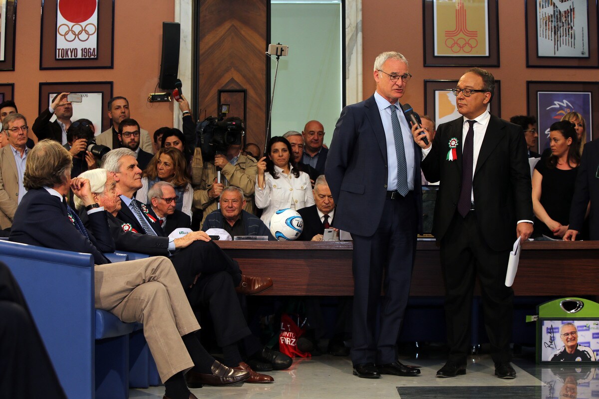 Il tecnico del Leicester accolto da tantissimi cronisti e tifosi nella sede del Coni. Al suo fianco il presidente Malagò