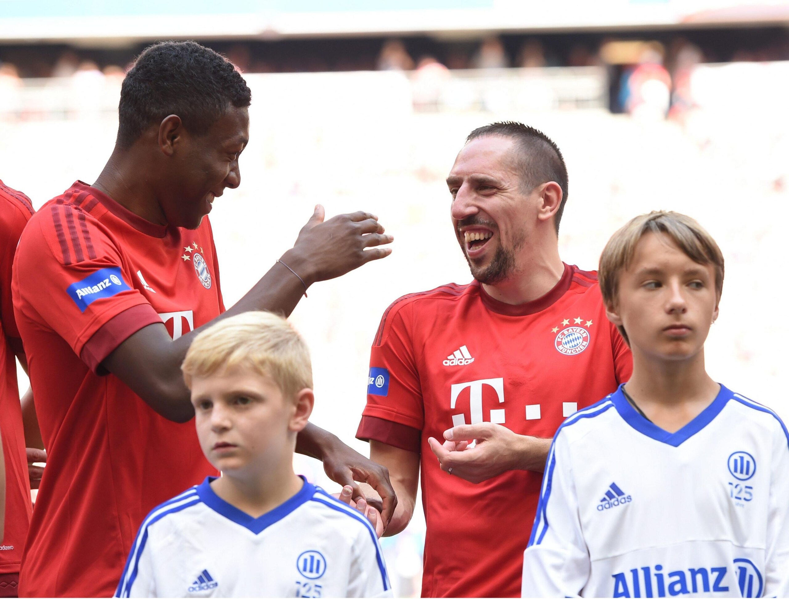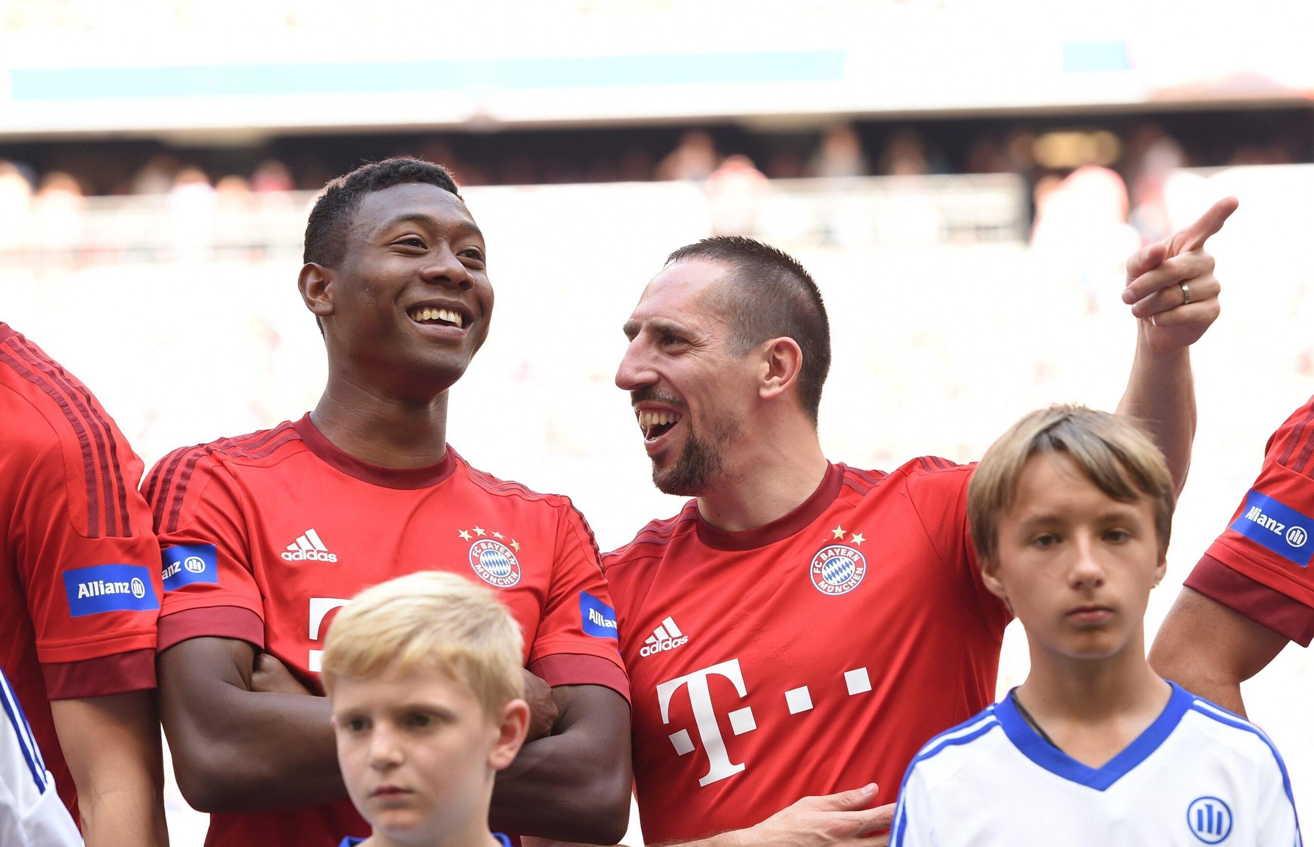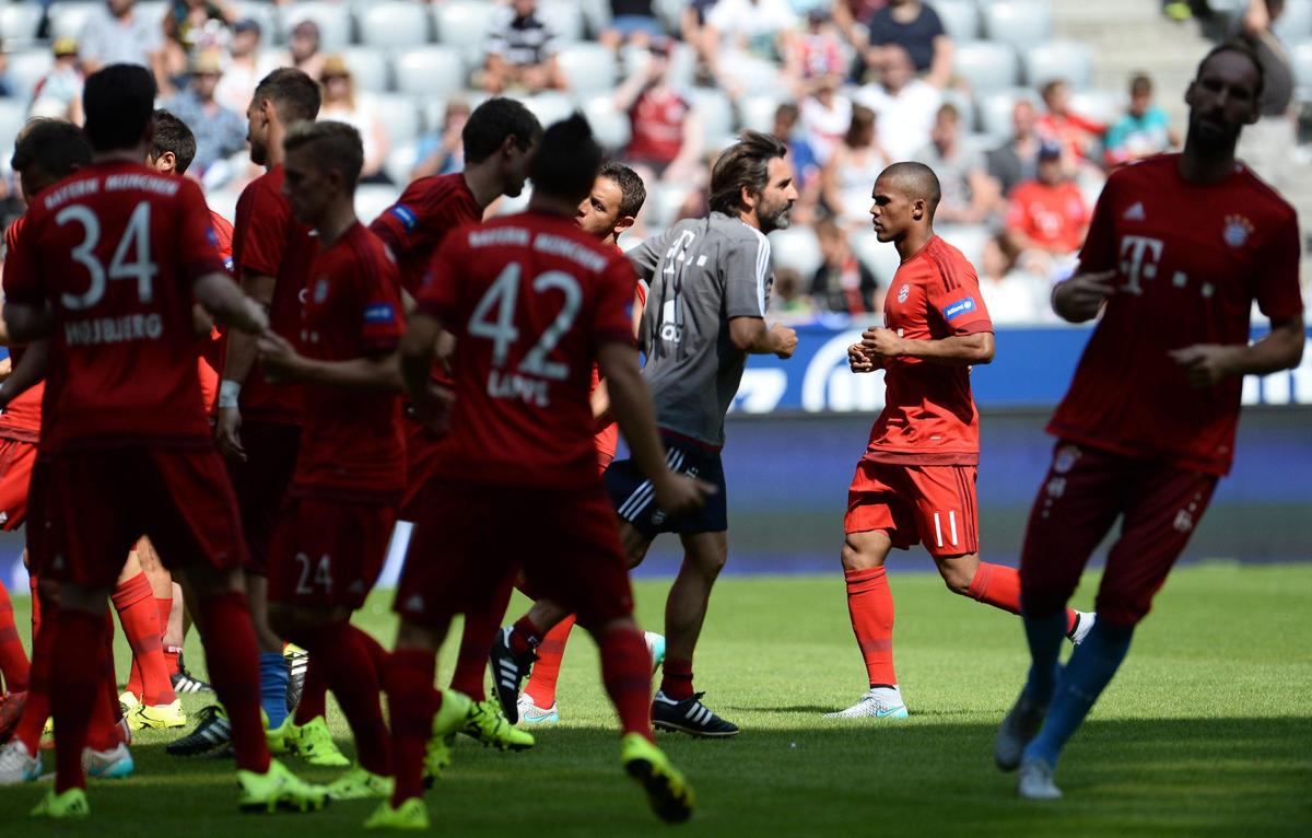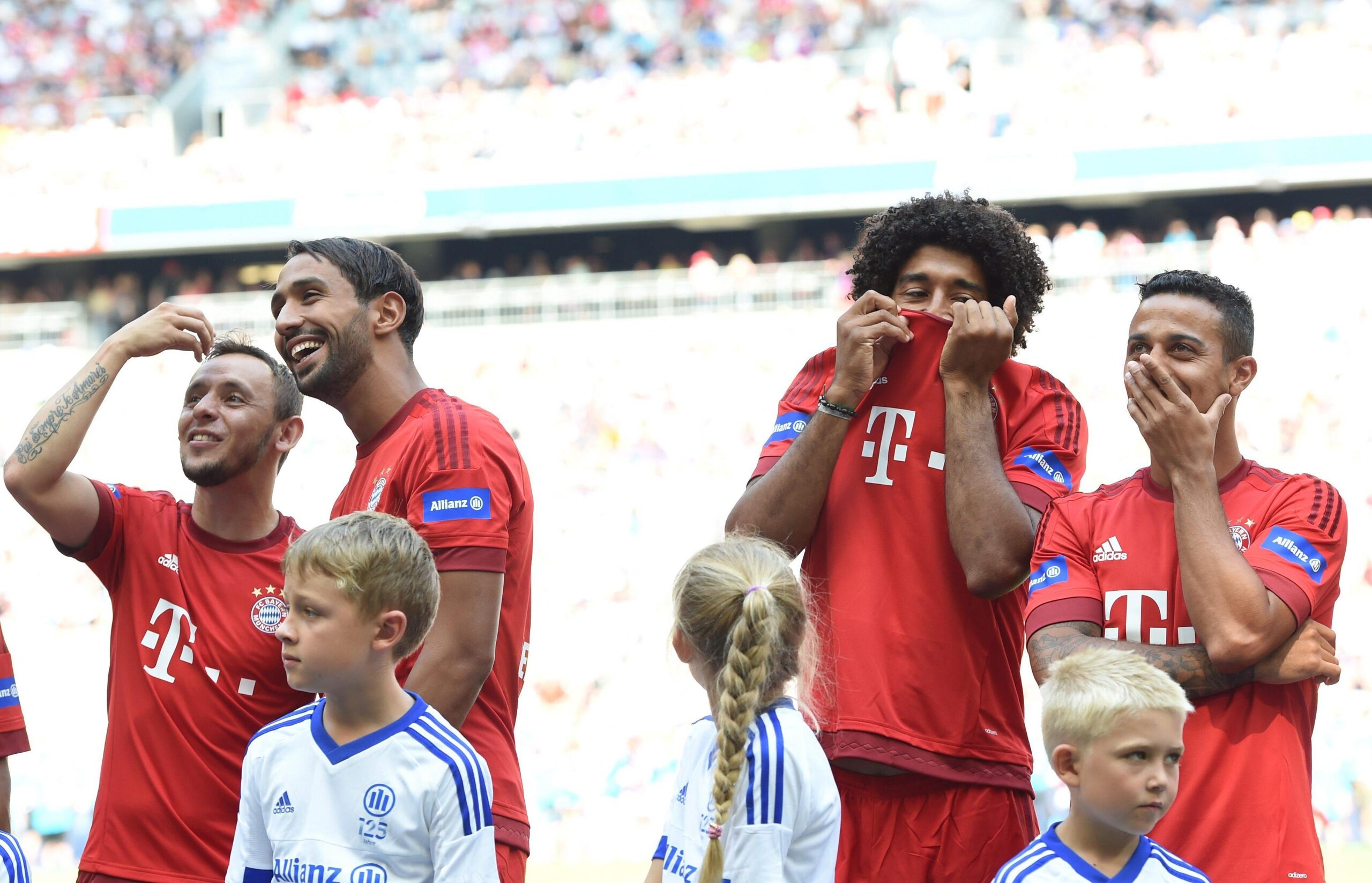 I giocatori del Bayern Monaco durante la presentazione della squadra all'Allianz Arena
