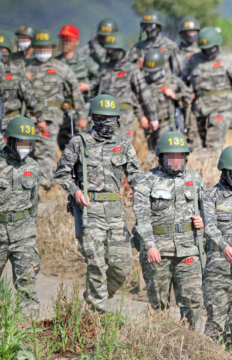 L'attaccante degli Spurs con fucile ed elmetto in un campo di addestramento in Corea del Sud