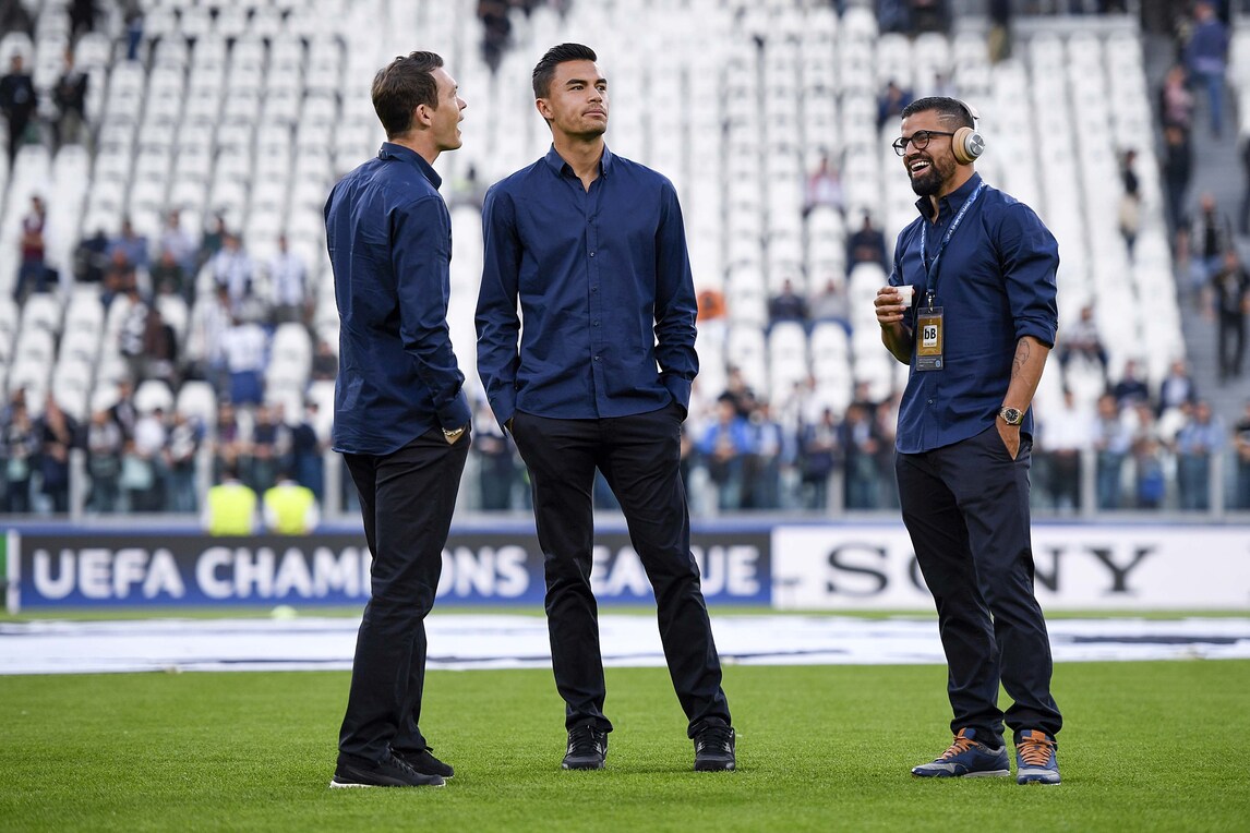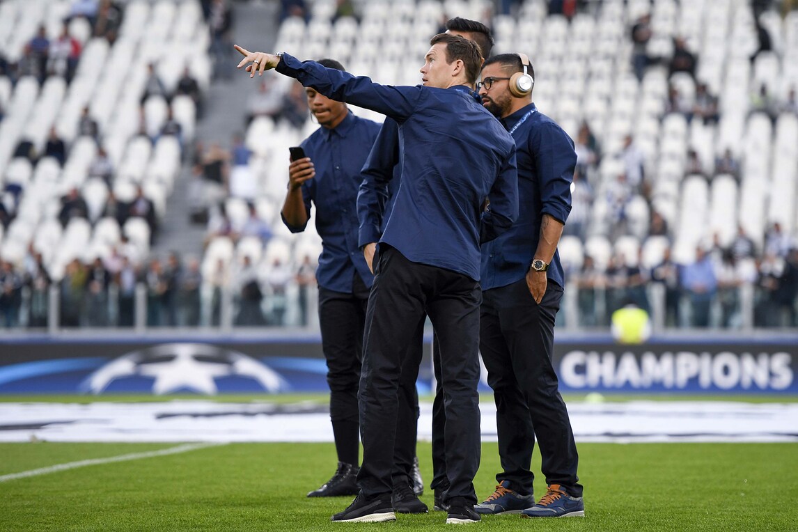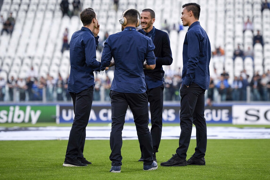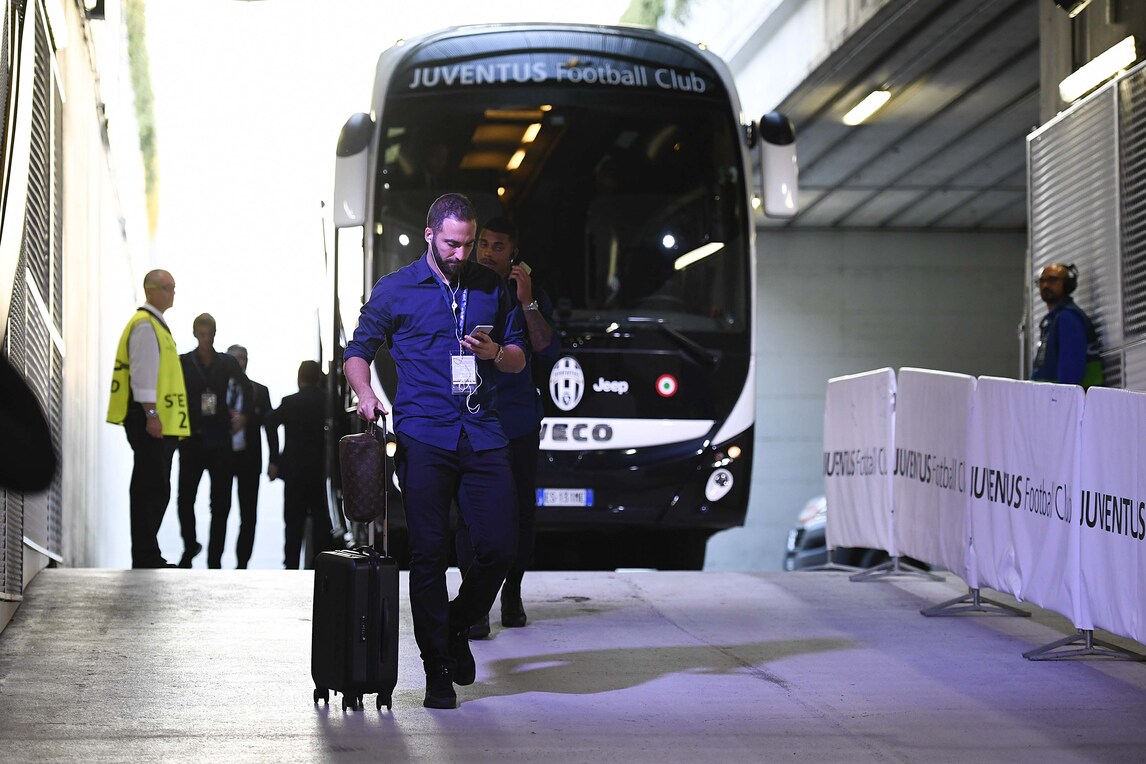 L'arrivo della squadra di Allegri allo stadio in vista del big match con il Barcellona: Bonucci sorride, Higuain distratto dallo smartphone