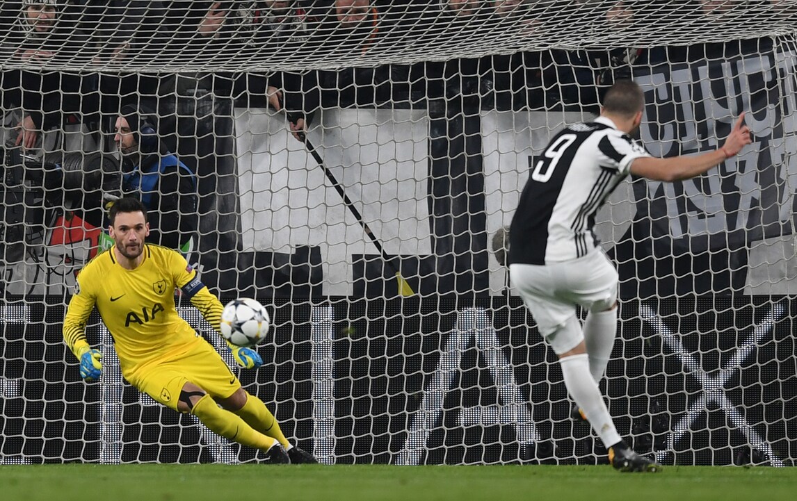 L'attaccante della Juventus trasforma il calcio di rigore contro il Tottenham ed esulta sotto la Curva Sud
