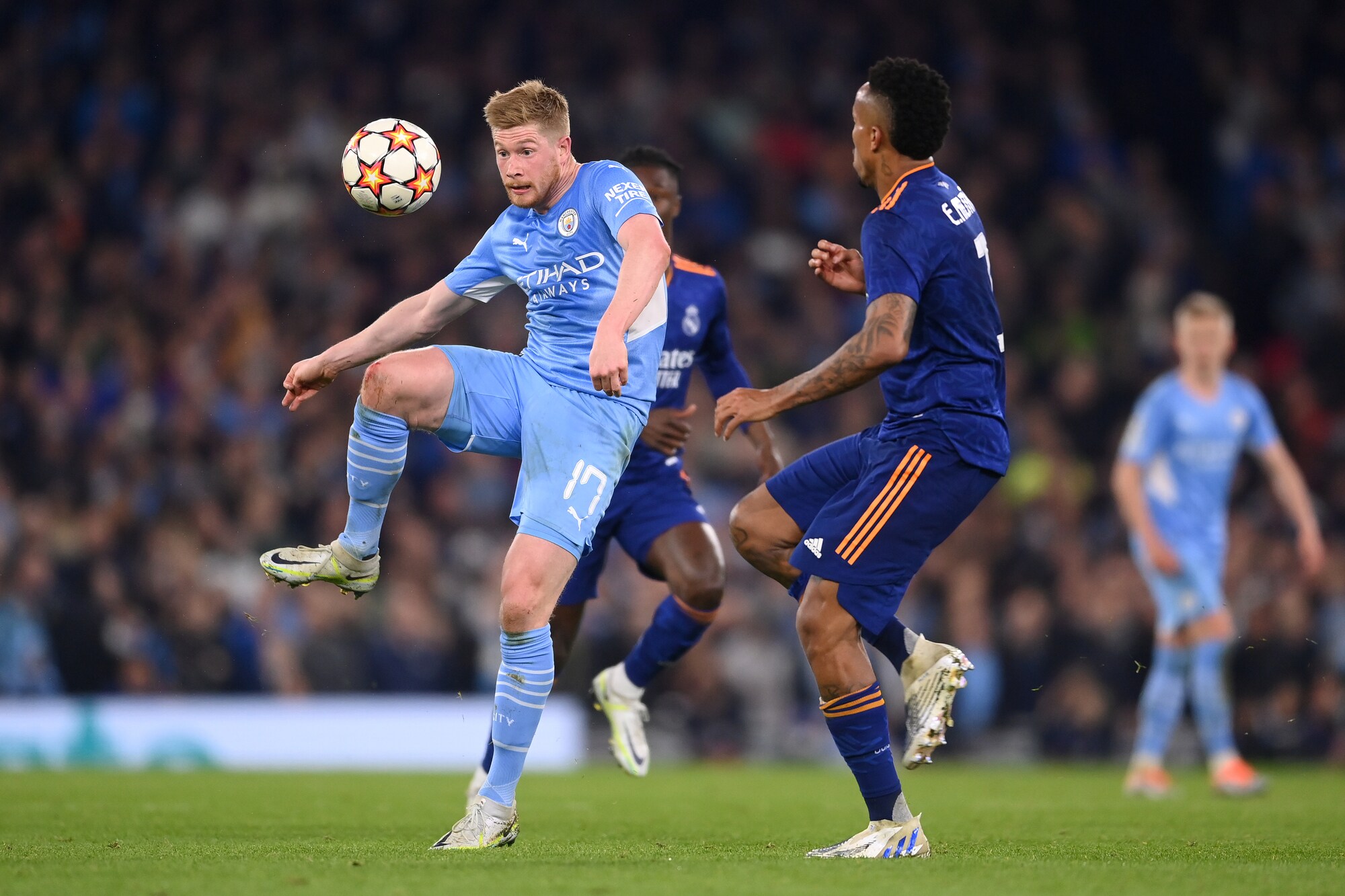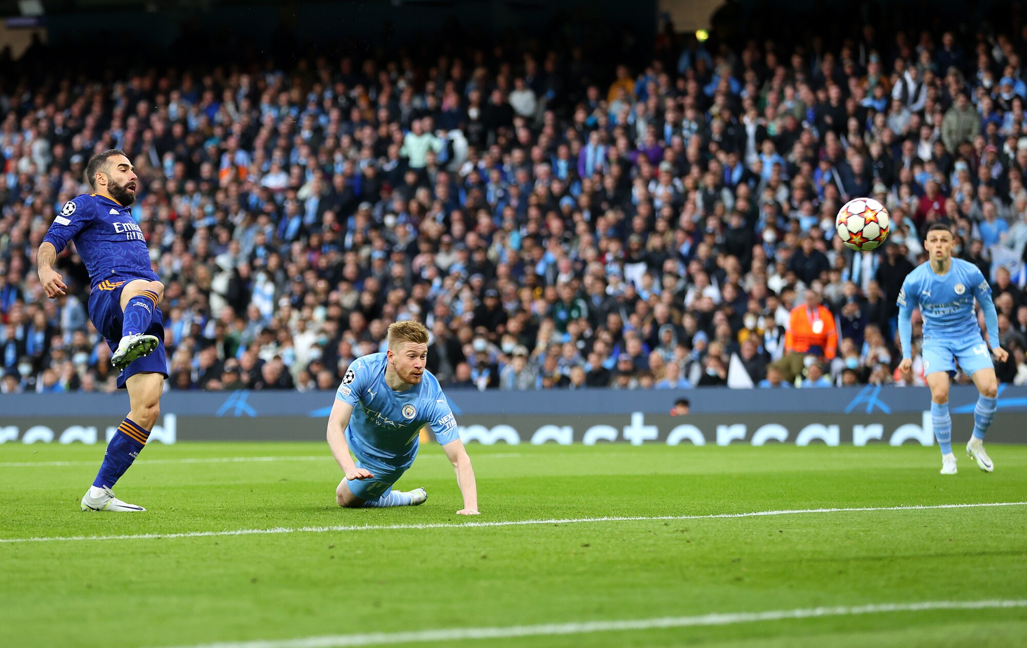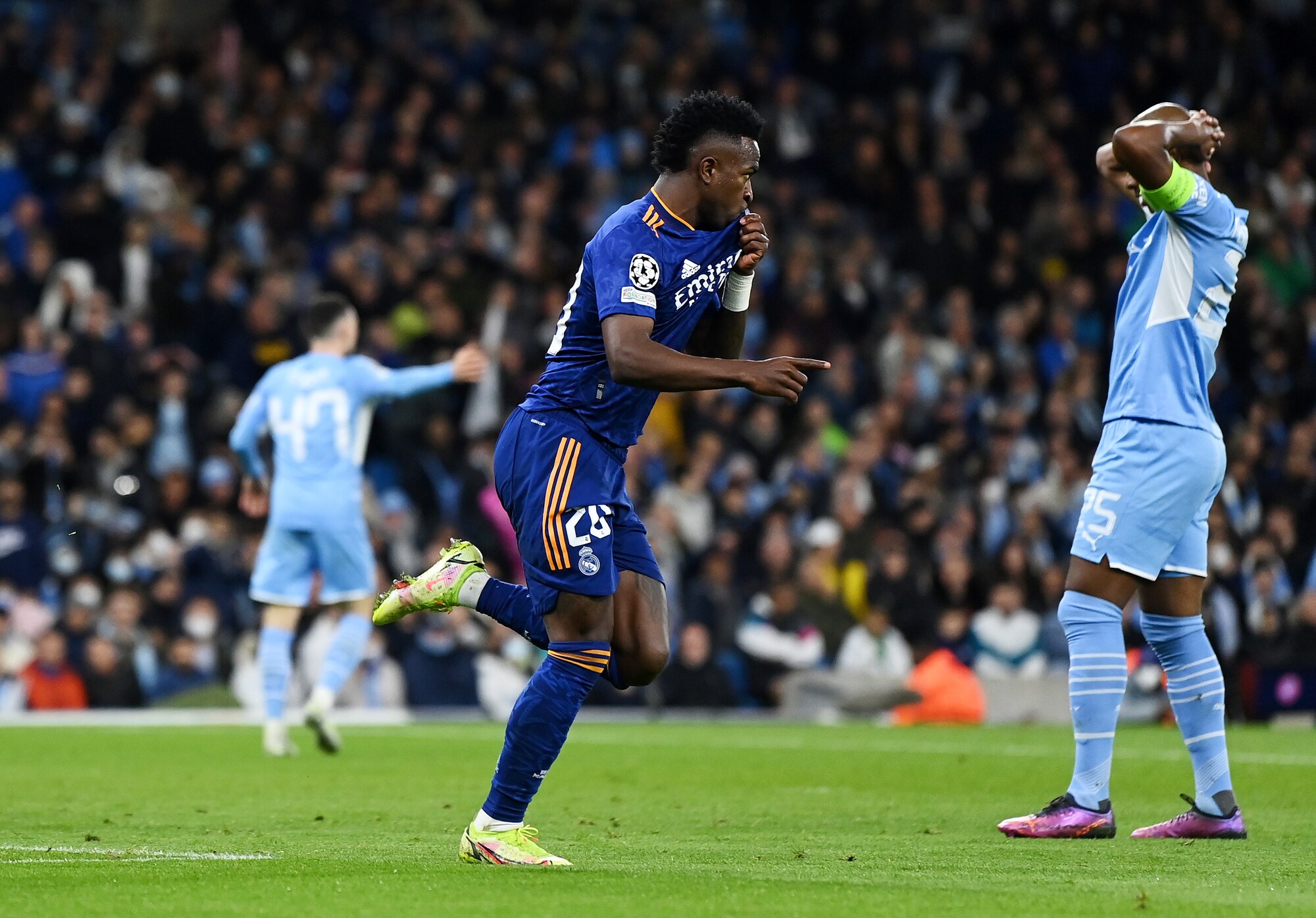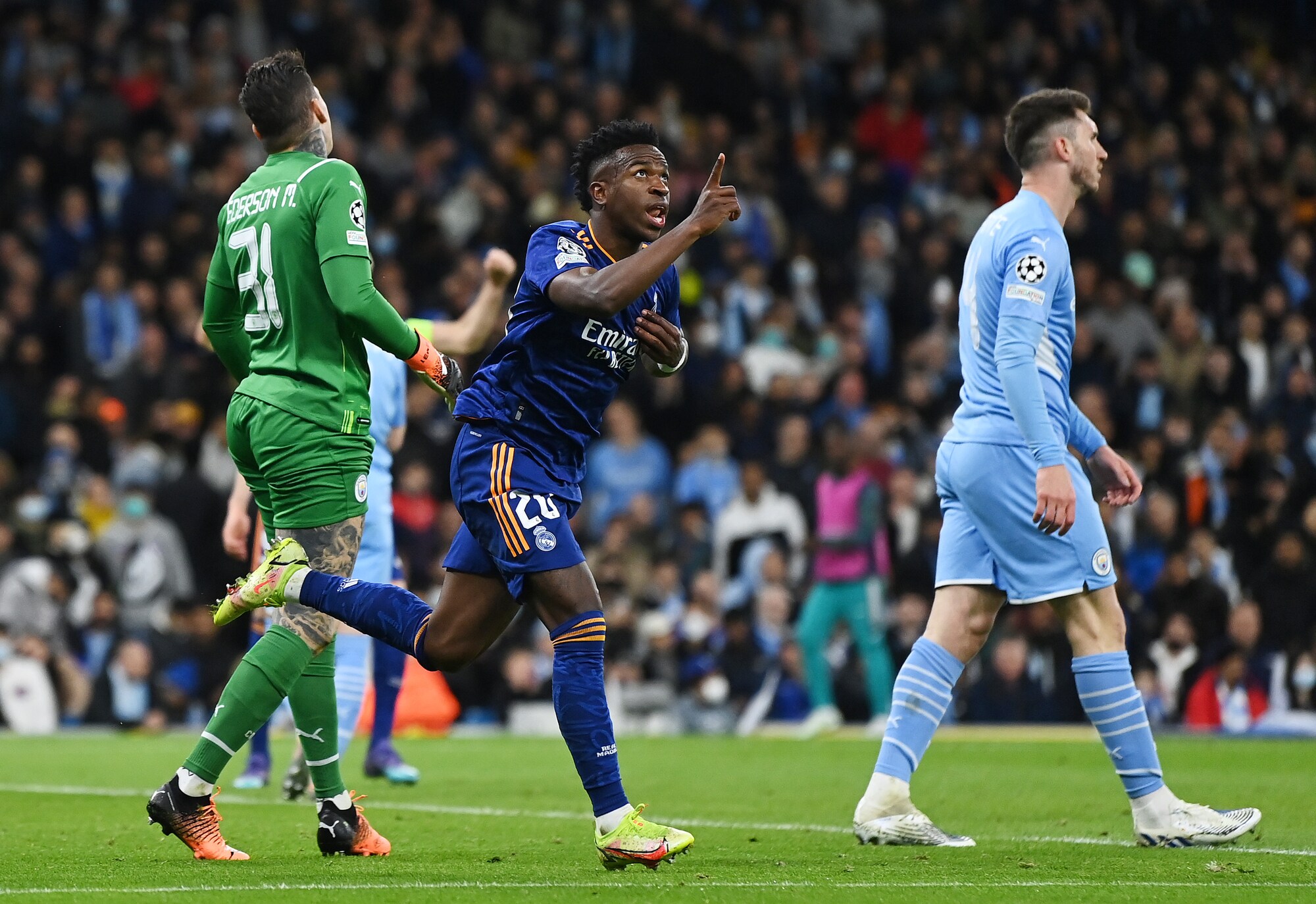 Gli inglesi superano 4-3 in Champions la squadra di Ancelotti, tenuta in vita da due magnifici gol del francese: a segno anche De Bruyne, Jesus, Foden, Silva e Vinicius