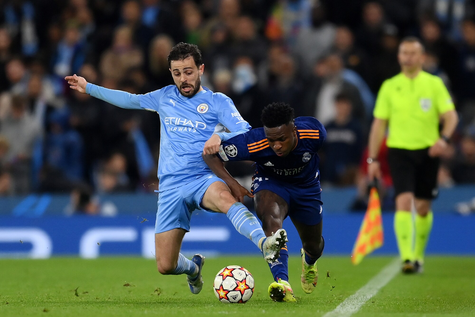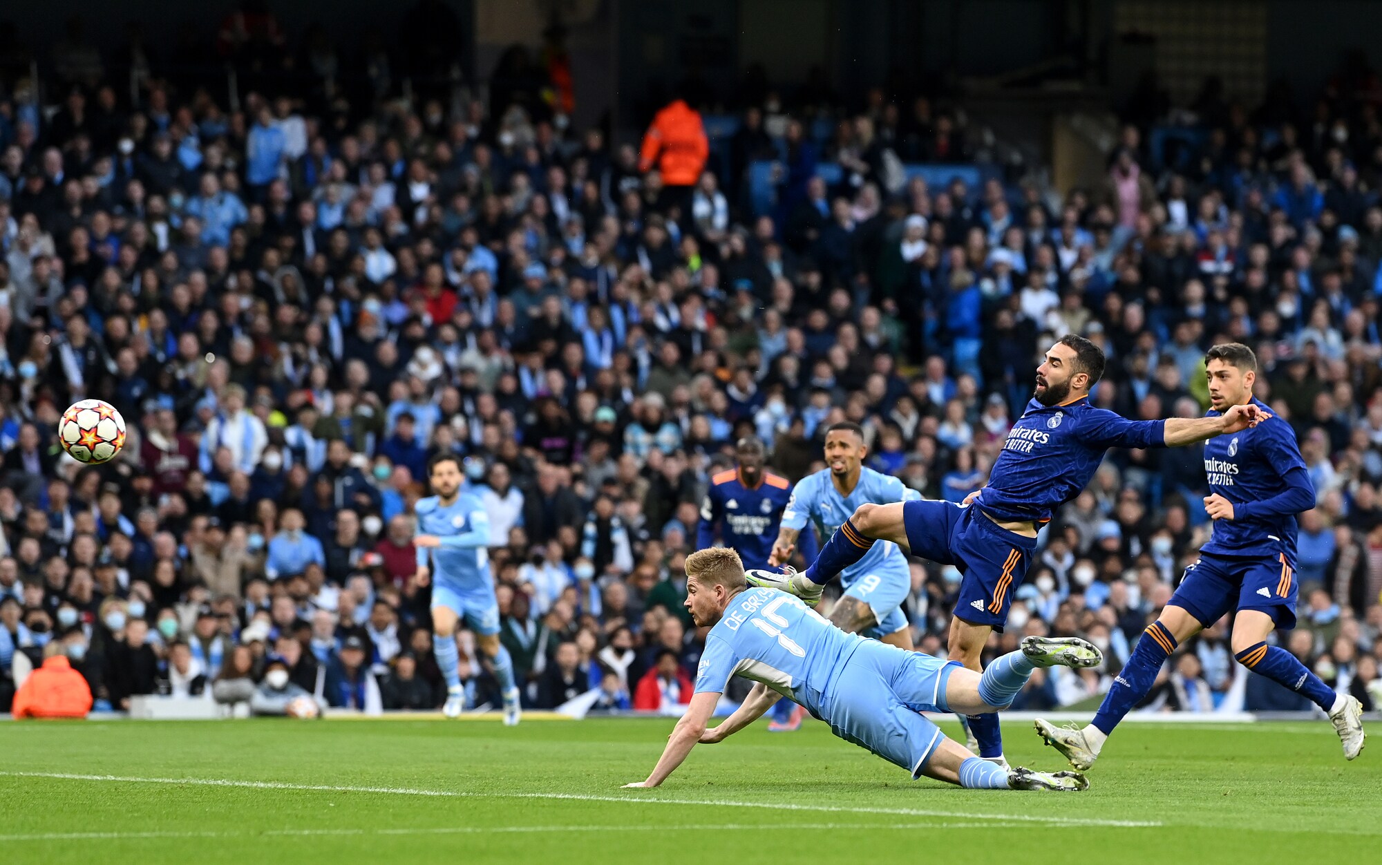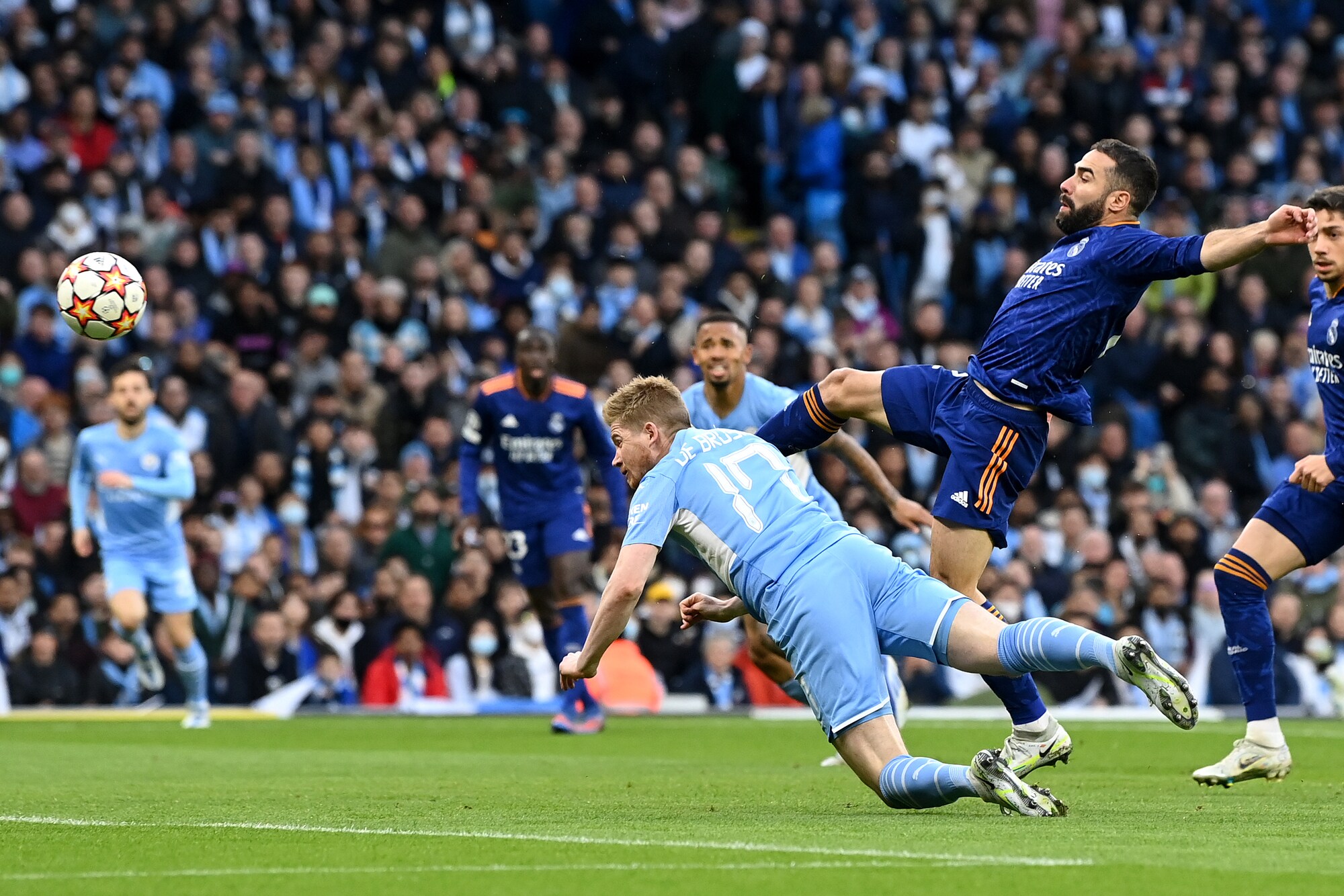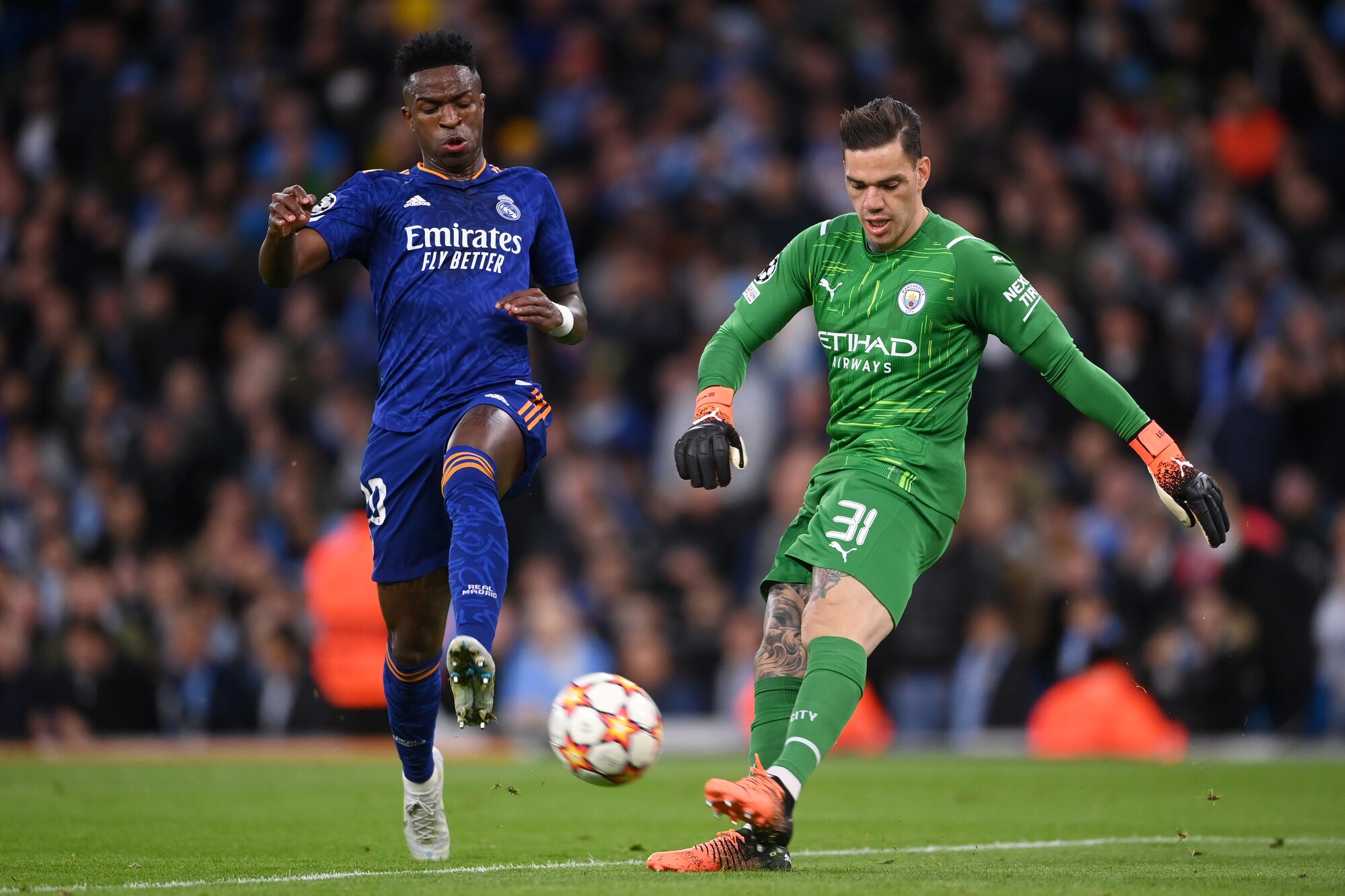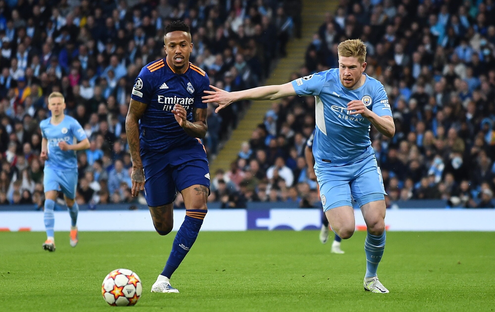Gli inglesi superano 4-3 in Champions la squadra di Ancelotti, tenuta in vita da due magnifici gol del francese: a segno anche De Bruyne, Jesus, Foden, Silva e Vinicius