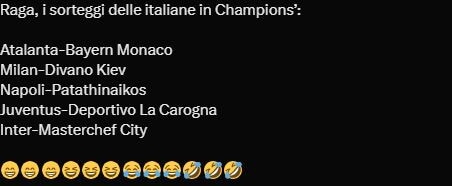 Dalla 'disperazione' per il derby italiano in Europa all' Atalanta unica in Champions: i social si scatenano dopo i sorteggi