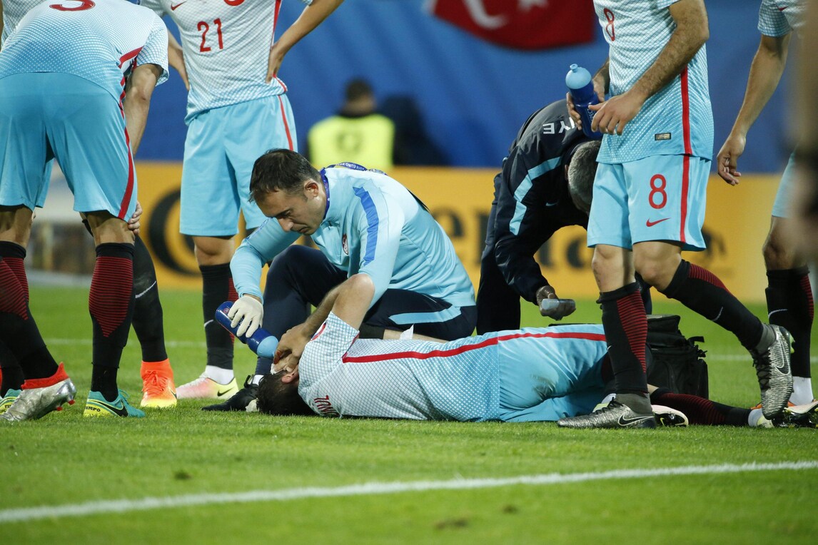 Il difensore turco, ferito alla testa dopo un contrasto di gioco con Sivok in area di rigore a Lens, viene subito medicato