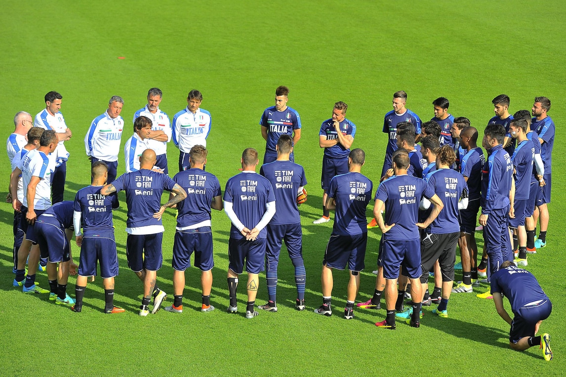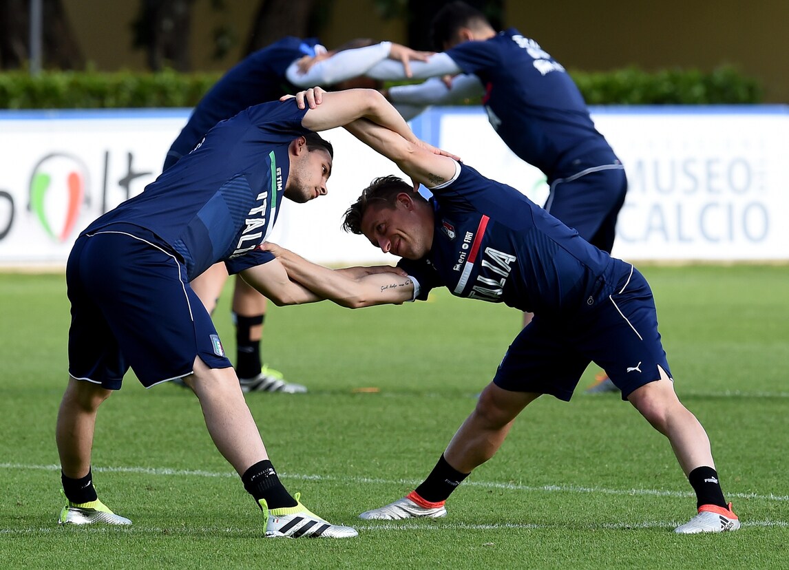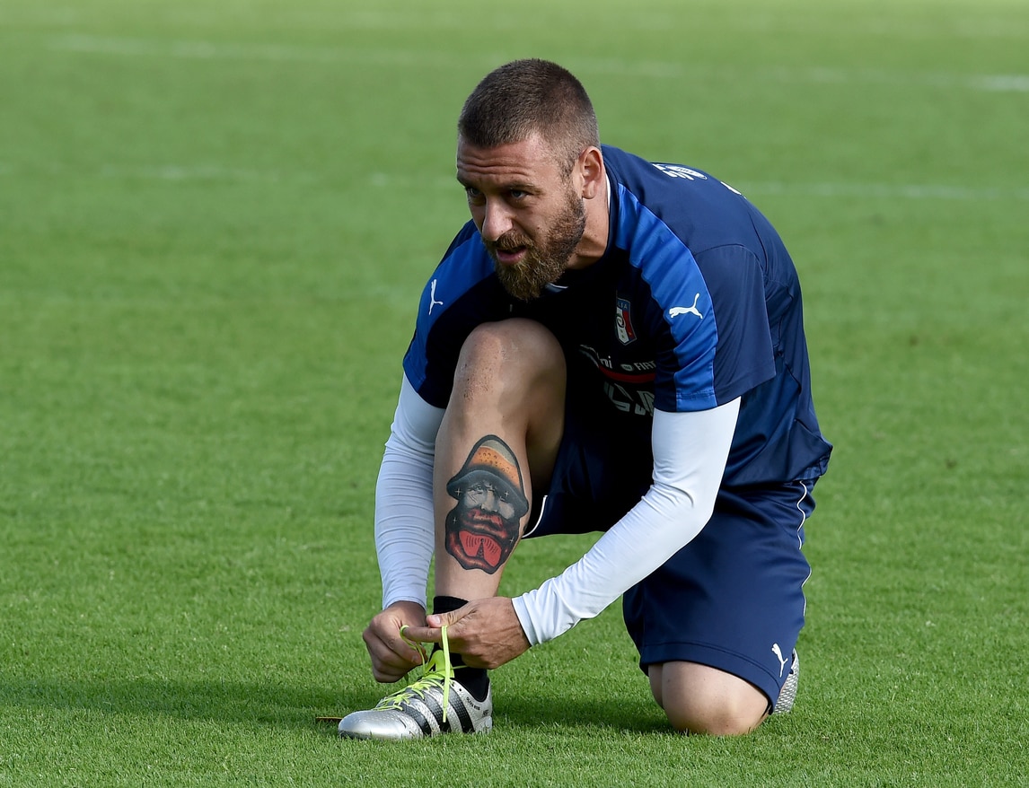 Il giocatore della Roma in allenamento a Coverciano allaccia le scarpette e mostra il tatuaggio, non proprio sobrio, sul polpaccio