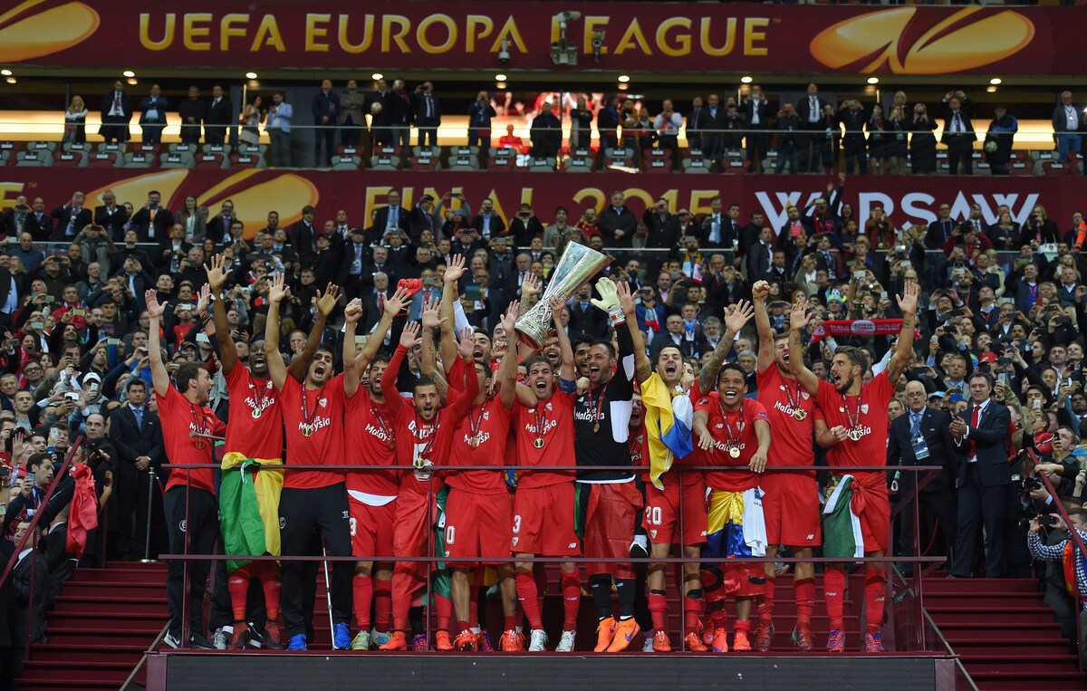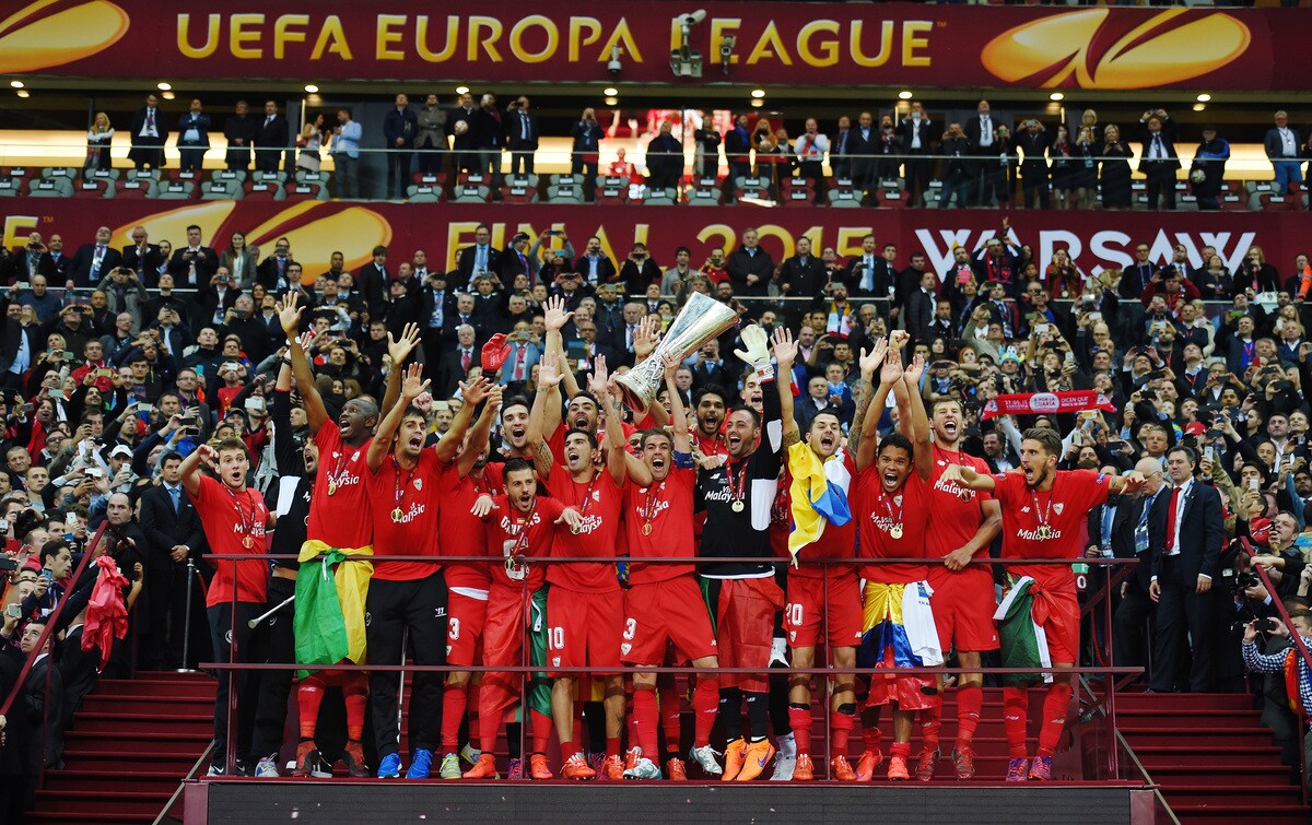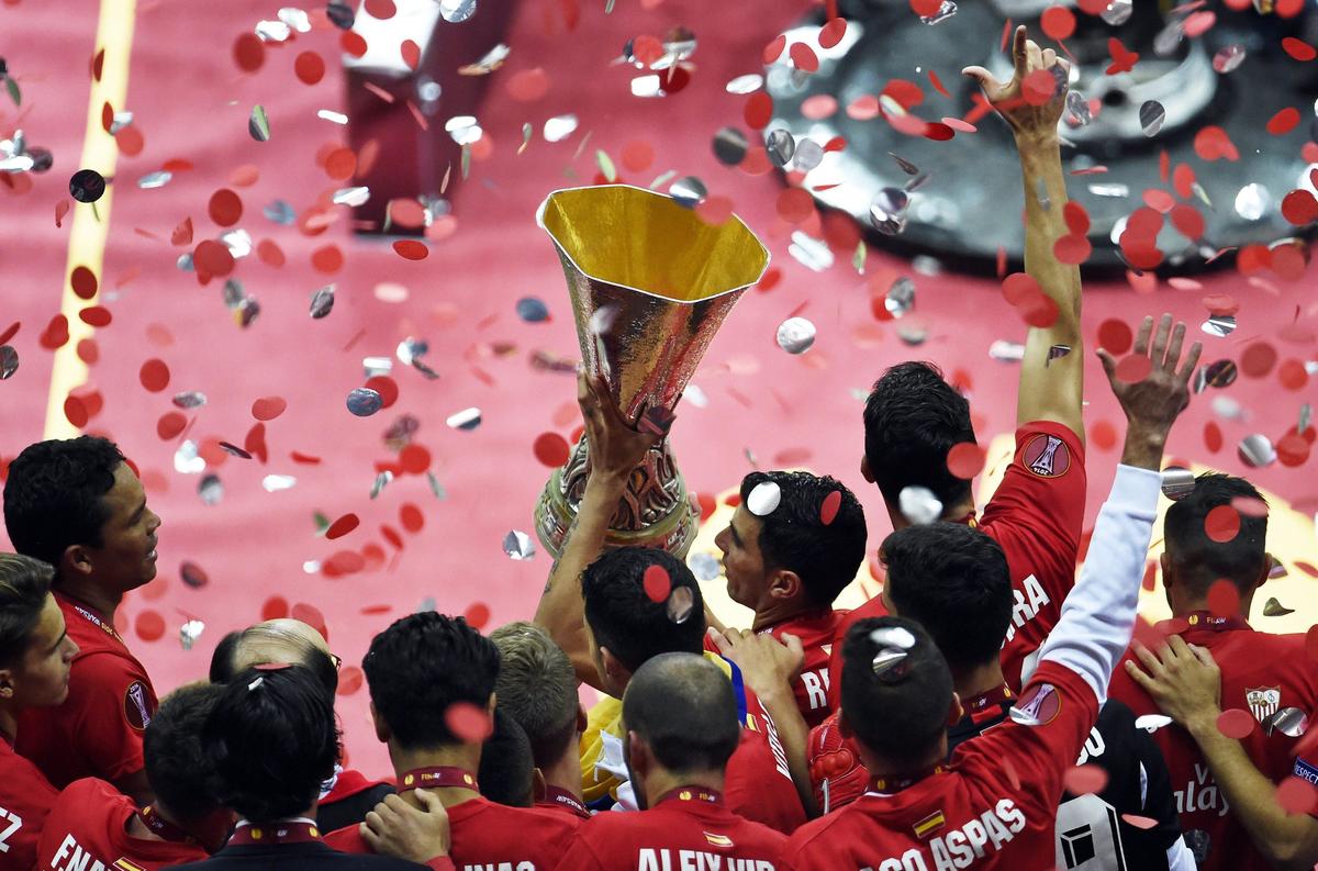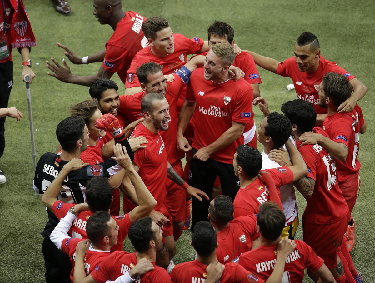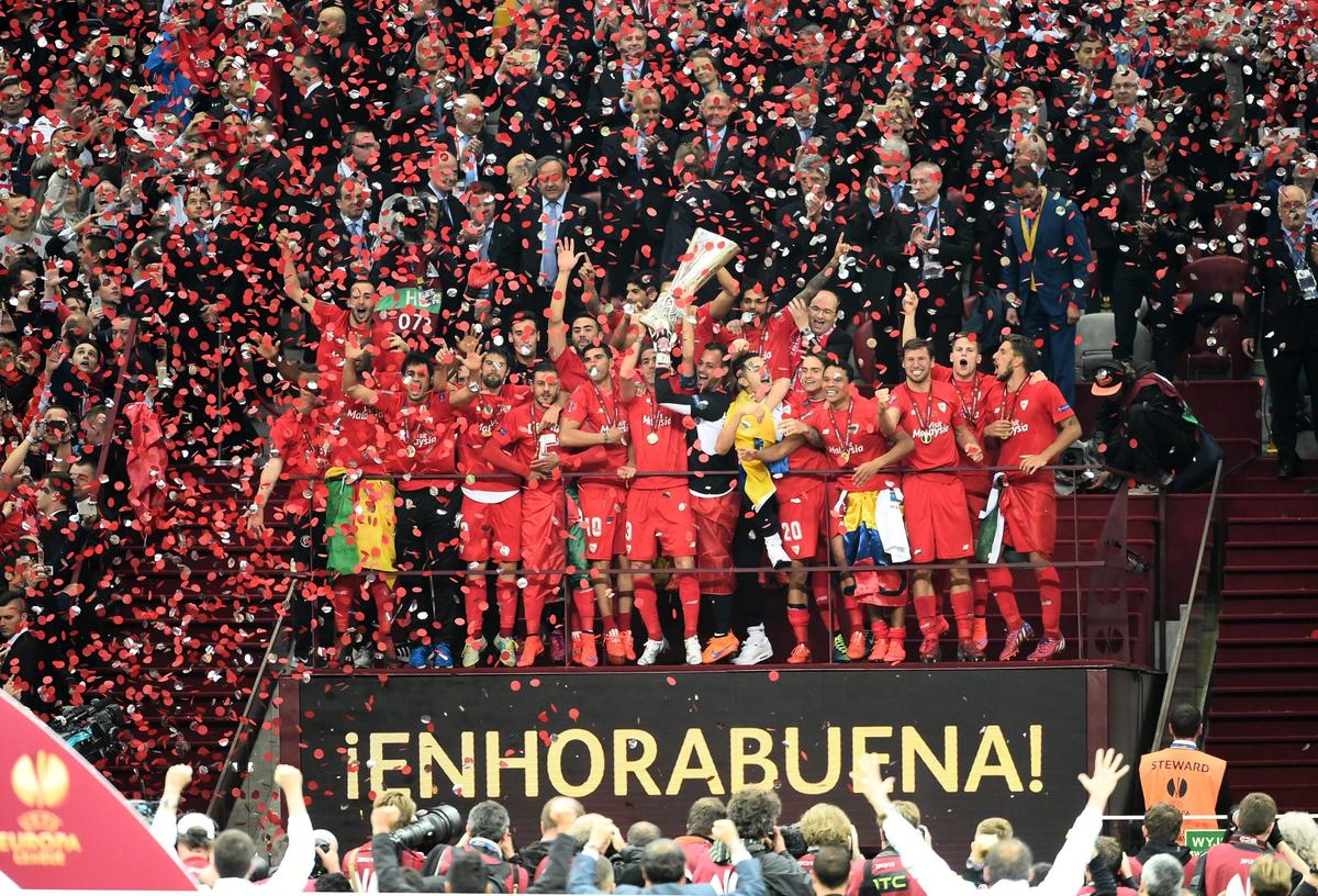 I giocatori del Siviglia festeggiano in campo a Varsavia la vittoria dell'Europa League