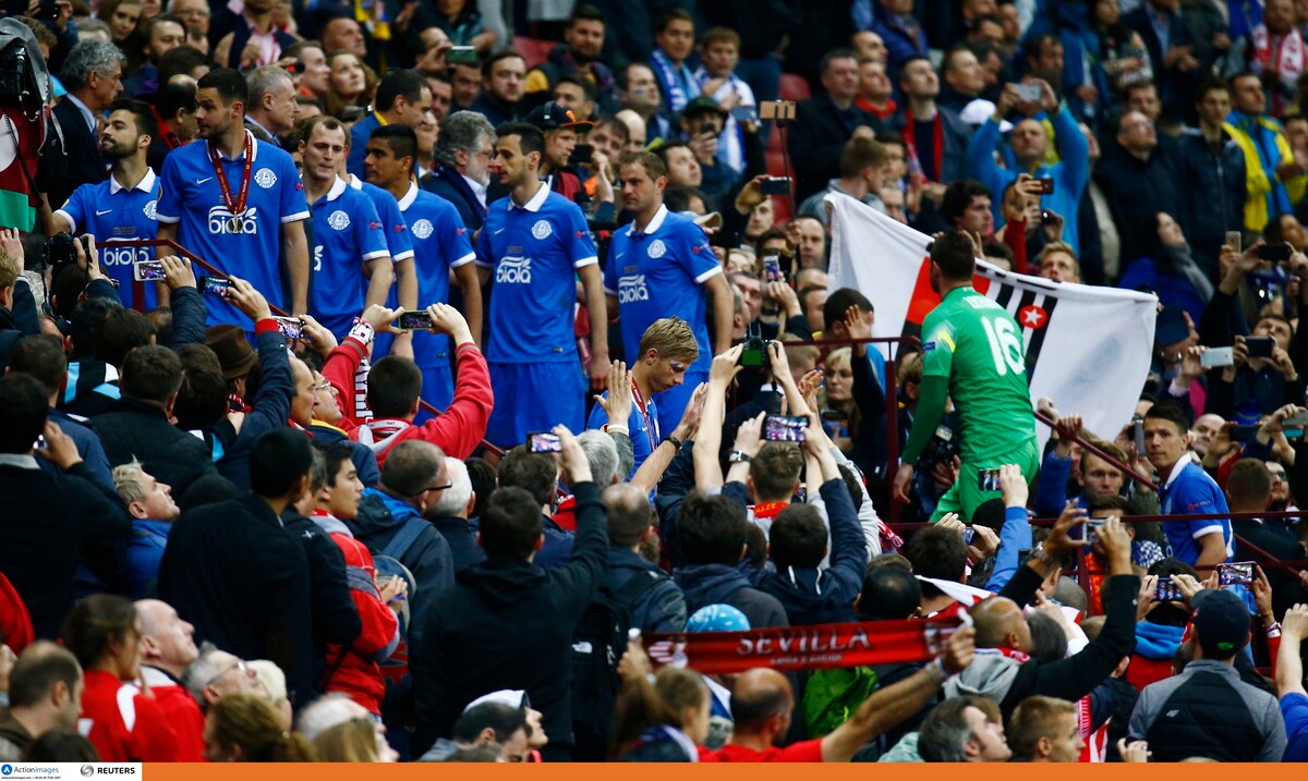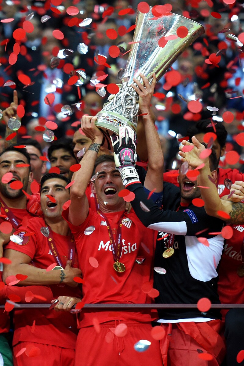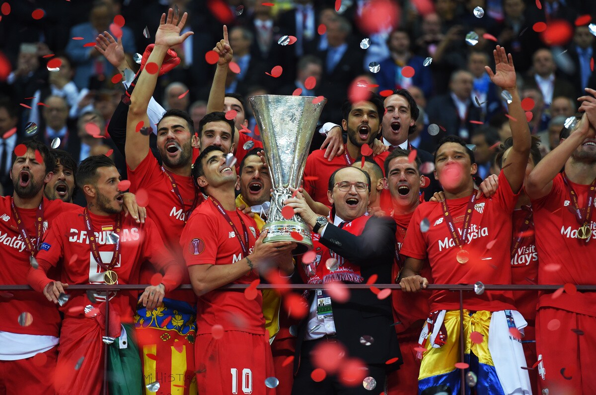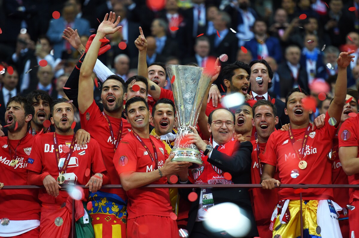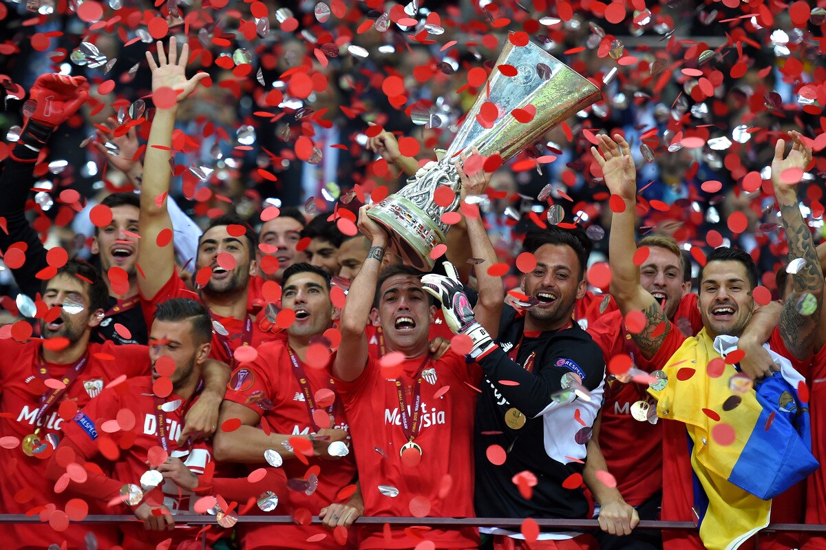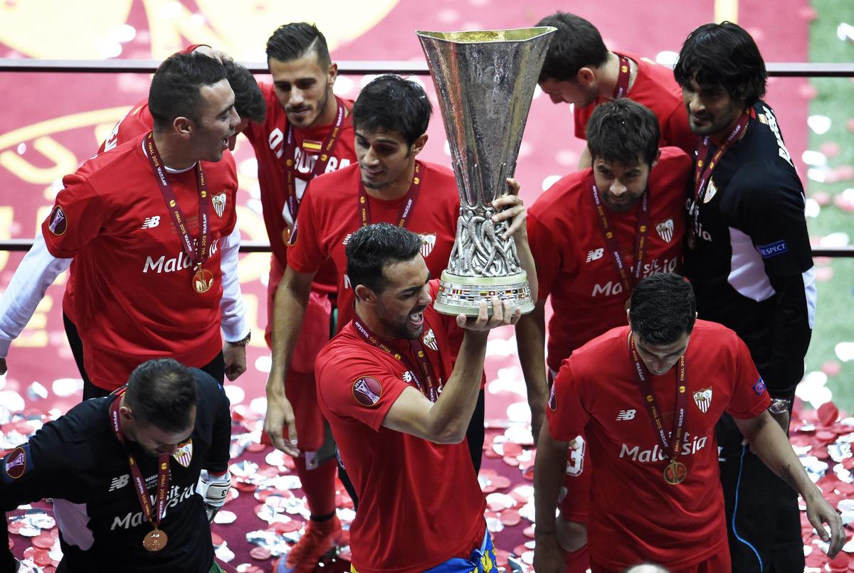 I giocatori del Siviglia festeggiano in campo a Varsavia la vittoria dell'Europa League