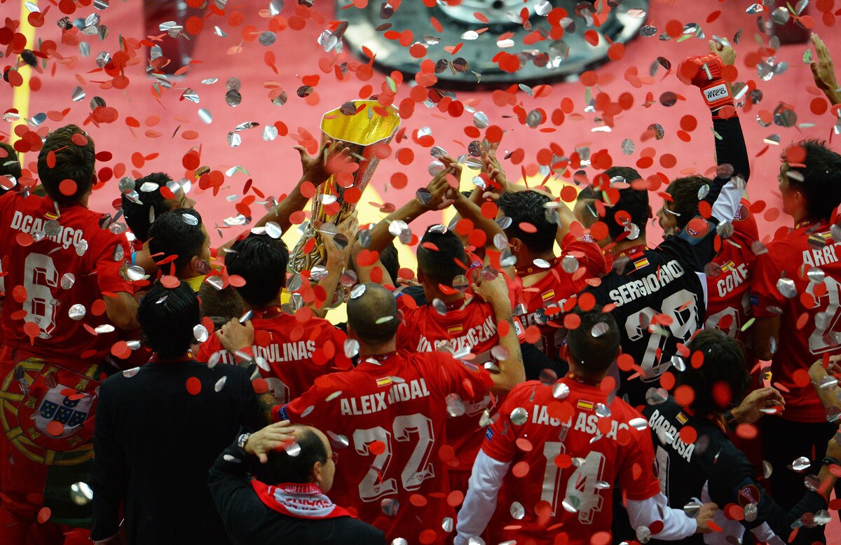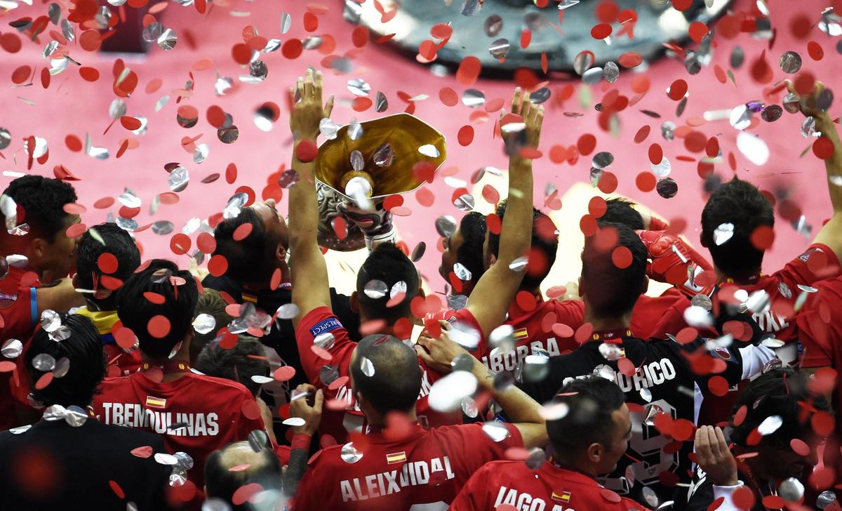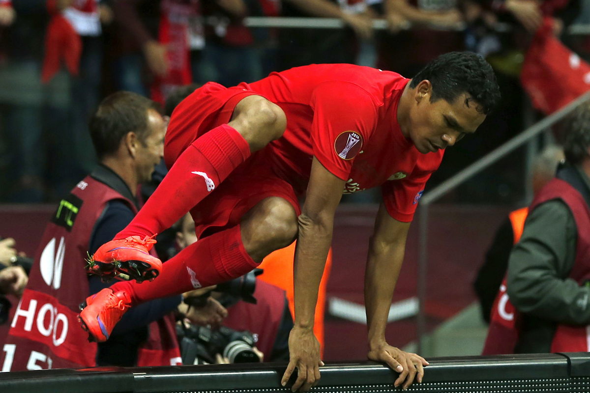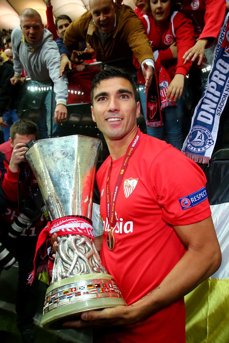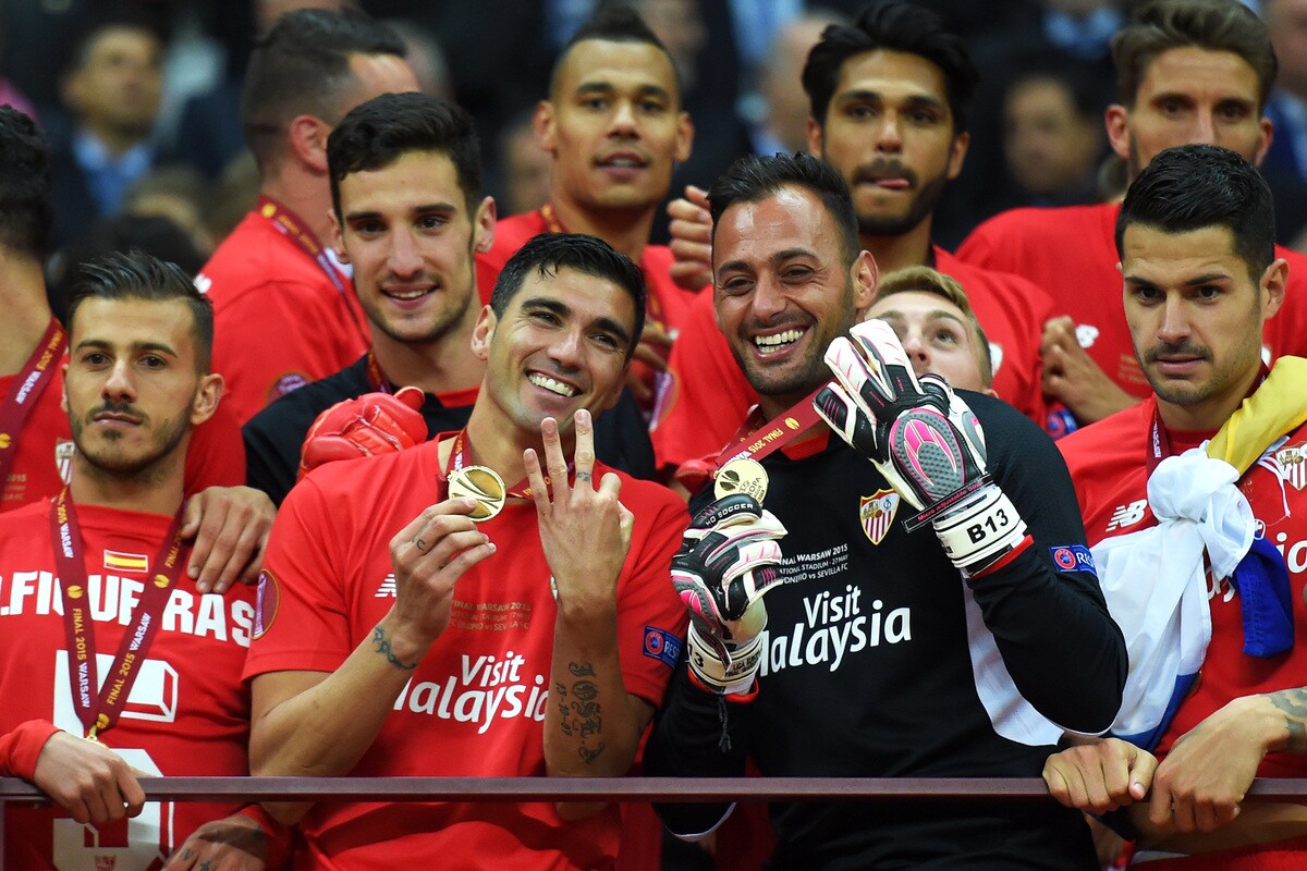 I giocatori del Siviglia festeggiano in campo a Varsavia la vittoria dell'Europa League