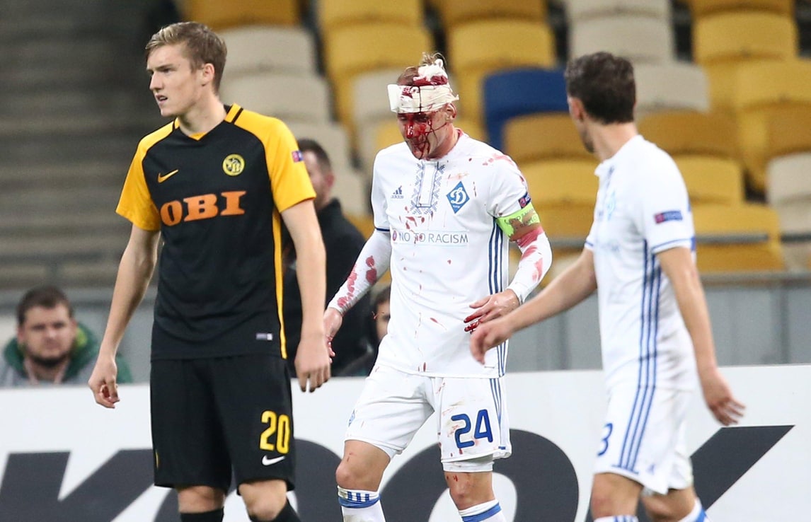 Il calciatore della Dinamo Kiev ricoperto di sangue dopo un terribile scontro di gioco con un avversario durante il match di Europa League terminato per 2-2
