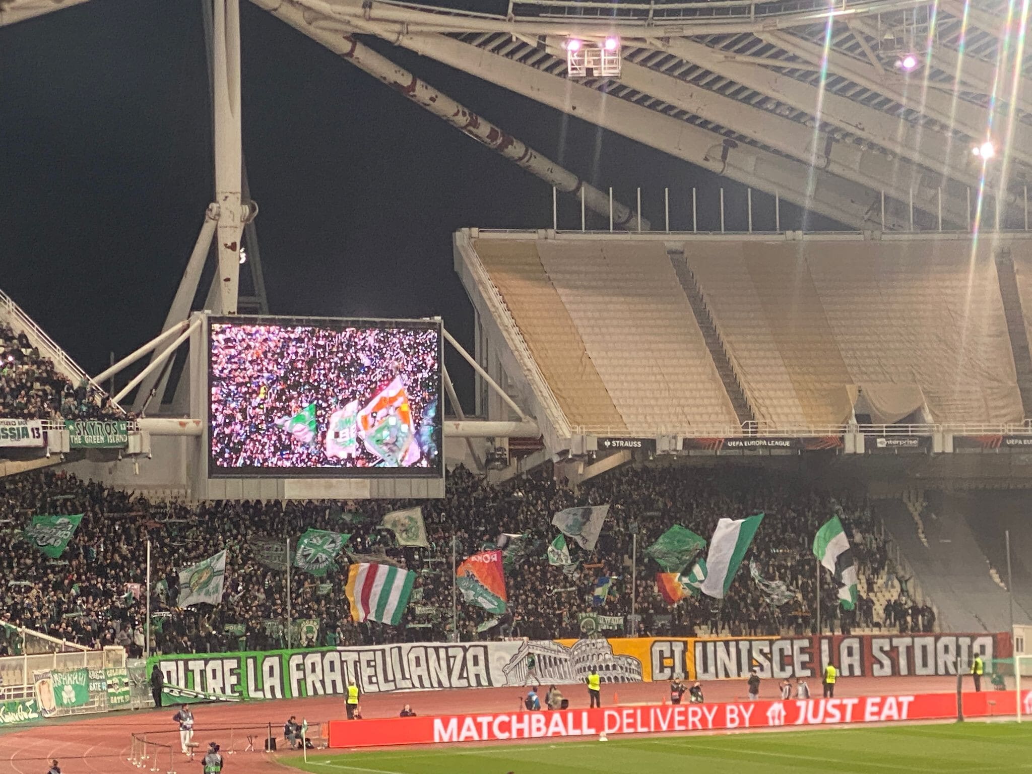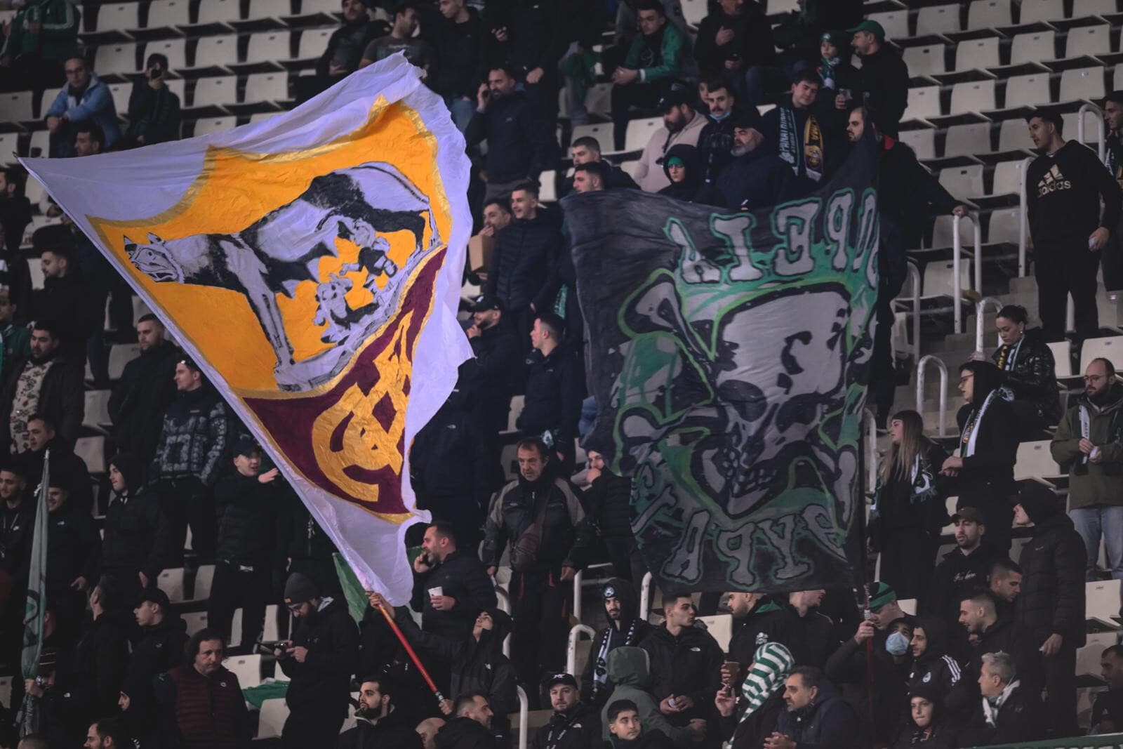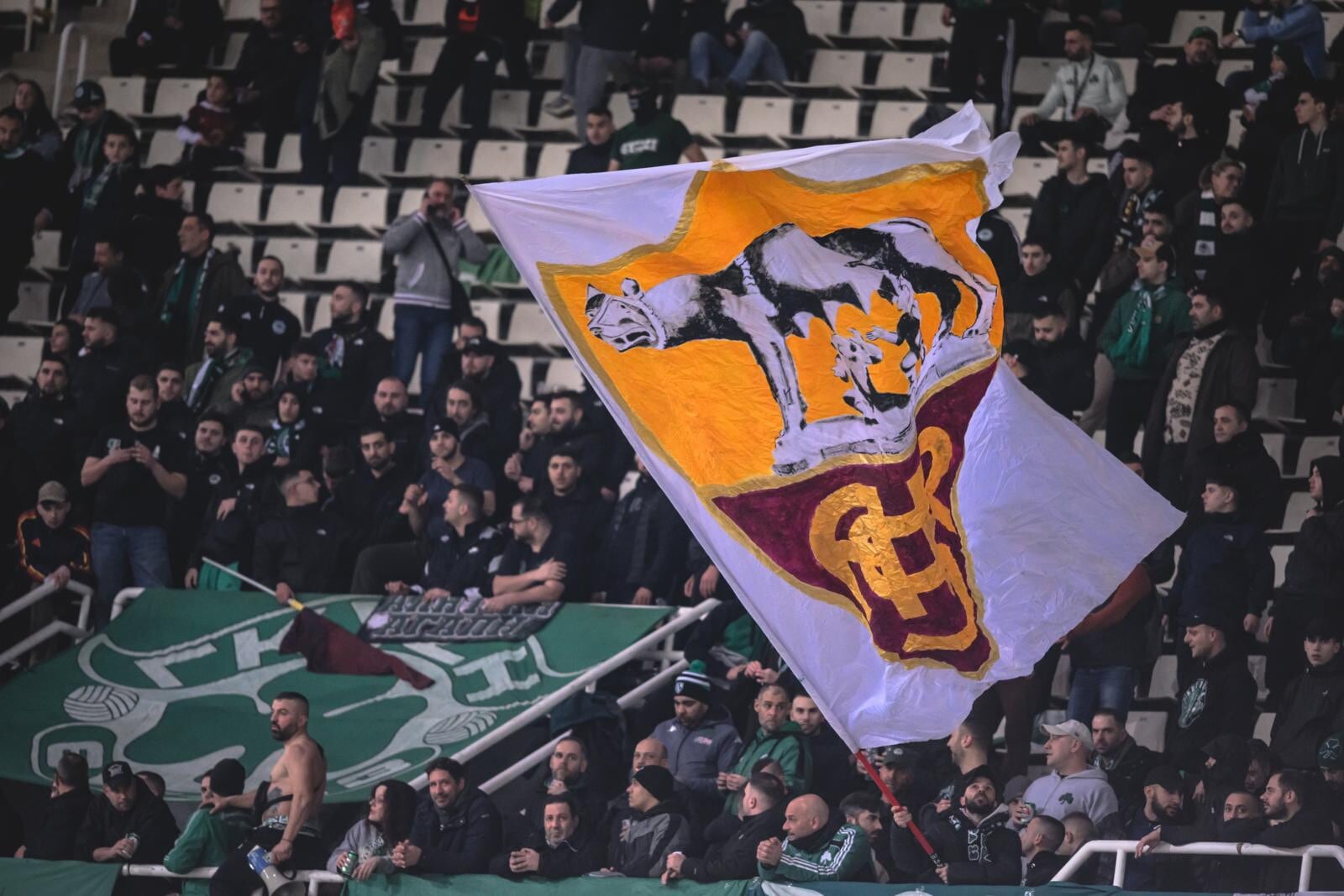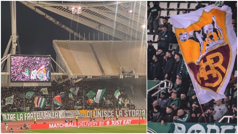 Gemellaggio Panathinaikos e Roma, striscioni e bandiere: è festa tra i tifosi sugli spalti