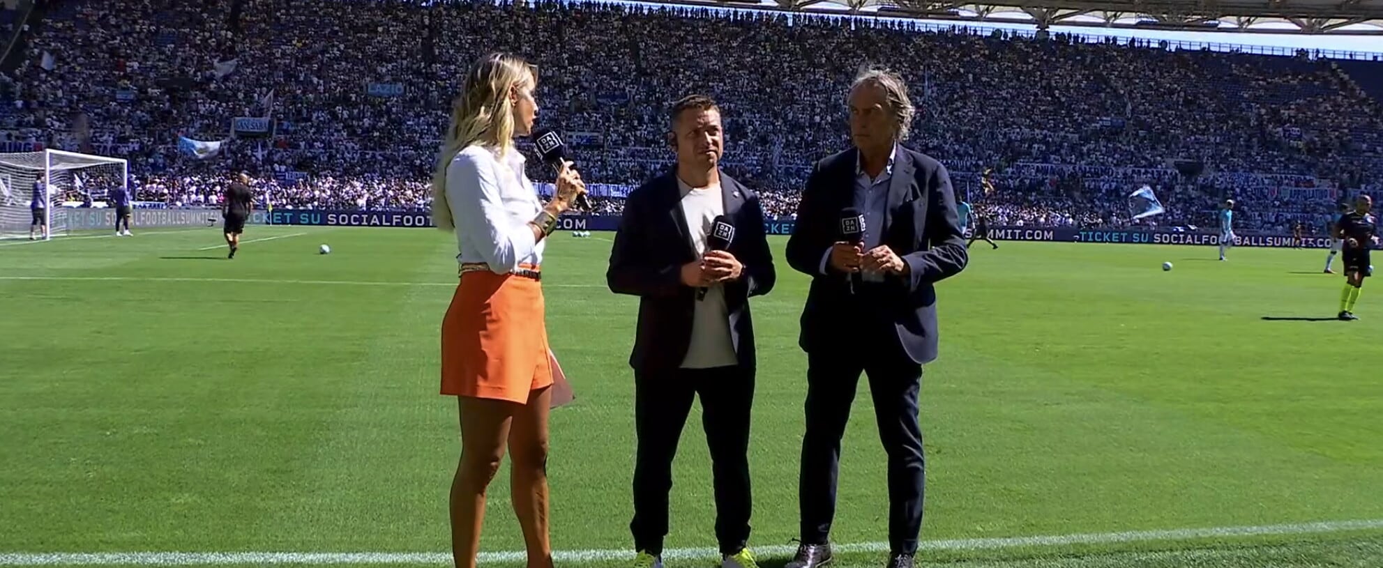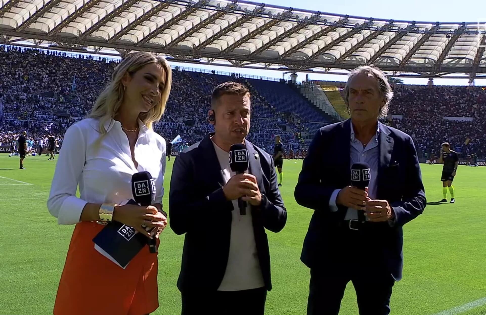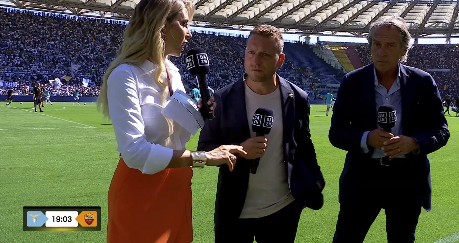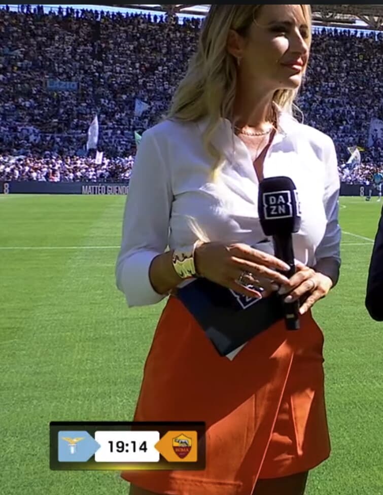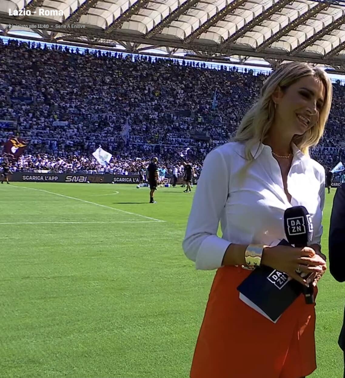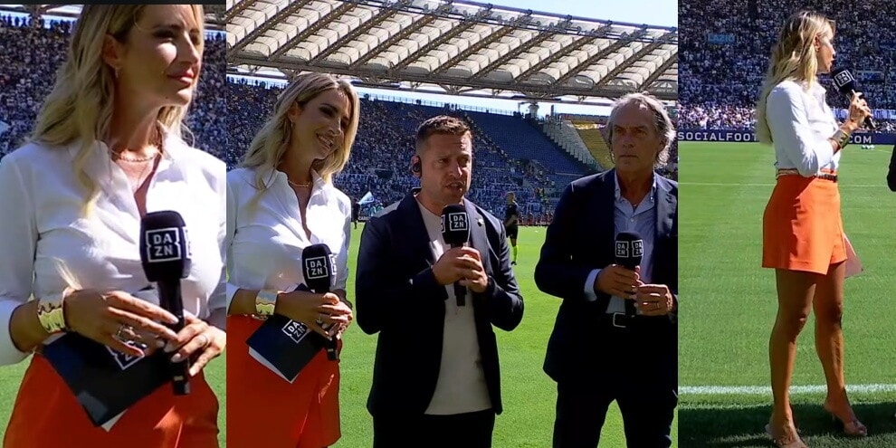 La conduttrice di Dazn sfoggia una camicia bianca con una panta-gonna arancione per la partita tra Lazio e Roma: tutte le foto