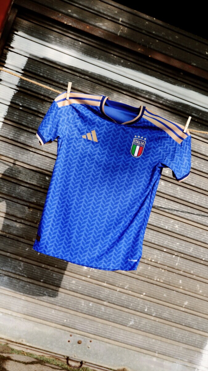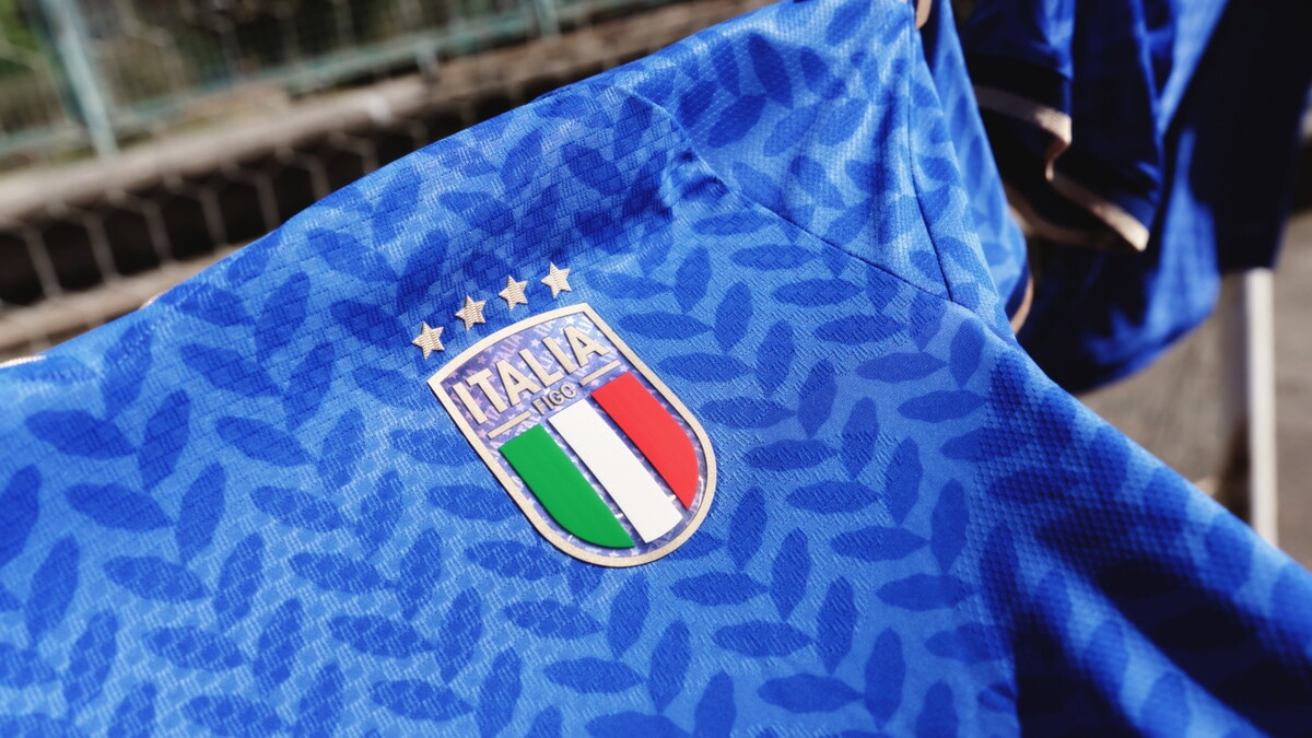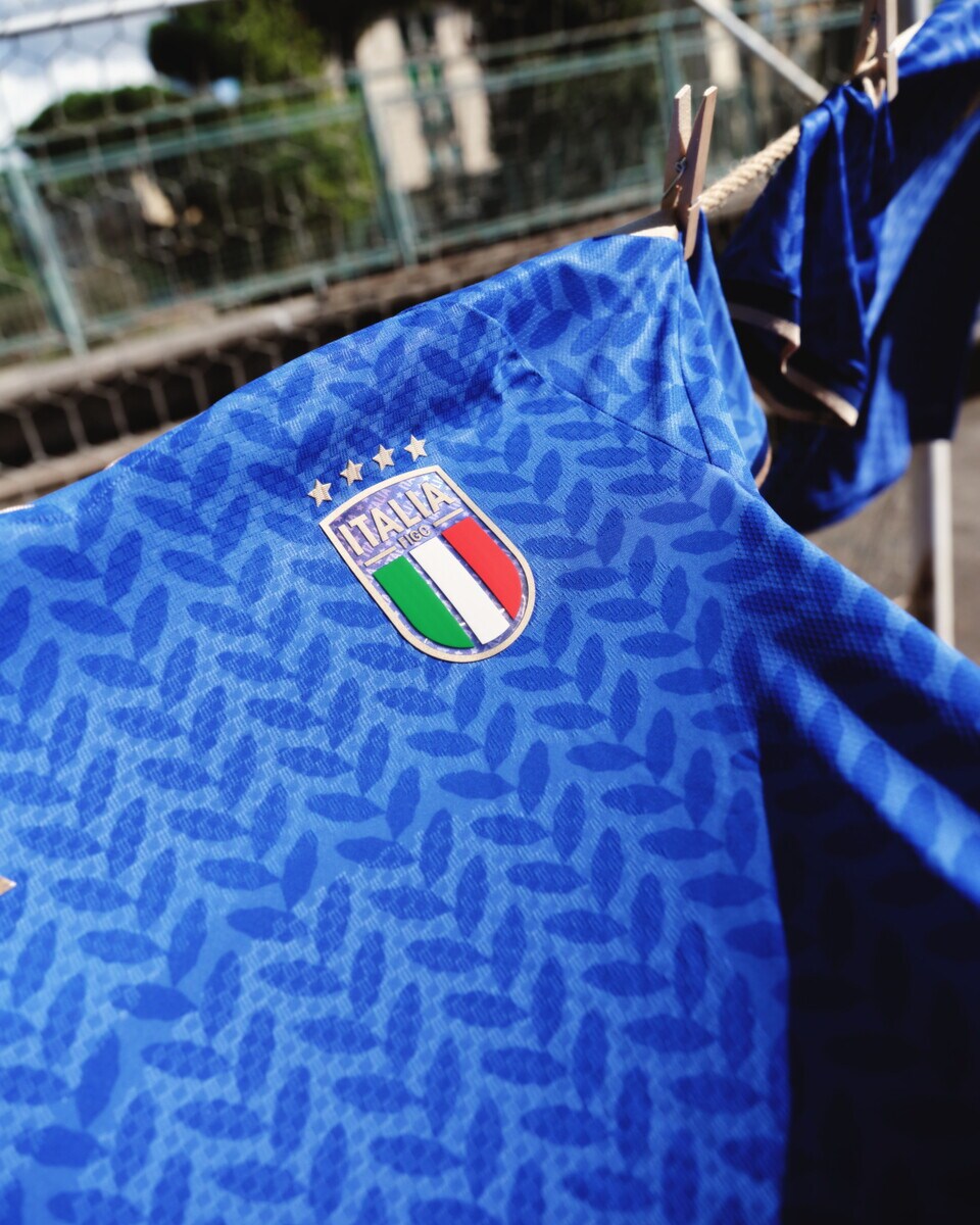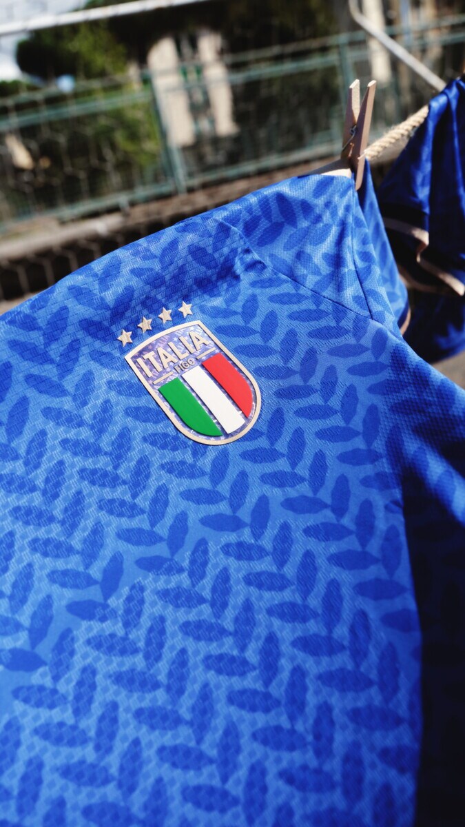 La base blu della maglia Home è adornata da un motivo grafico ripetuto, basato sulle corone d'alloro, un tempo indossate da atleti e imperatori nell'Impero Romano per rappresentare la vittoria e il trionfo. Tutte le foto del nuovo kit della Nazionale