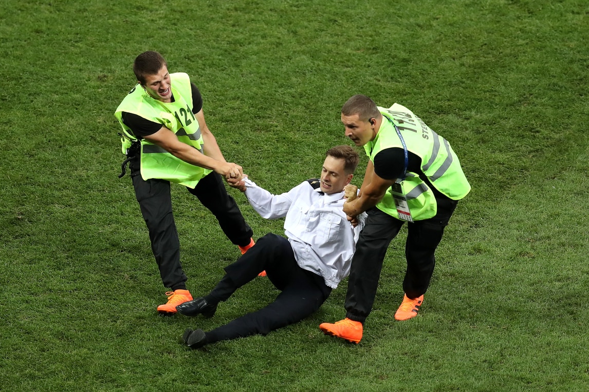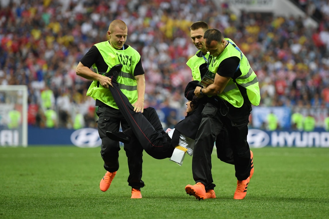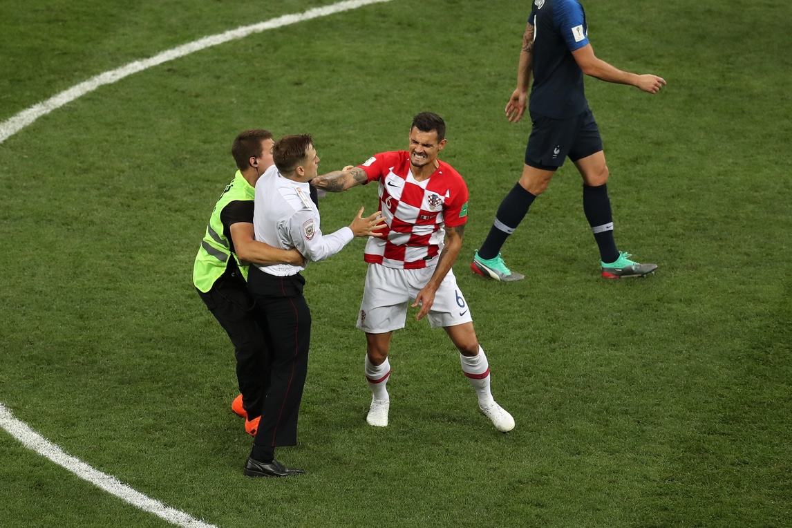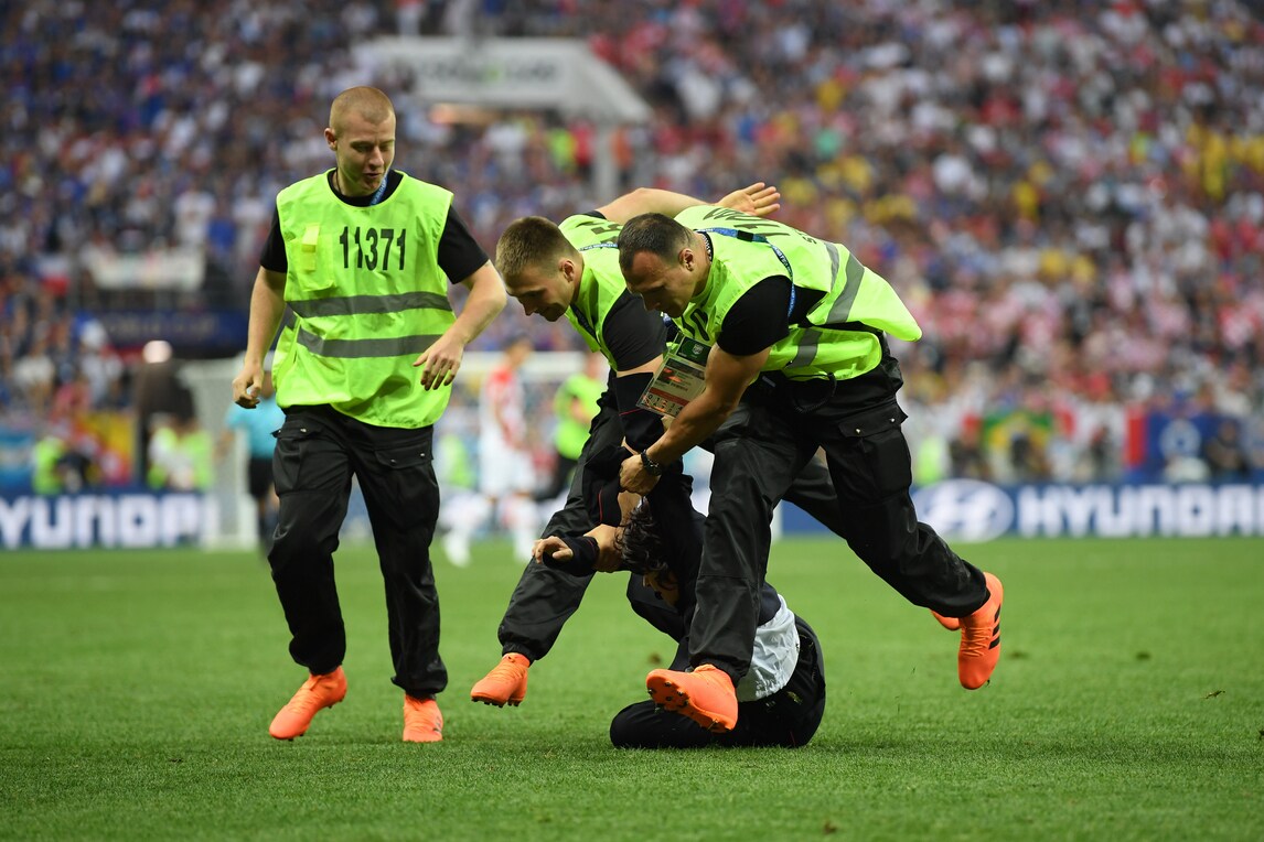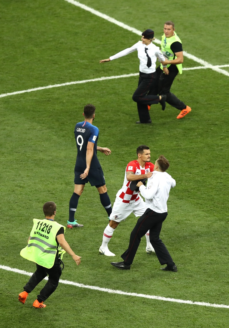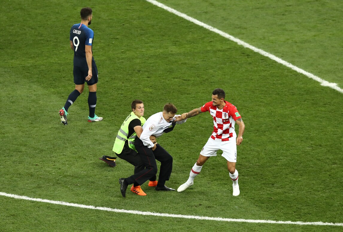 Il difensore croato stoppa la corsa degli invasori, aiutato anche dalla security. Con un post su Twitter e su Facebook il gruppo delle Pussy Riot ha rivendicato l'invasione allo stadio Luzhniki