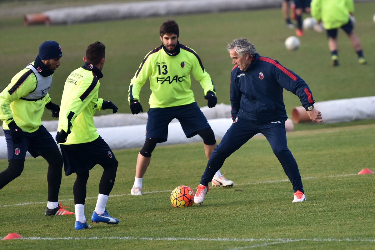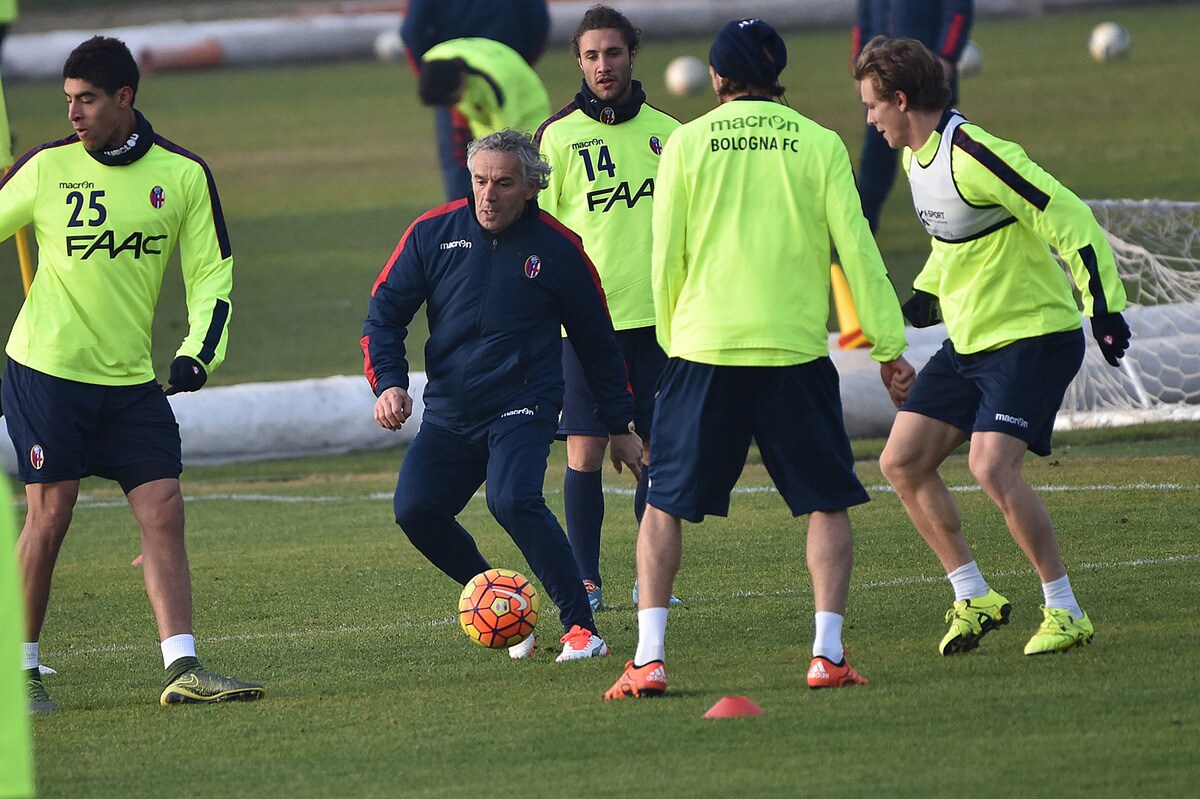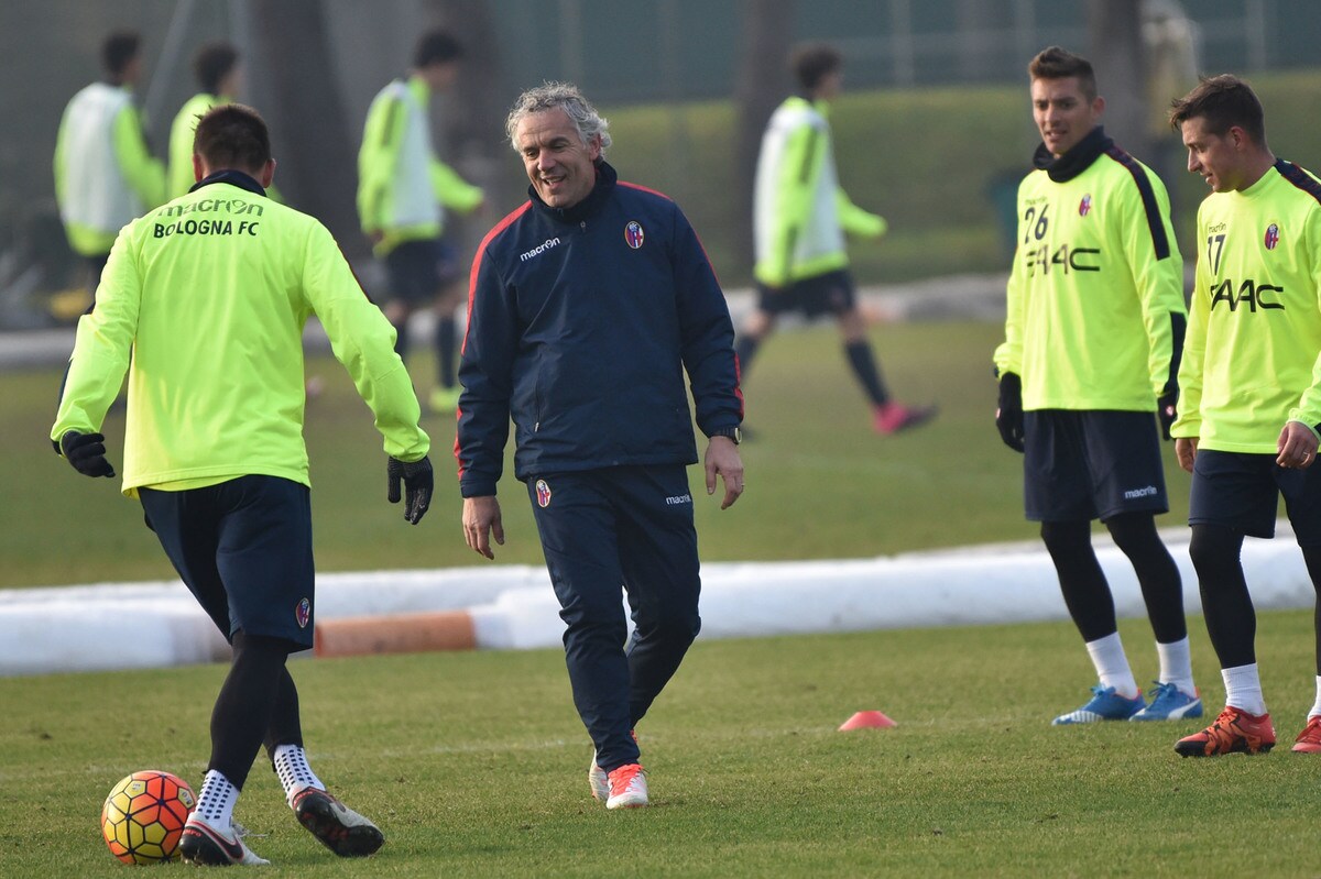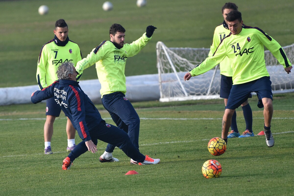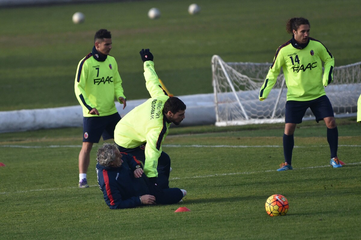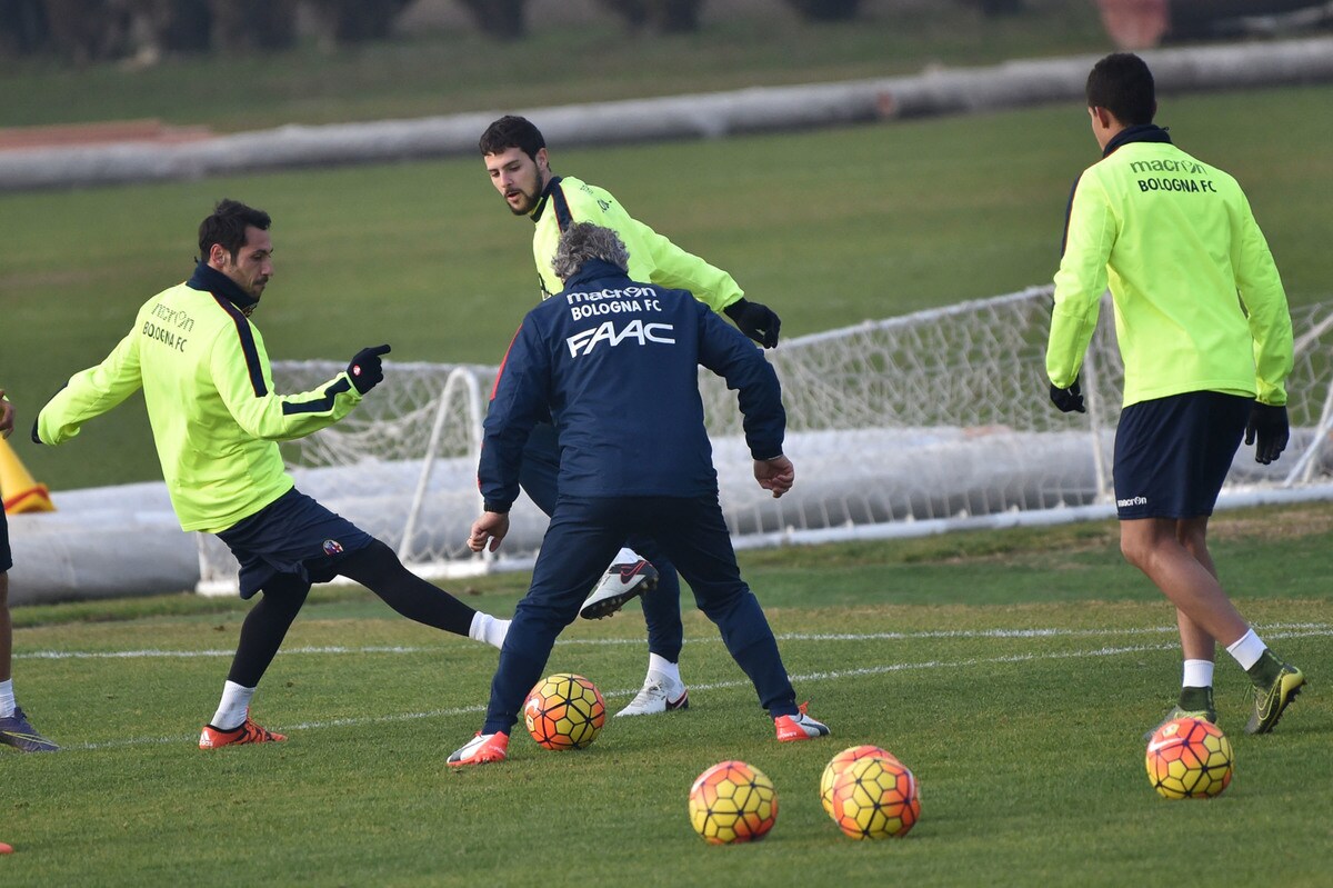 Il tecnico rossoblù gioca e si diverte con i suoi ragazzi durante l'allenamento pomeridiano: tanti spettatori bolognesi presenti