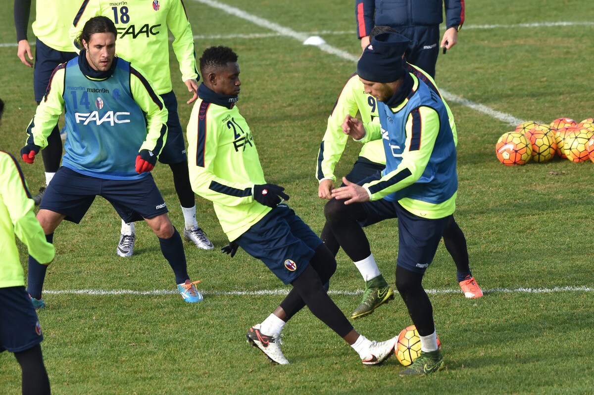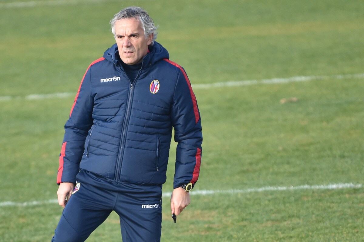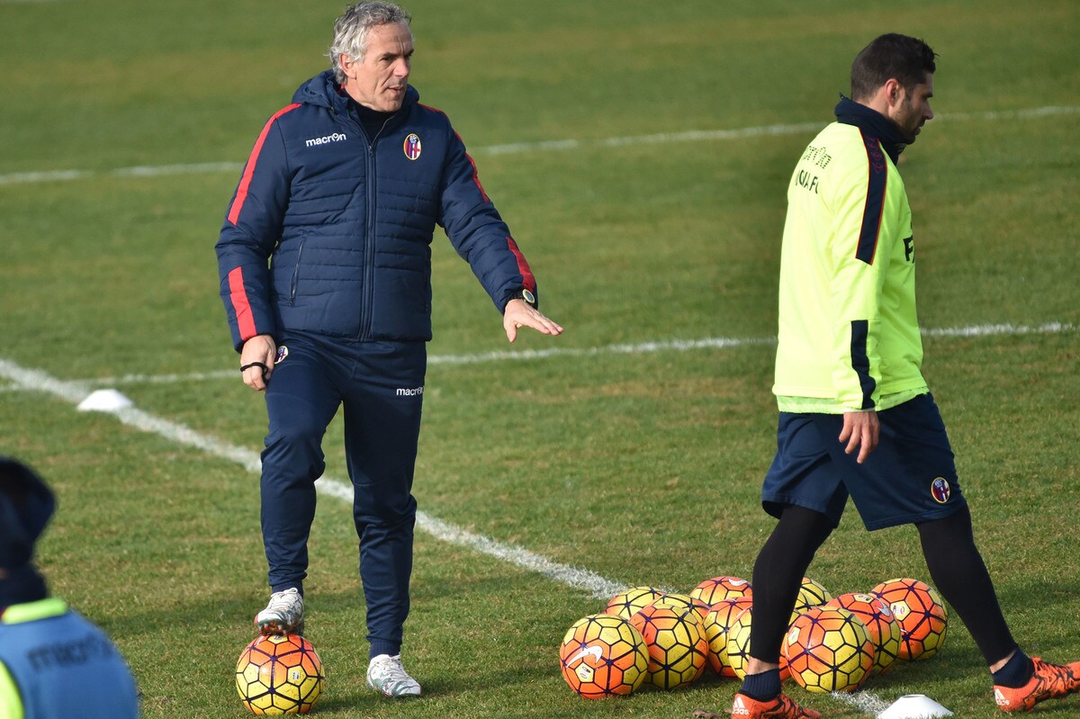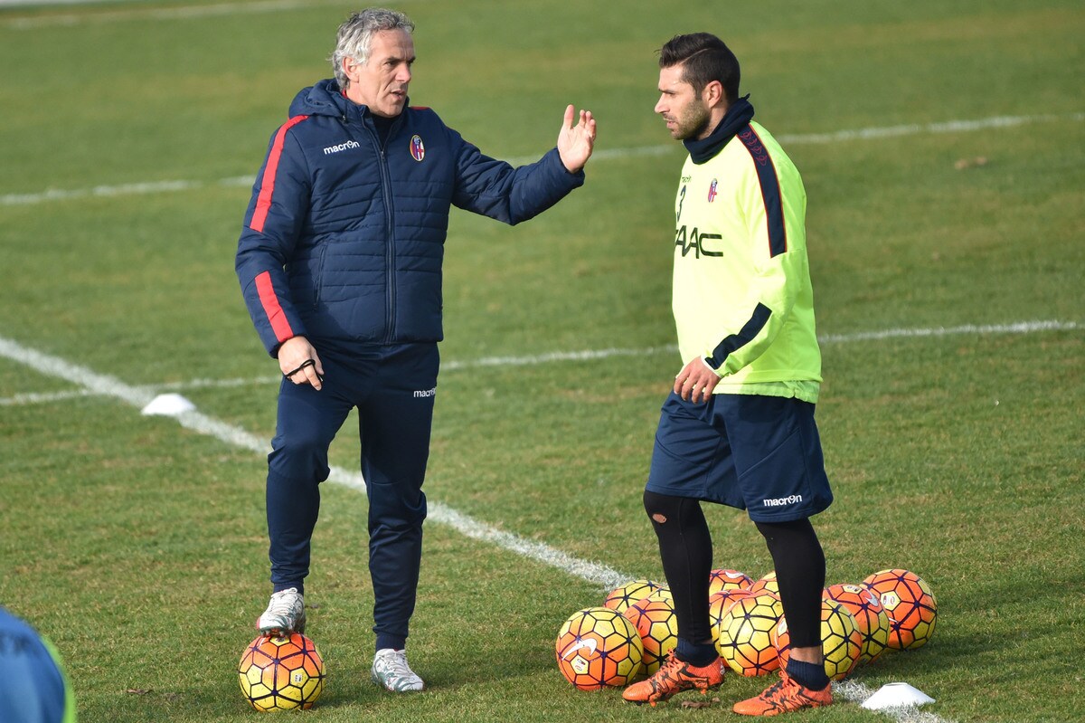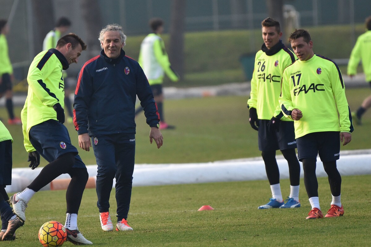 Il tecnico rossoblù gioca e si diverte con i suoi ragazzi durante l'allenamento pomeridiano: tanti spettatori bolognesi presenti