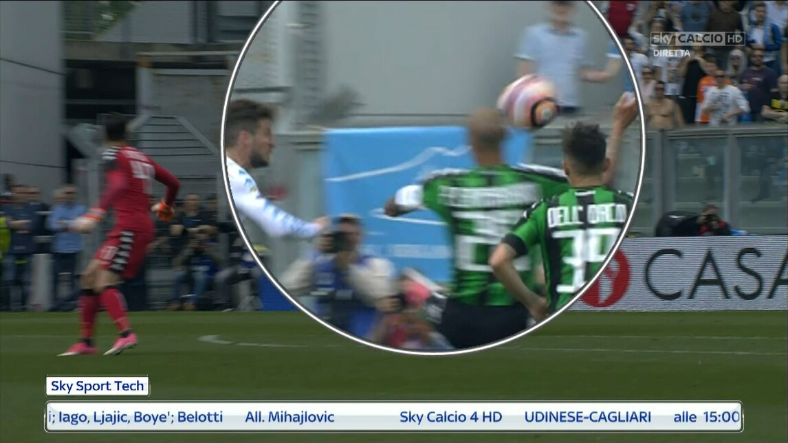 Le immagini del tocco di Paolo Cannavaro sul tiro di Mertens nell'area del Sassuolo. Per l'arbitro Damato la palla colpisce la testa del giocatore e l'azione è regolare
