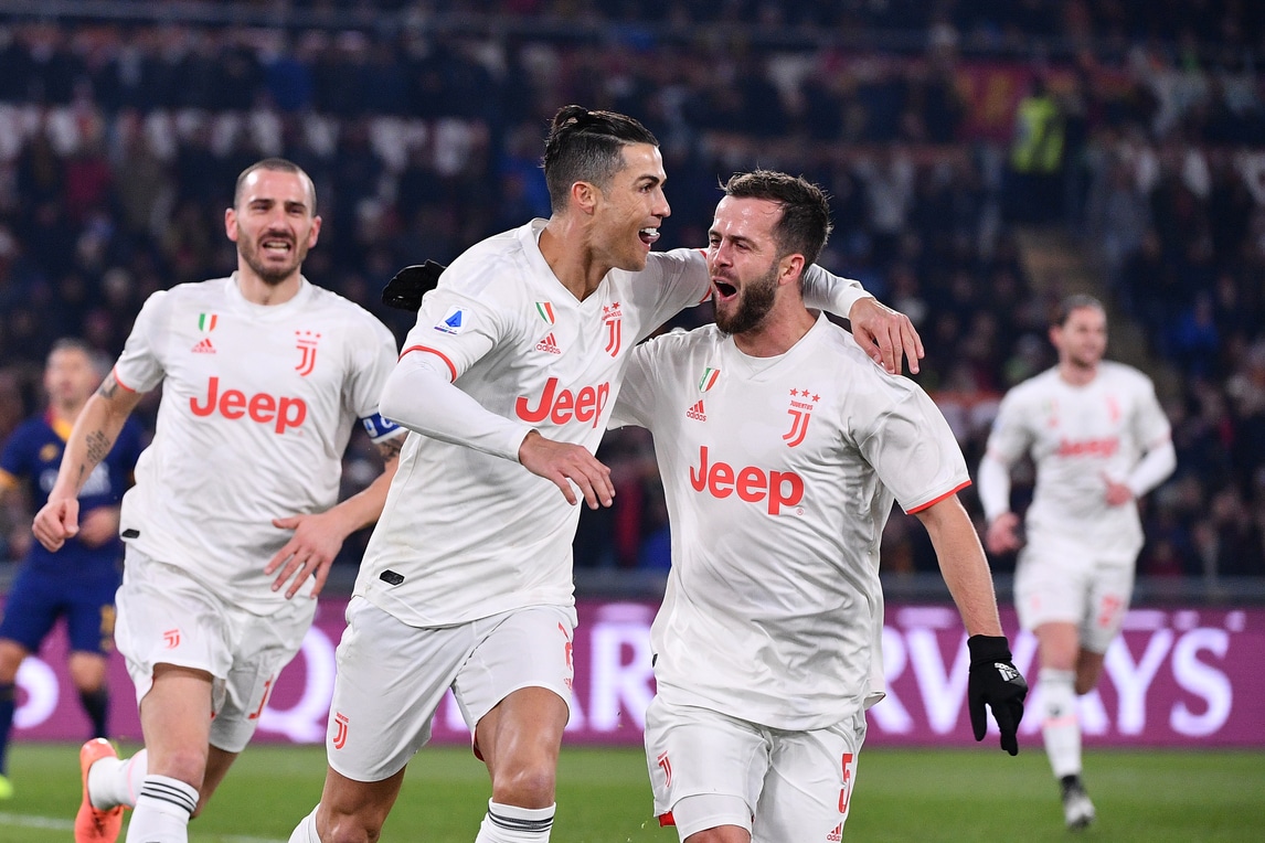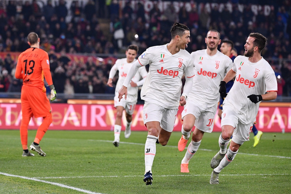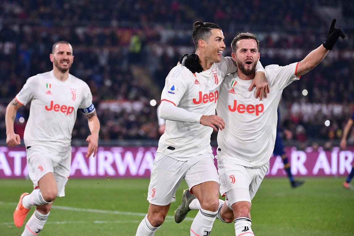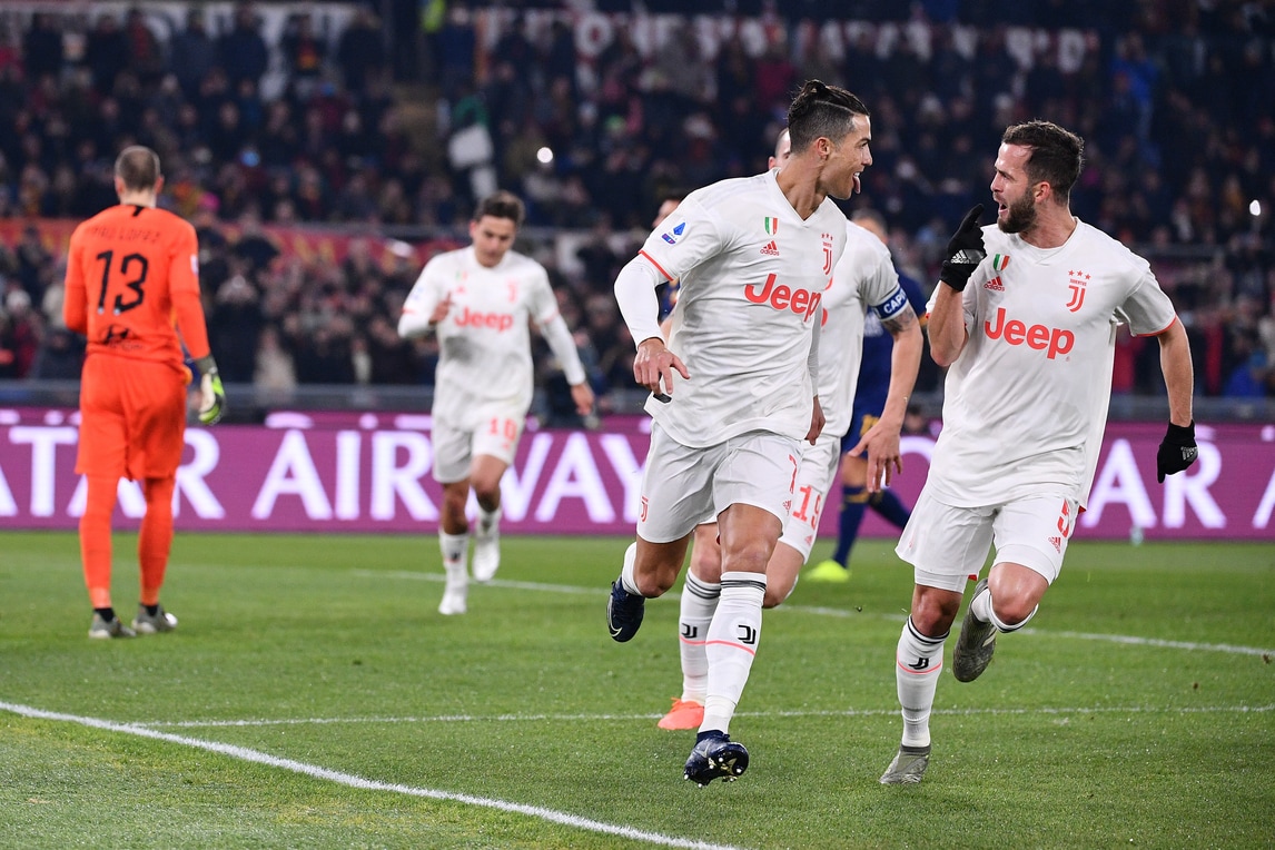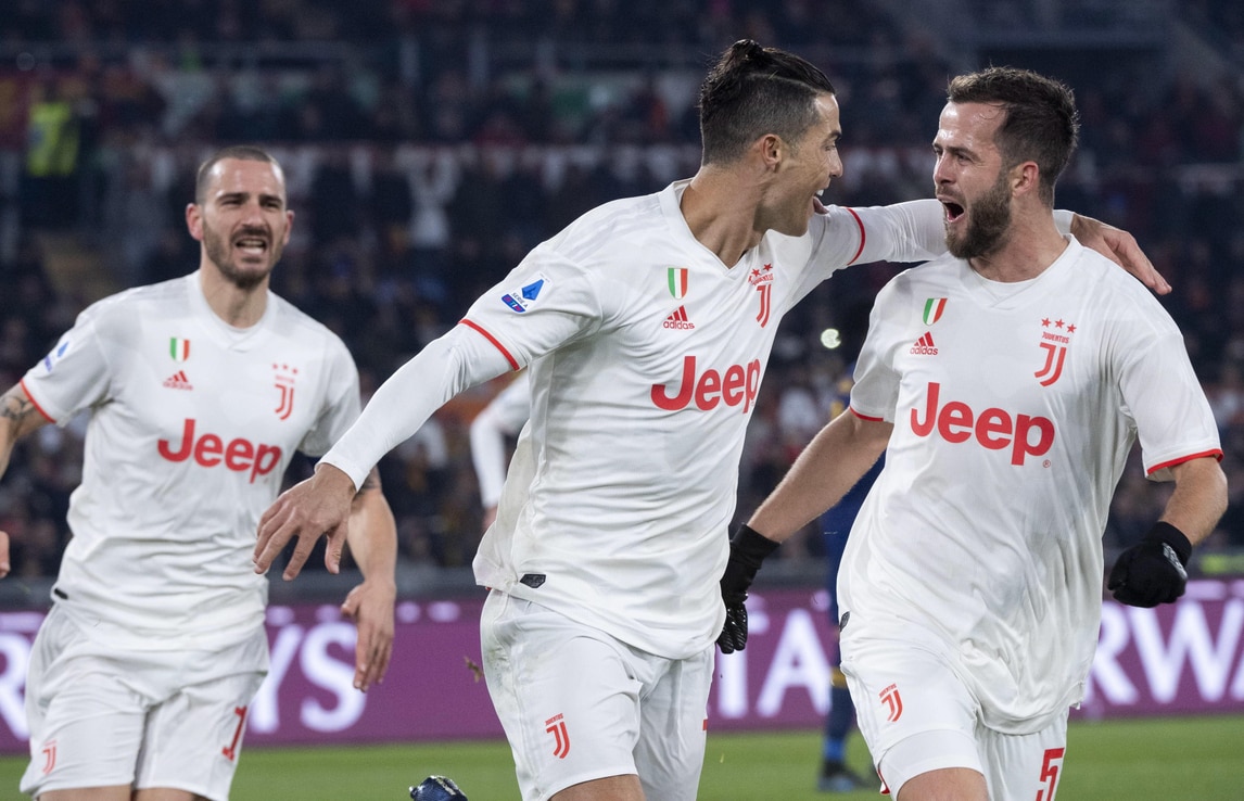 Roma-Juve, Ronaldo segna e abbraccia Pjanic
