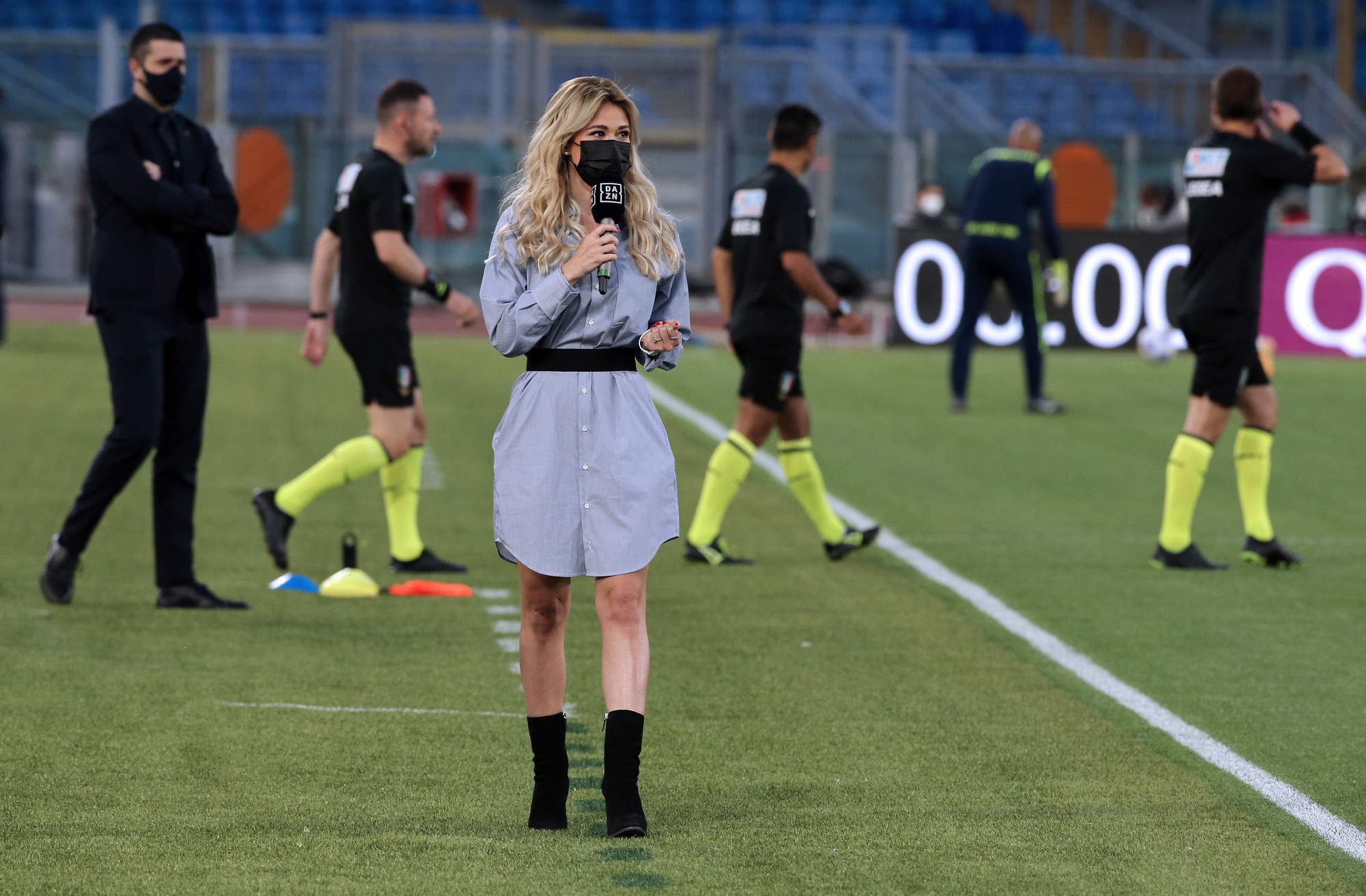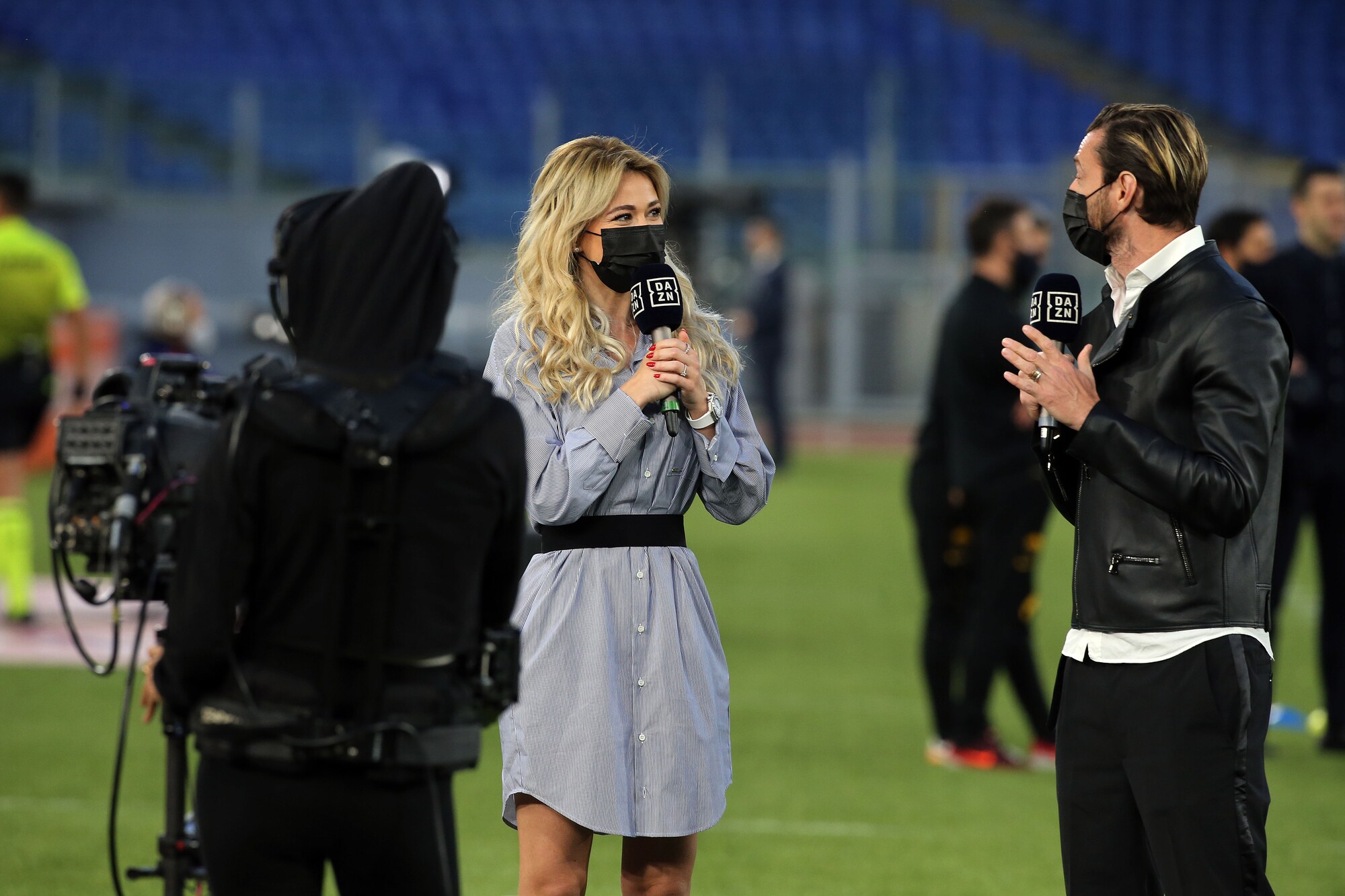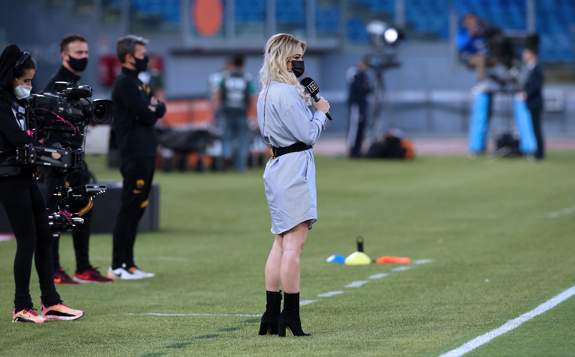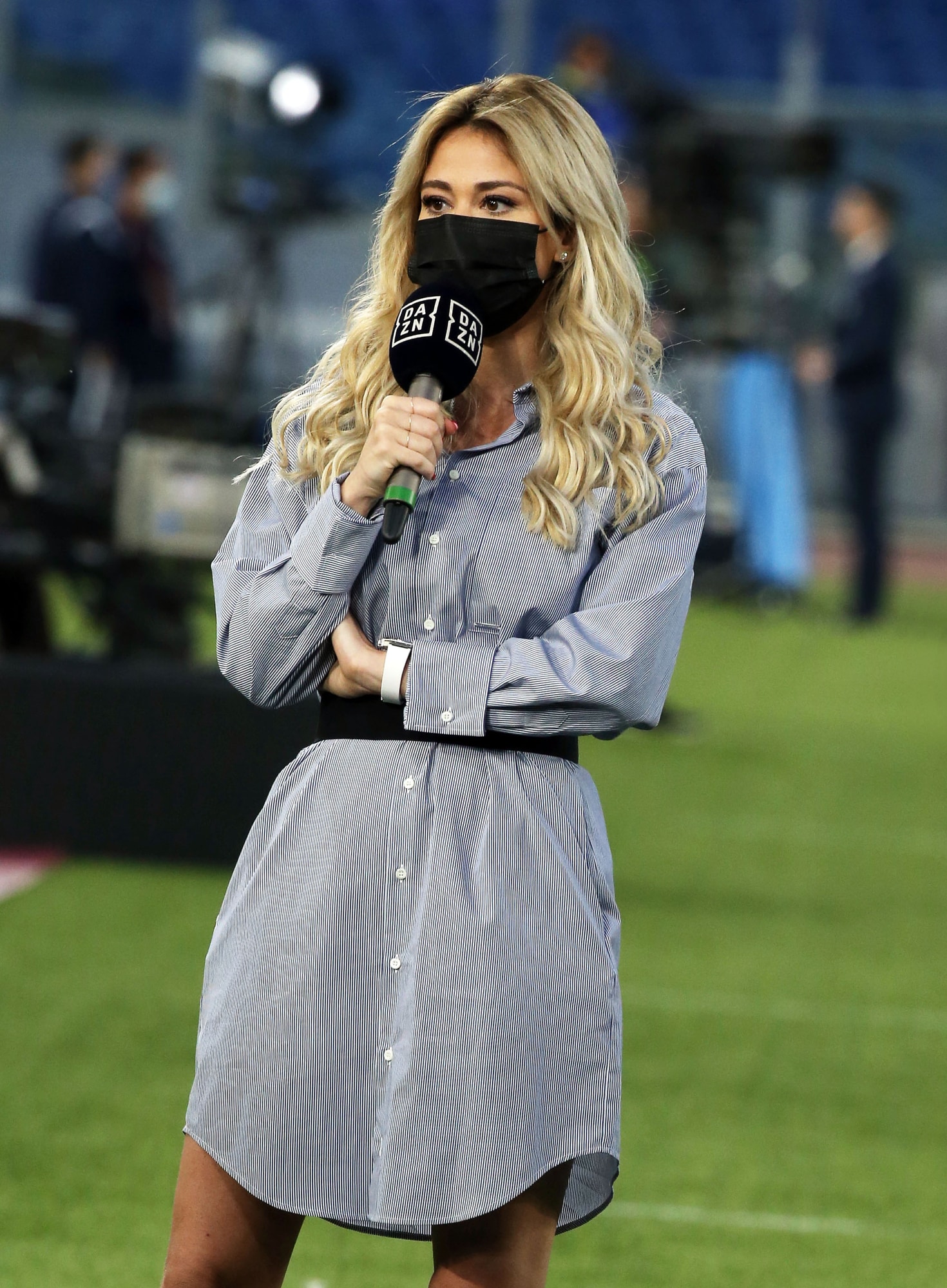 La bella conduttrice di Dazn a bordocampo per la supersfida tra Fonseca e Inzaghi, vinta dal portoghese per 2-0 grazie alle reti di Mkhitaryan e Pedro
