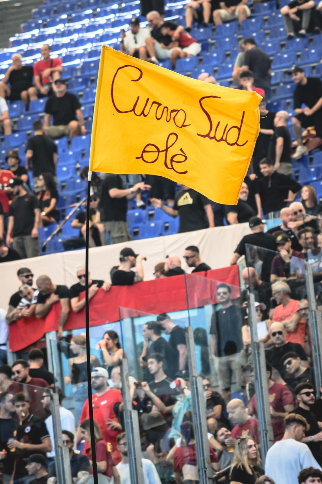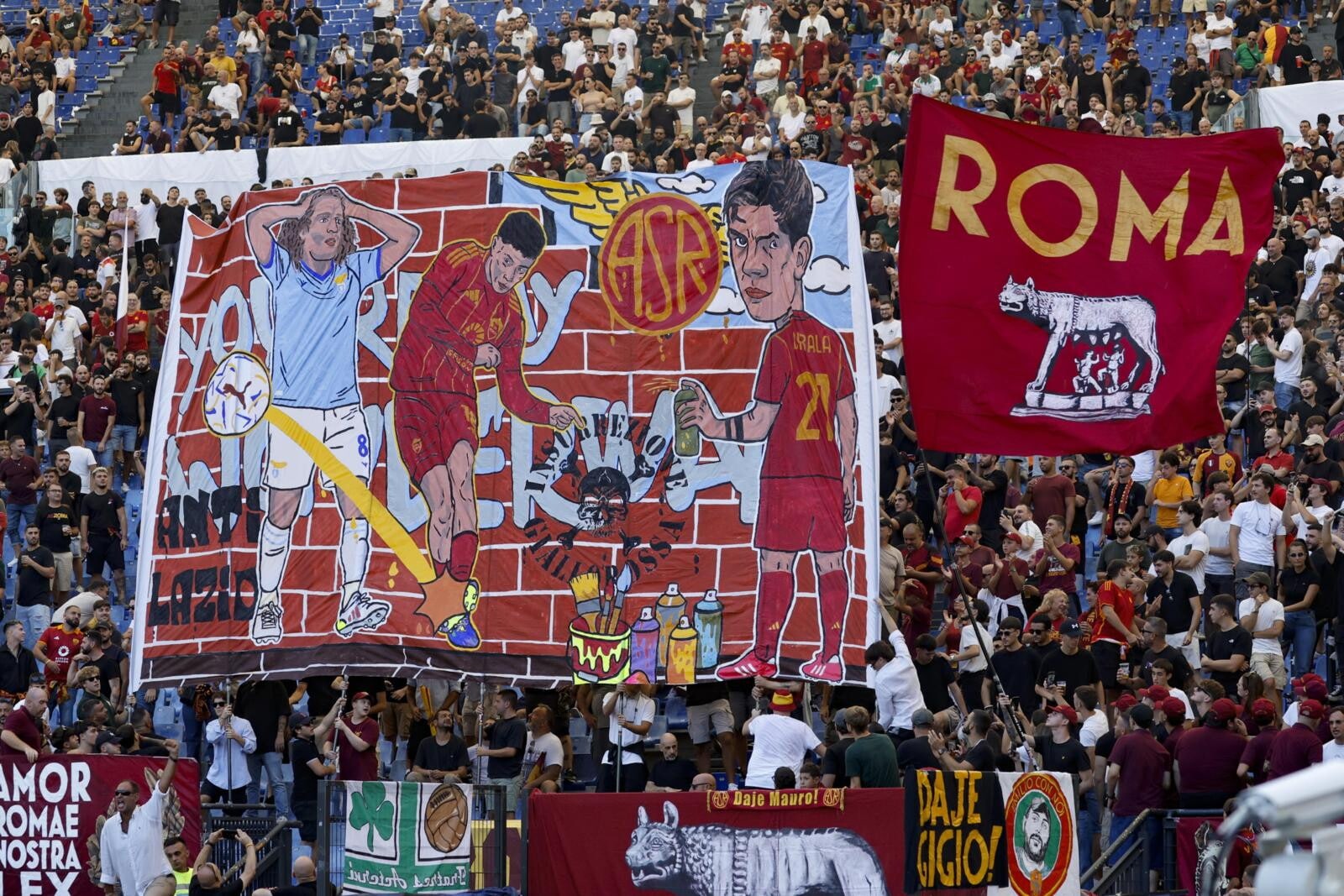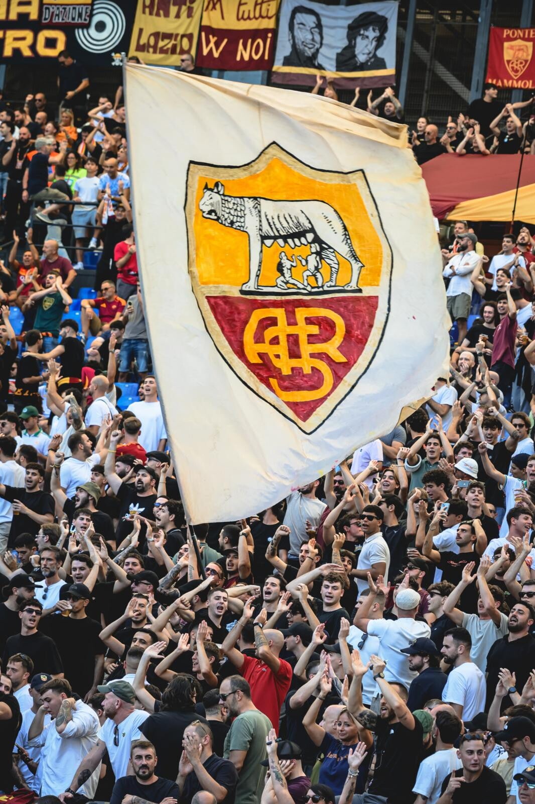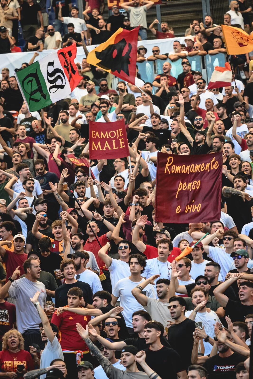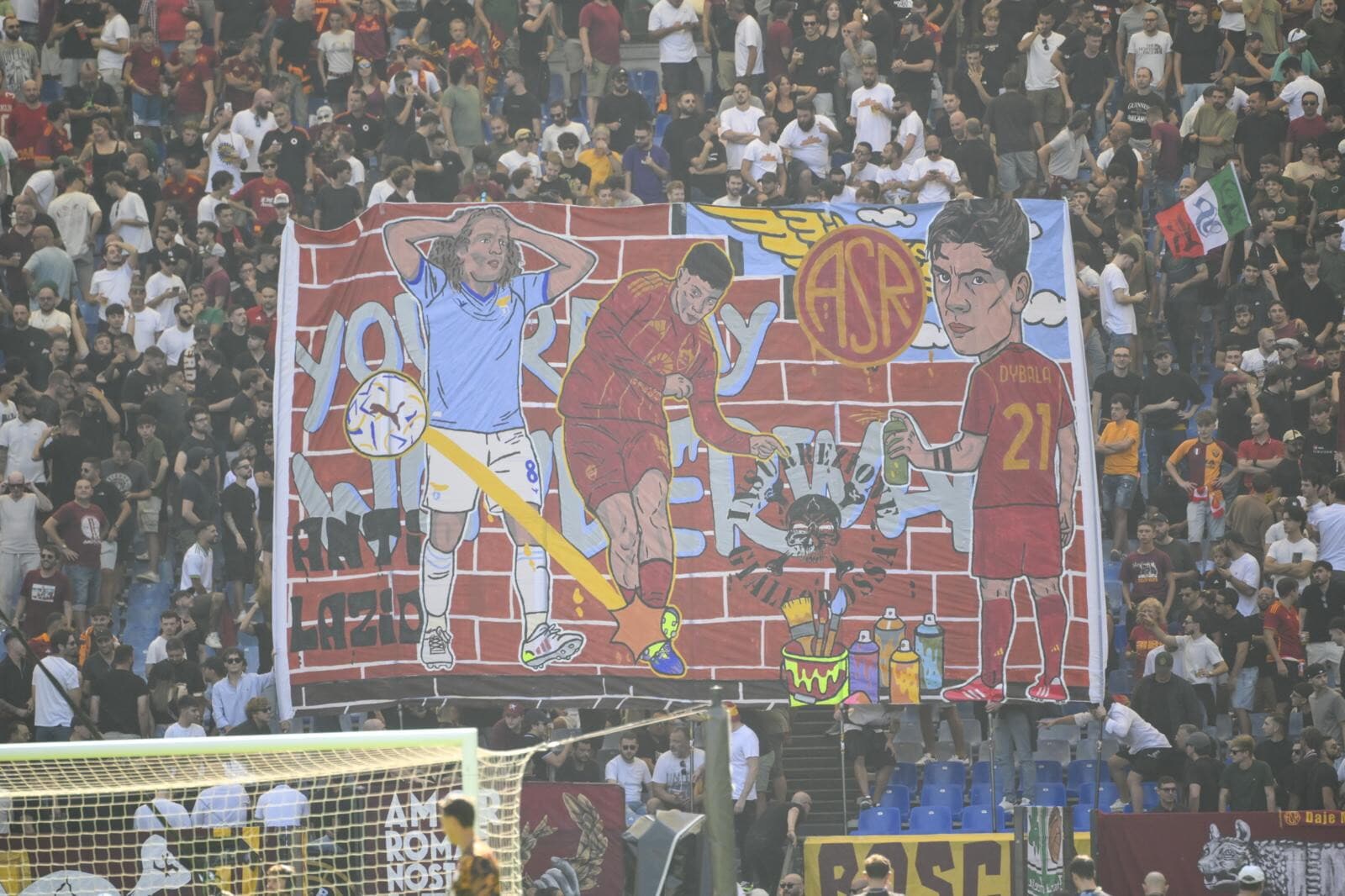 I tifosi biancocelesti hanno esposto uno striscione con scritto "Tifa la tradizione" e la gigantografia di un ragazzo con la maglia della Lazio mentre la tifoseria giallorossa ha prodotto con dei cartoncini la scritta "Lupus, Dentibus, Petit" e l'immagine di un lupo, con anche un altro striscione: "Coraggio lupetto, attacca di più…distruggili tu".