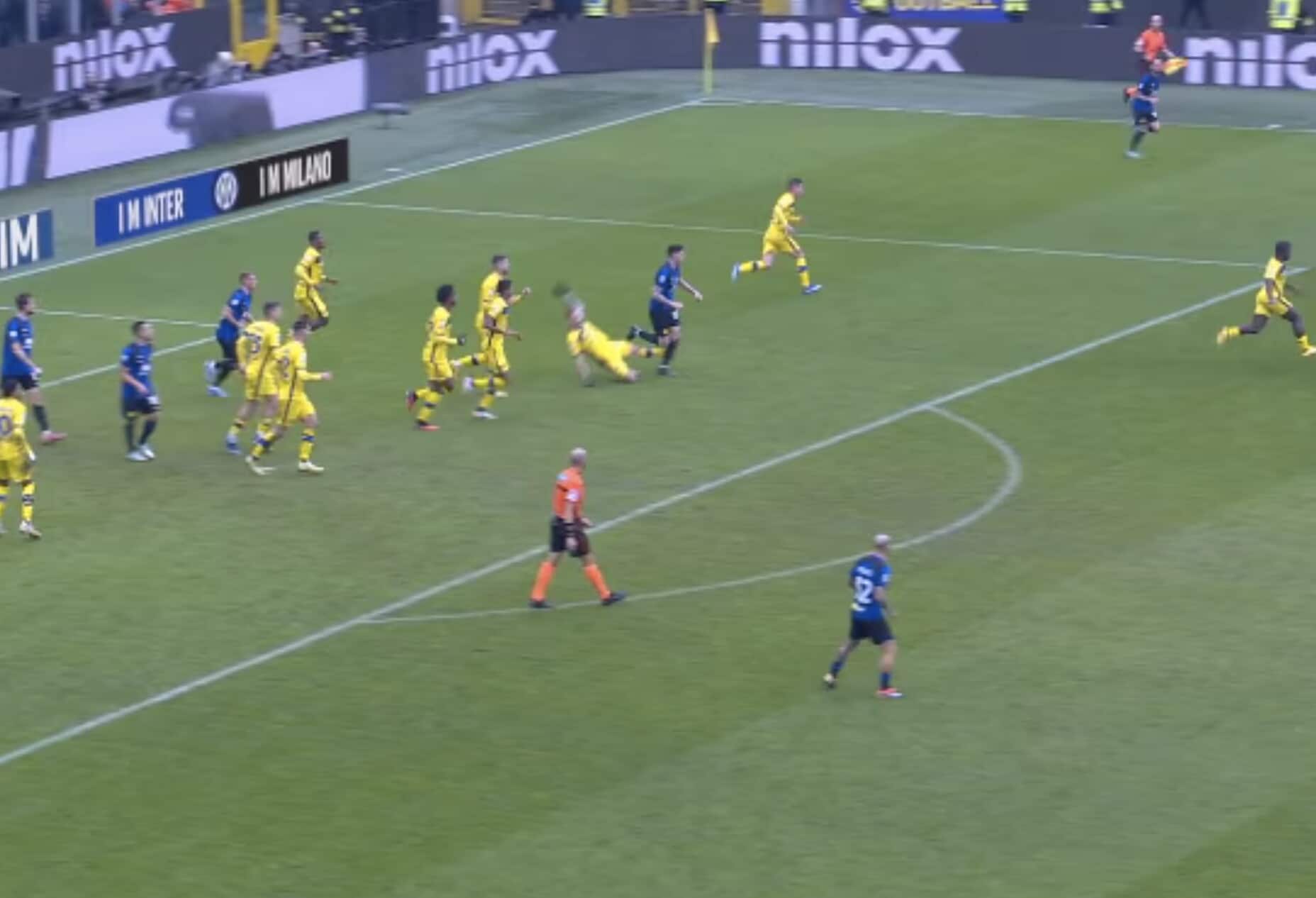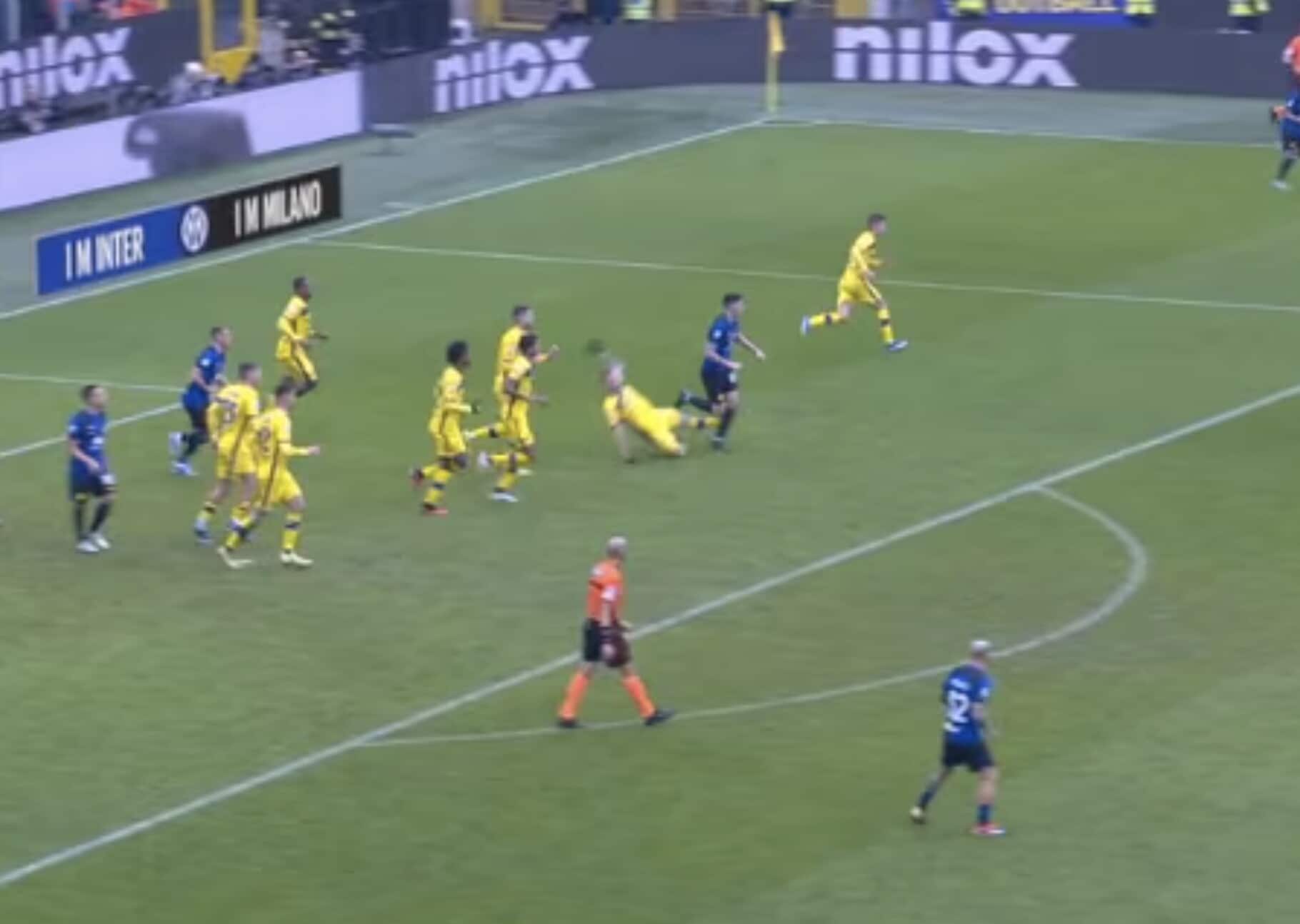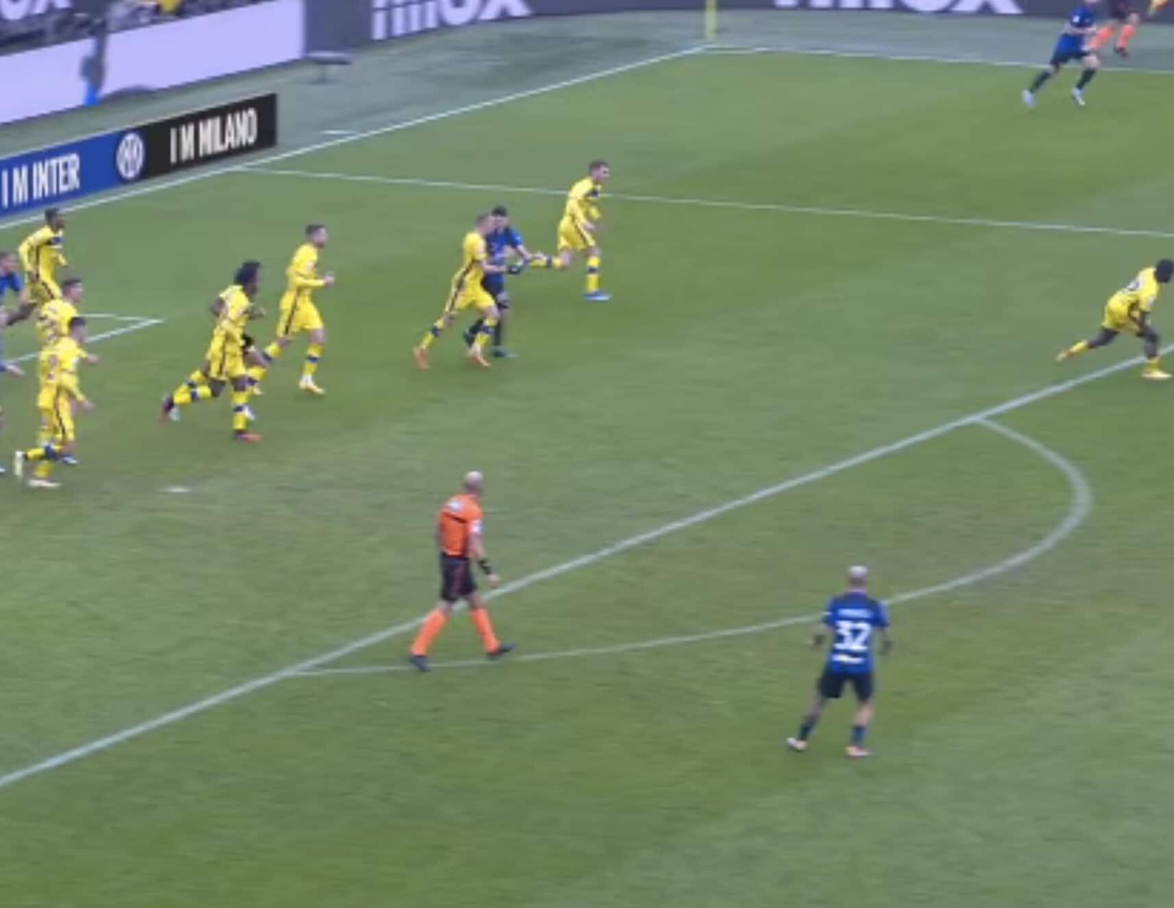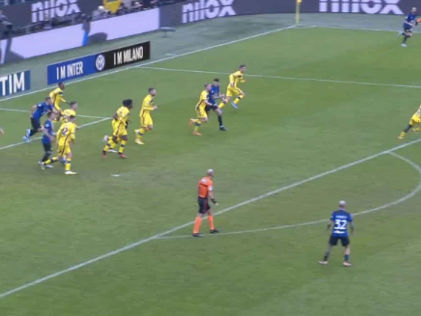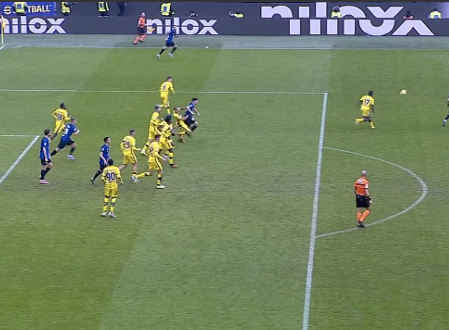 Il difensore nerazzurro poco interessato all’azione e dritto sul giocatore avversario, che poi resta a terra: da lì nascerà il gol del 2-1 di Frattesi