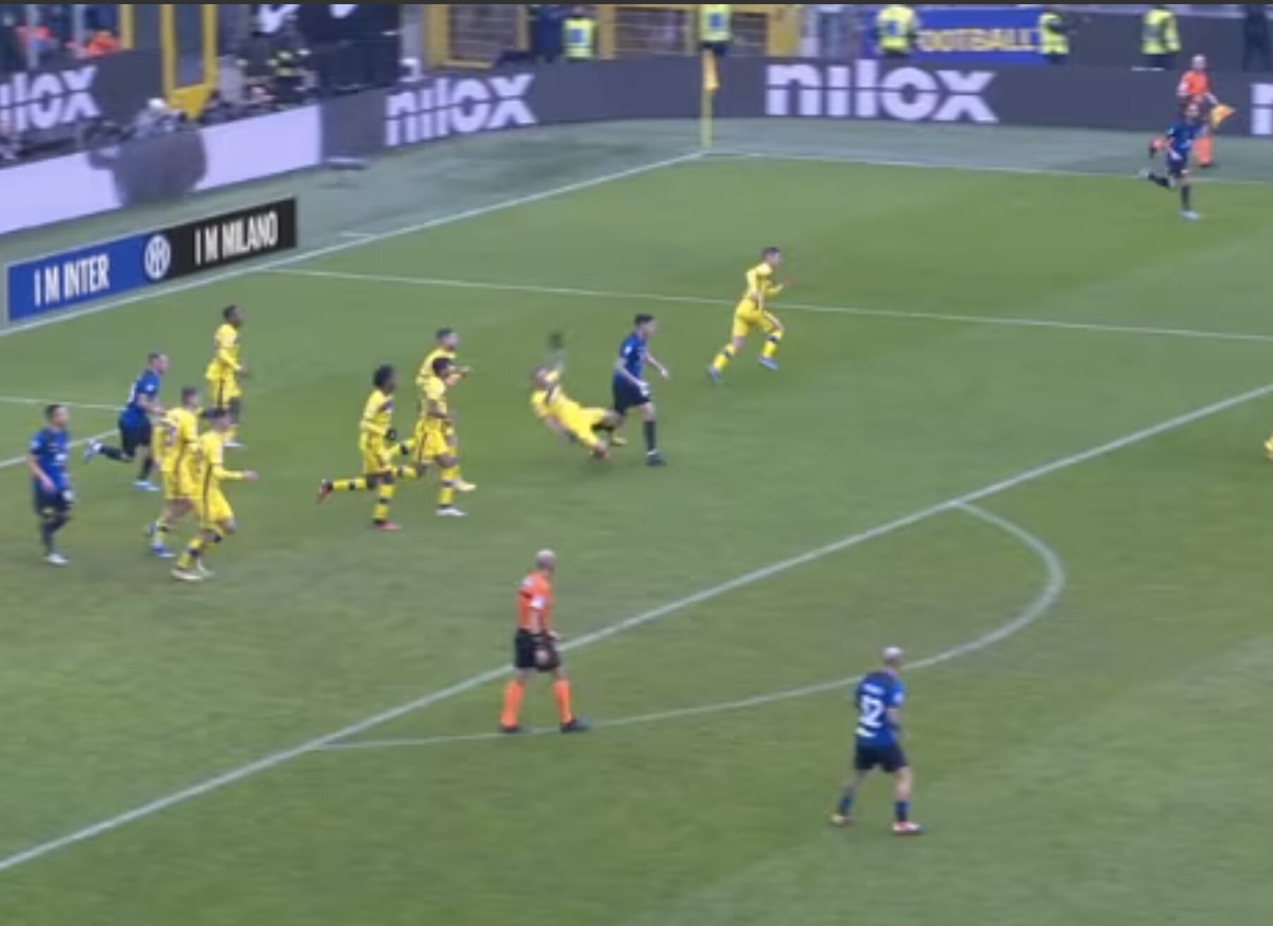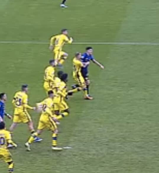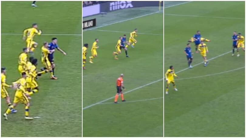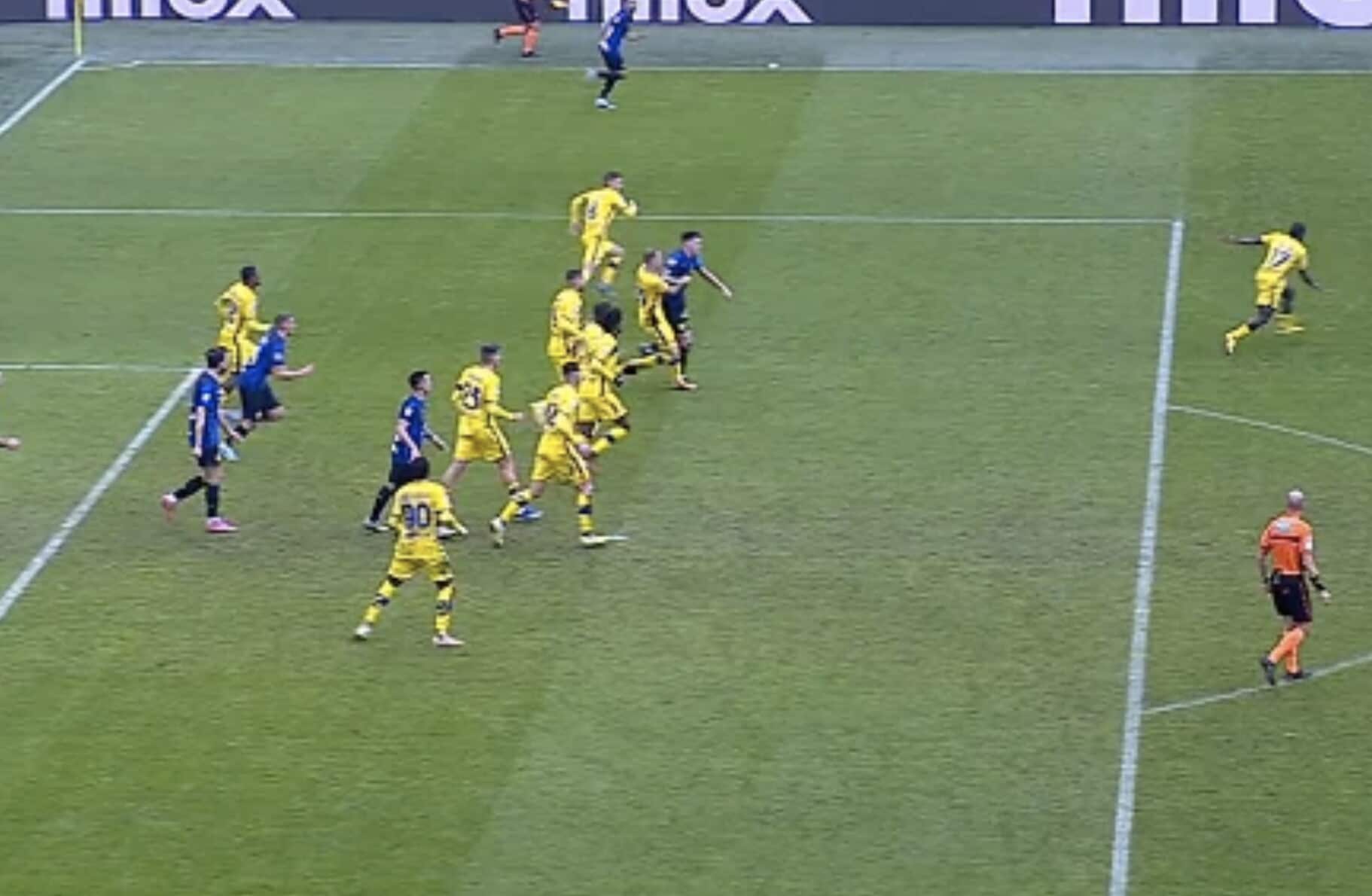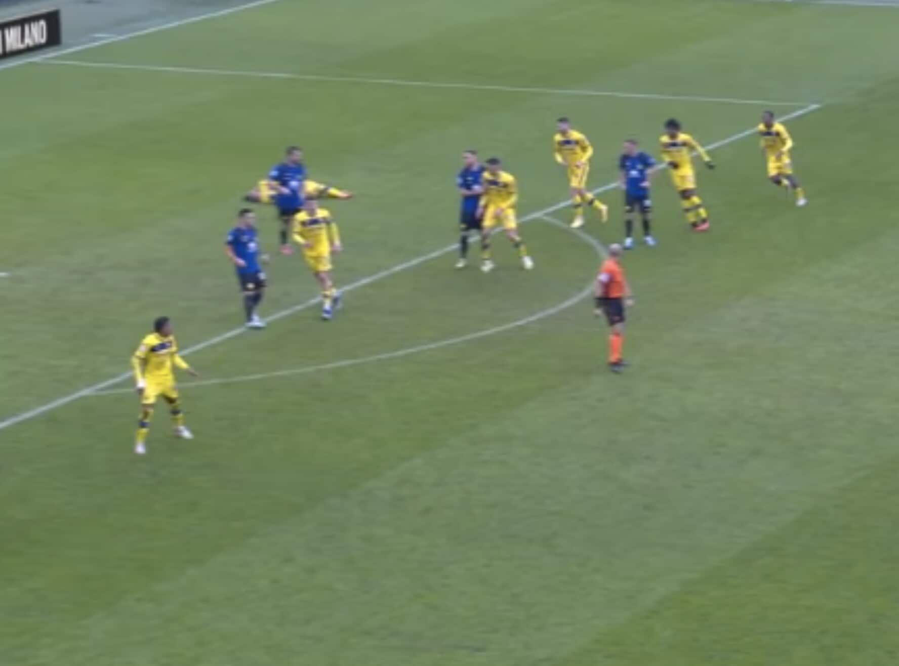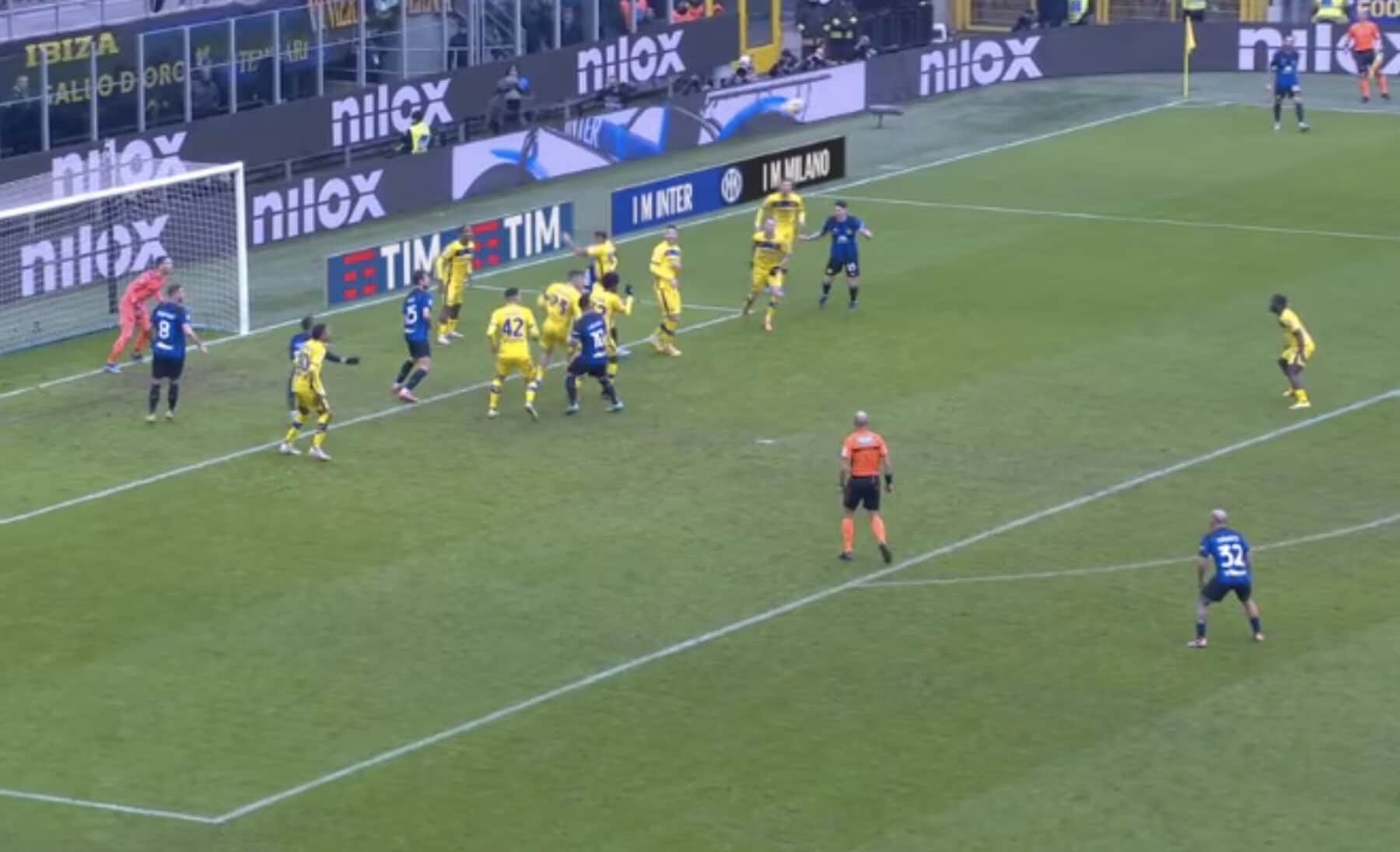 Il difensore nerazzurro poco interessato all’azione e dritto sul giocatore avversario, che poi resta a terra: da lì nascerà il gol del 2-1 di Frattesi