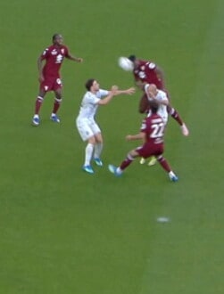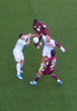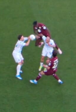 Zapata di testa, Carlos Augusto blocca con il braccio: dopo il check del Var è calcio di rigore, la sequenza