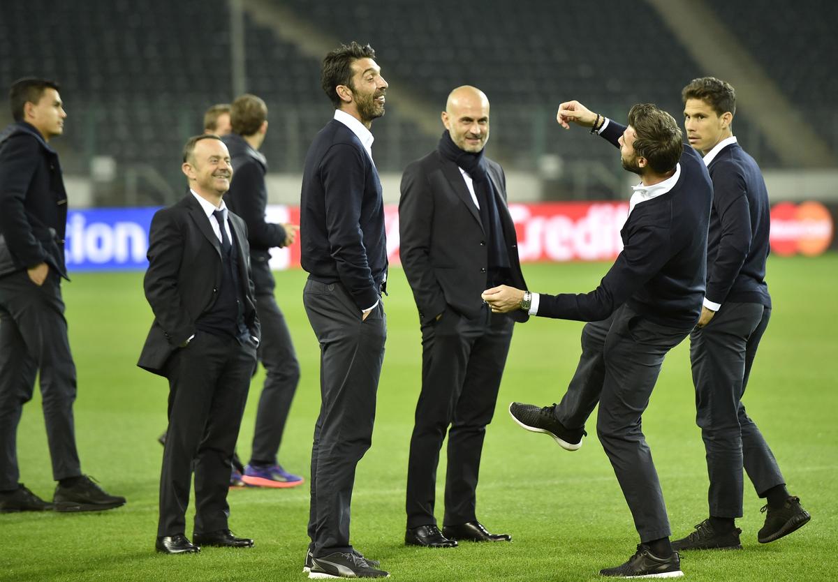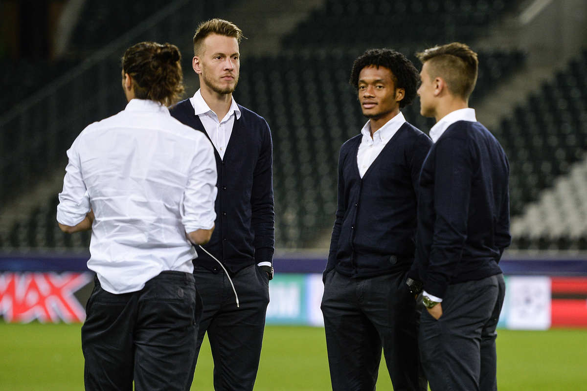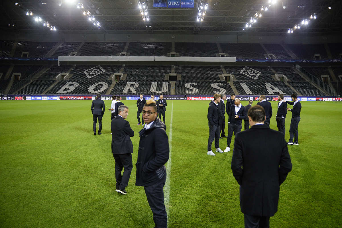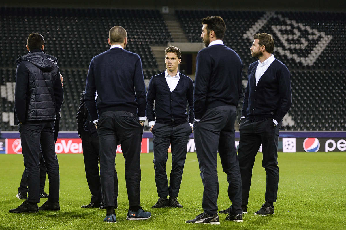 Lo svizzero, tra i convocati per la trasferta Champions dopo un mese dall'operazione al cuore, sorride con i compagni sul campo del Borussia Moenchengladbach