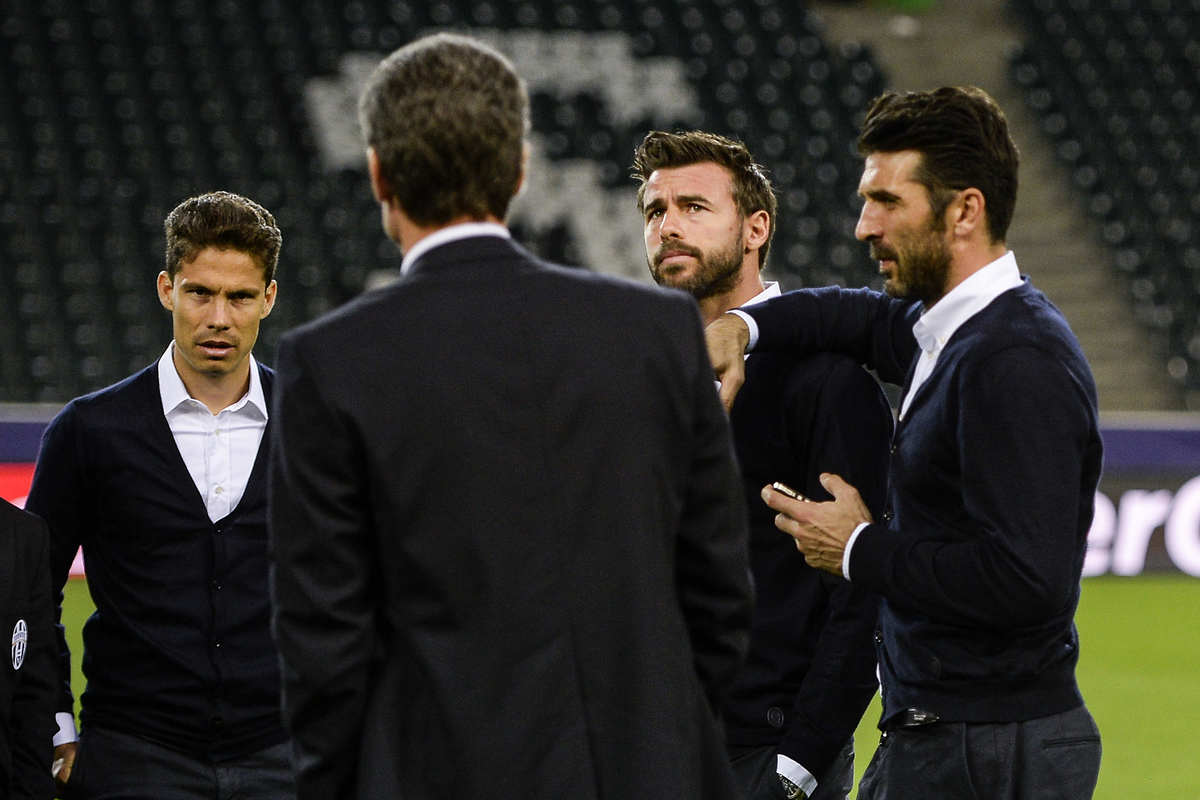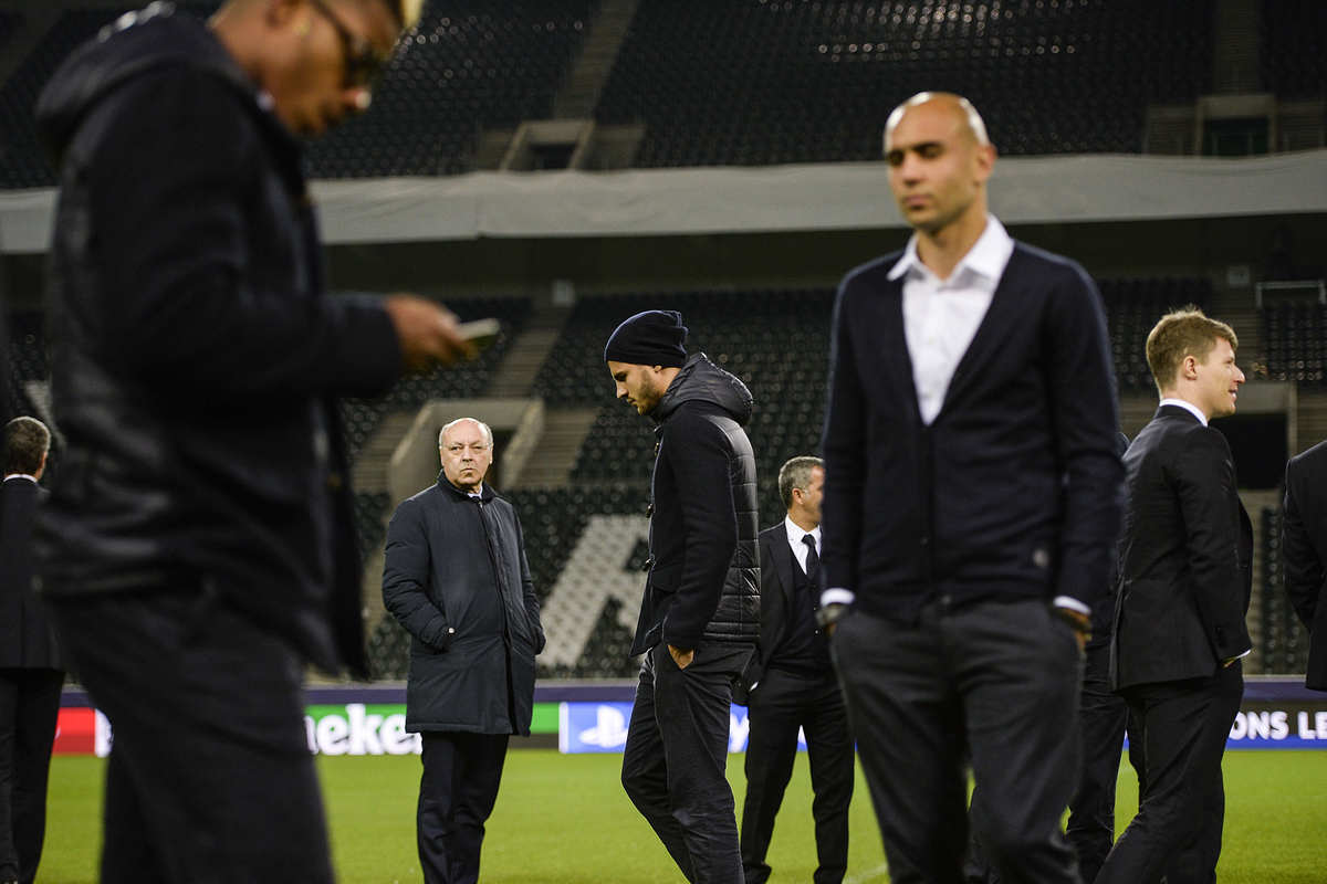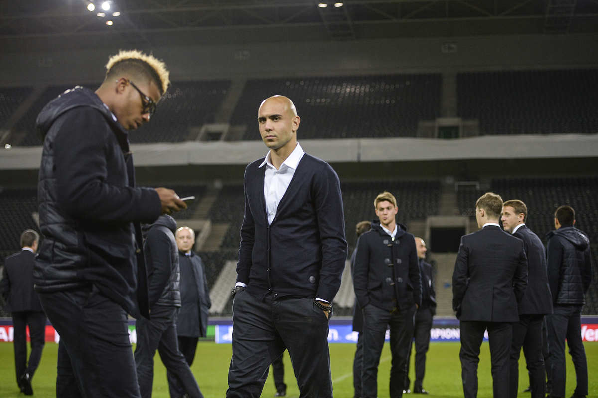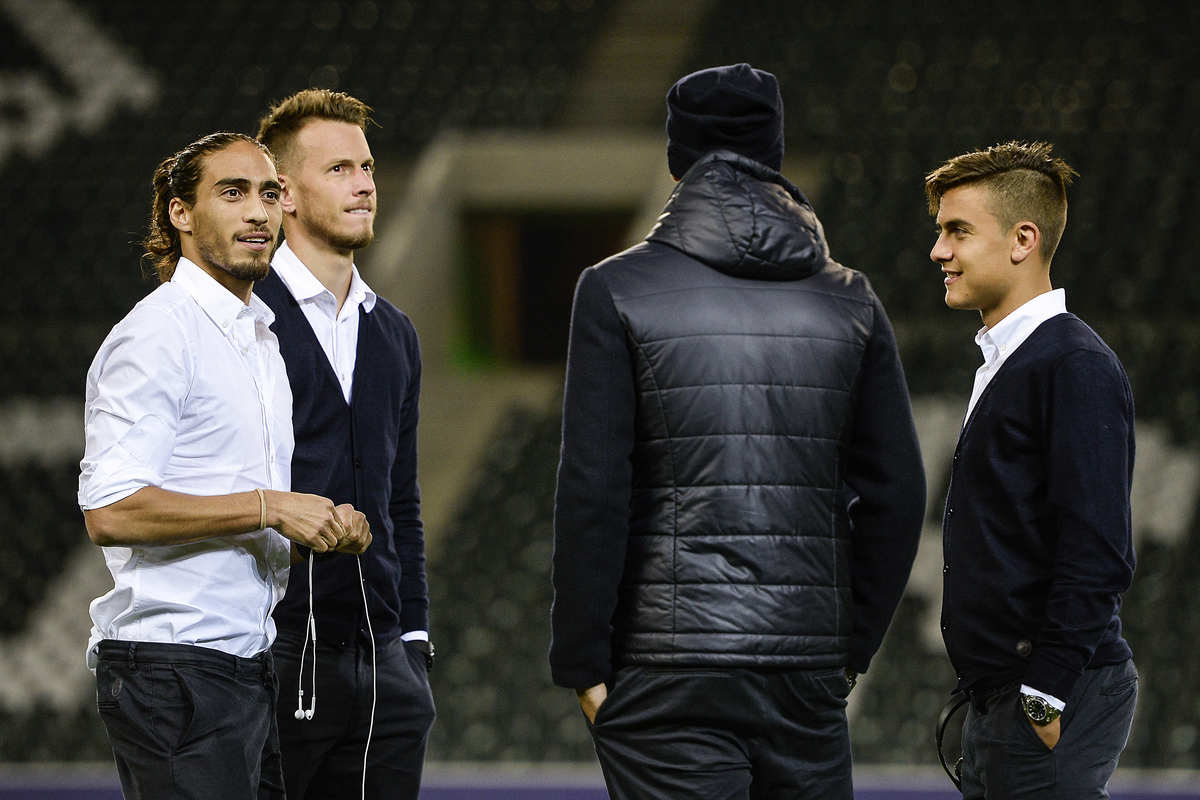 Lo svizzero, tra i convocati per la trasferta Champions dopo un mese dall'operazione al cuore, sorride con i compagni sul campo del Borussia Moenchengladbach