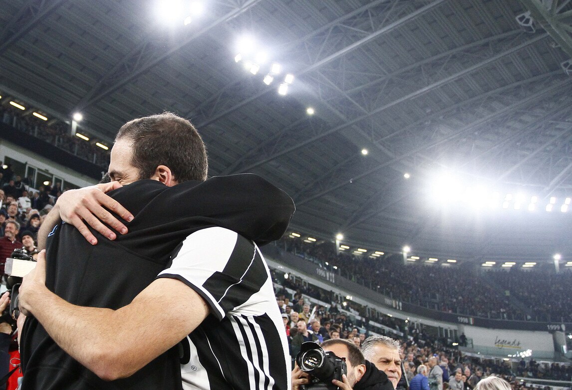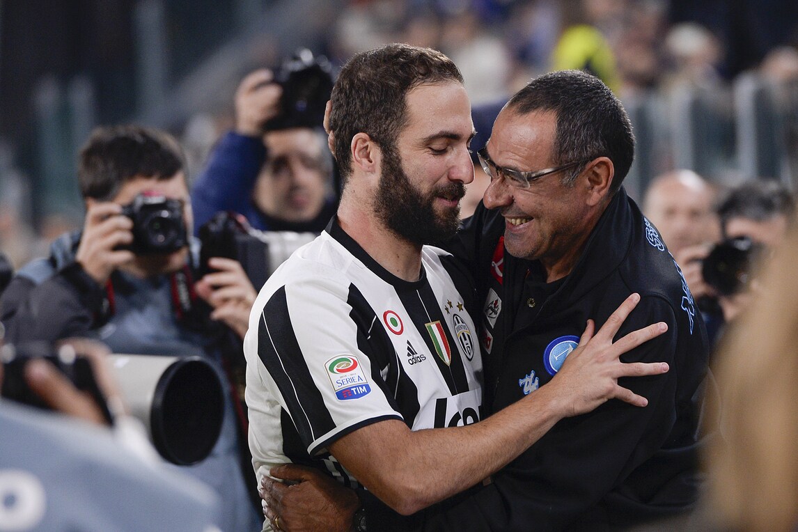 Juventus-Napoli, l'abbraccio fra Higuain e Sarri