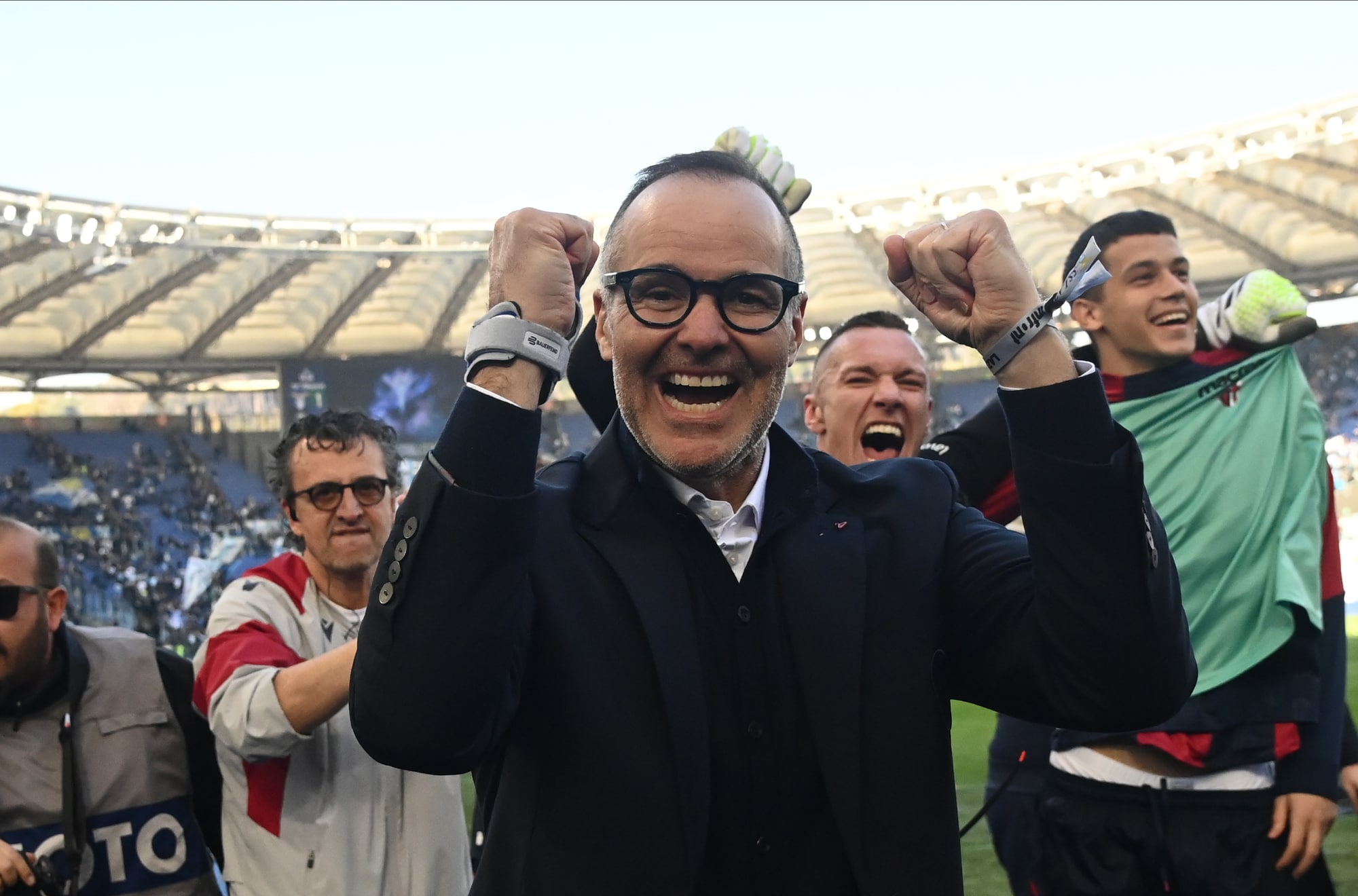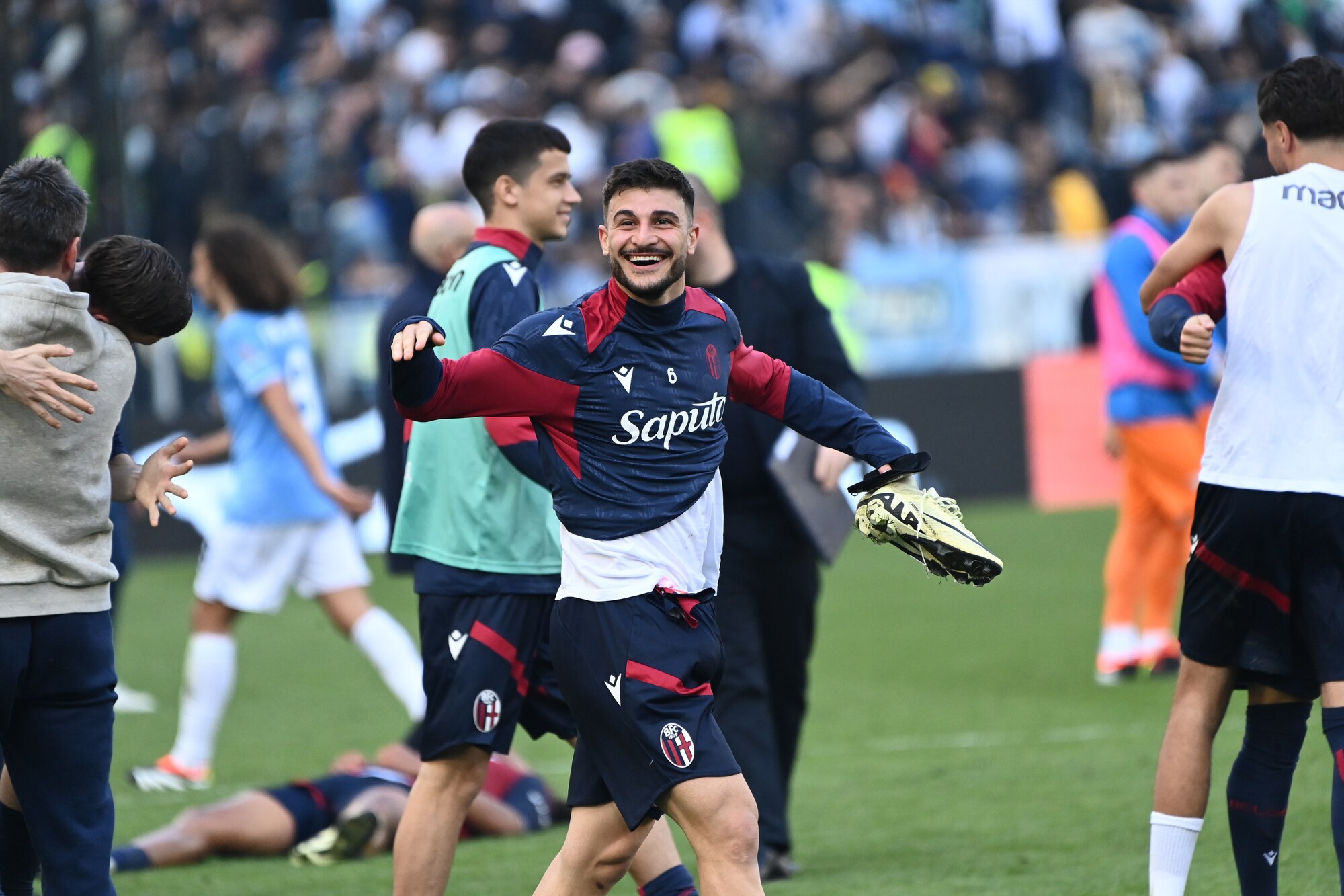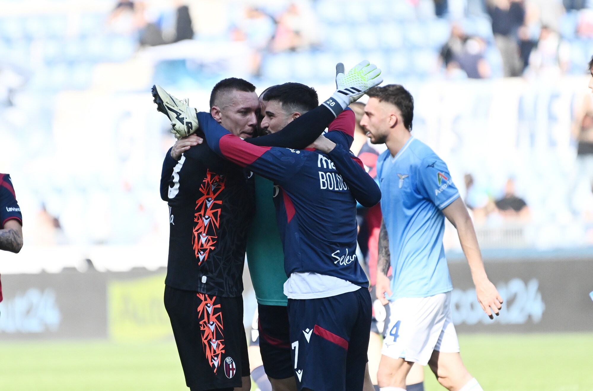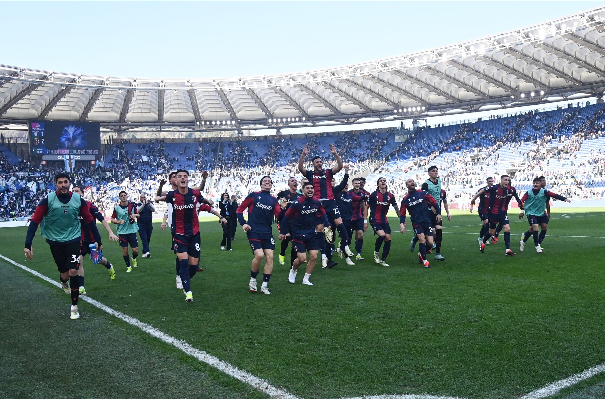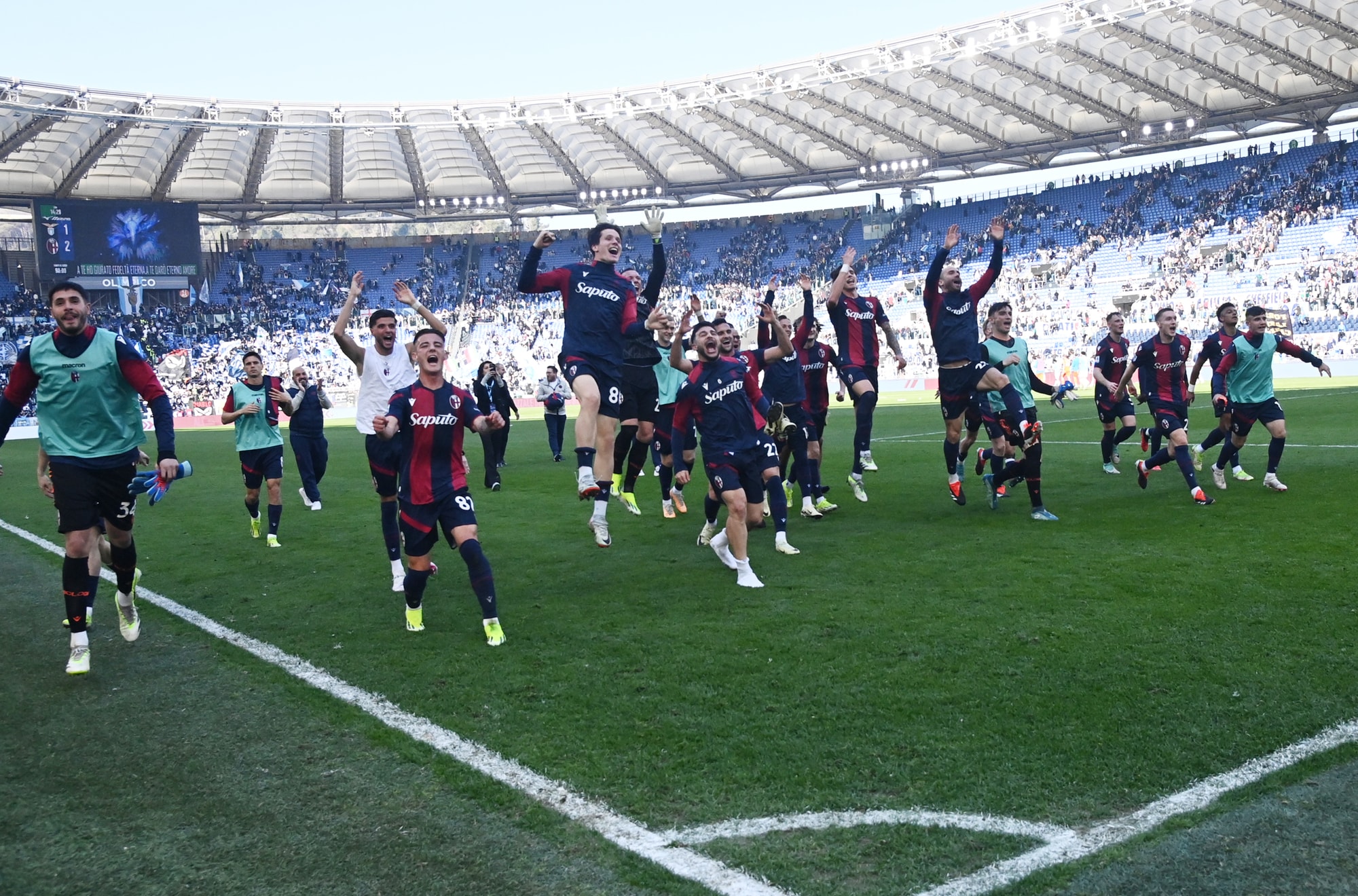 I rossoblu festeggiano la vittoria in rimonta contro la Lazio sul prato dell'Olimpico assieme ai propri tifosi