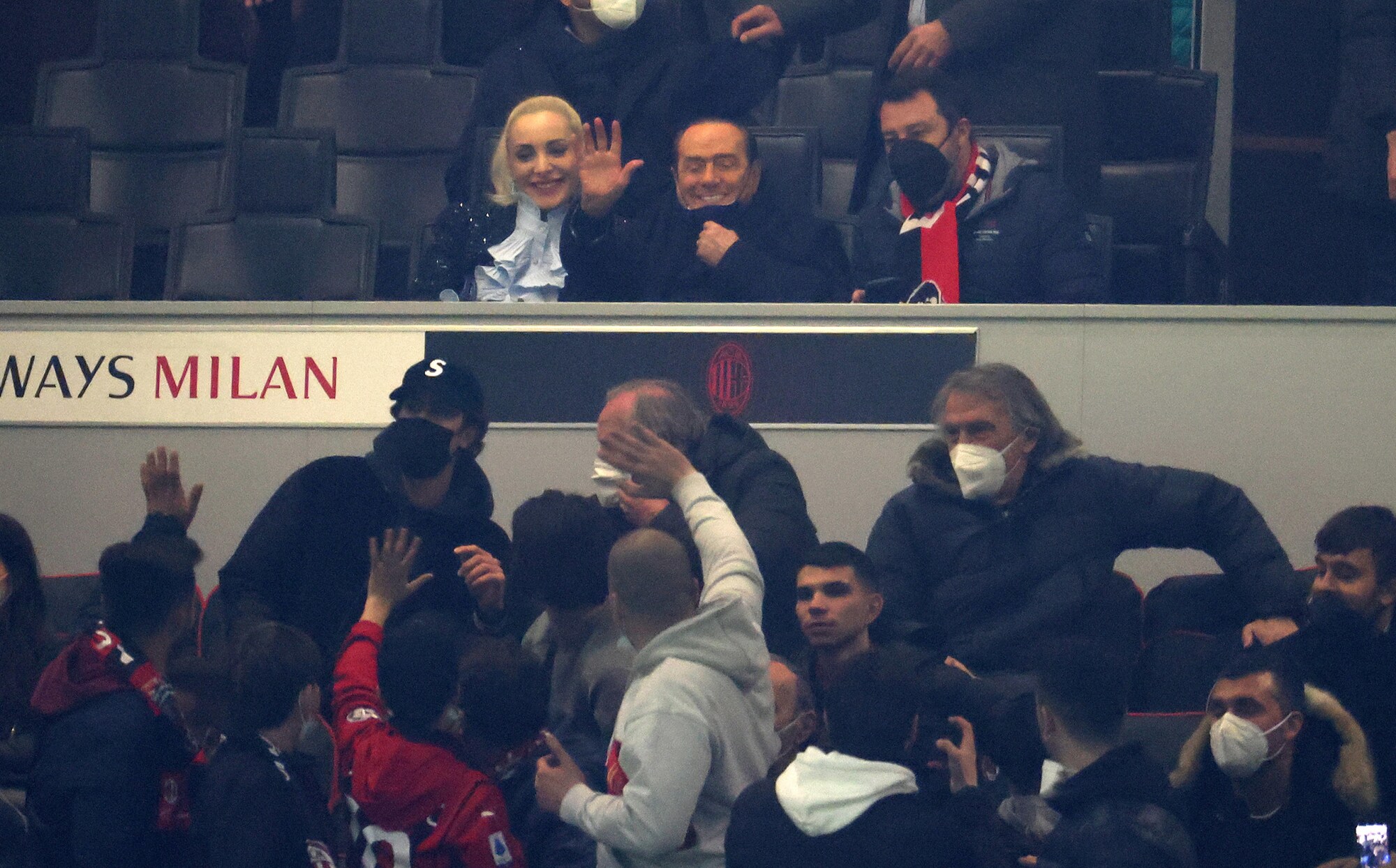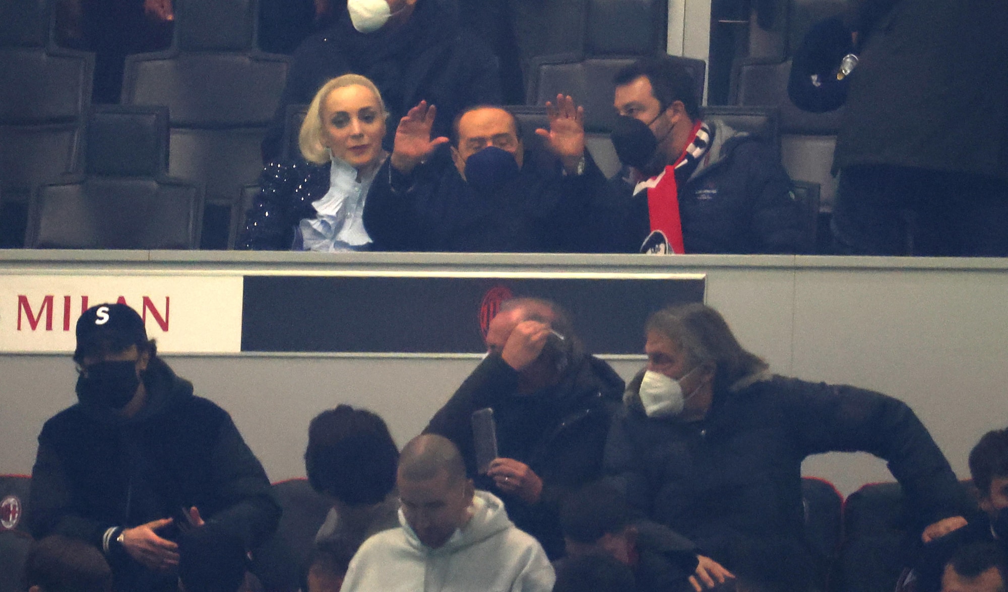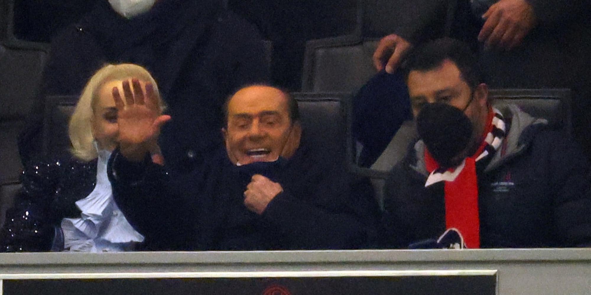 L'ex presidente del Milan in tribuna durante il match contro il Bologna accompagnato dalla Fascina e dal leader della Lega