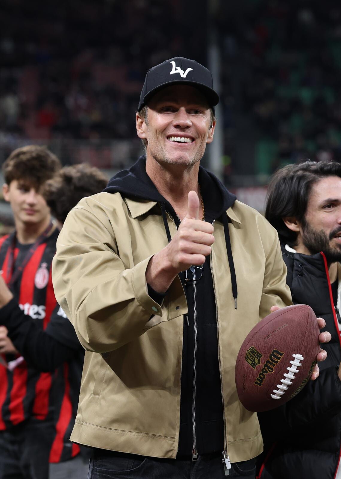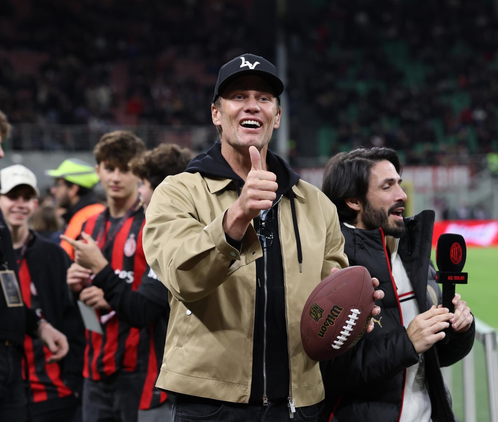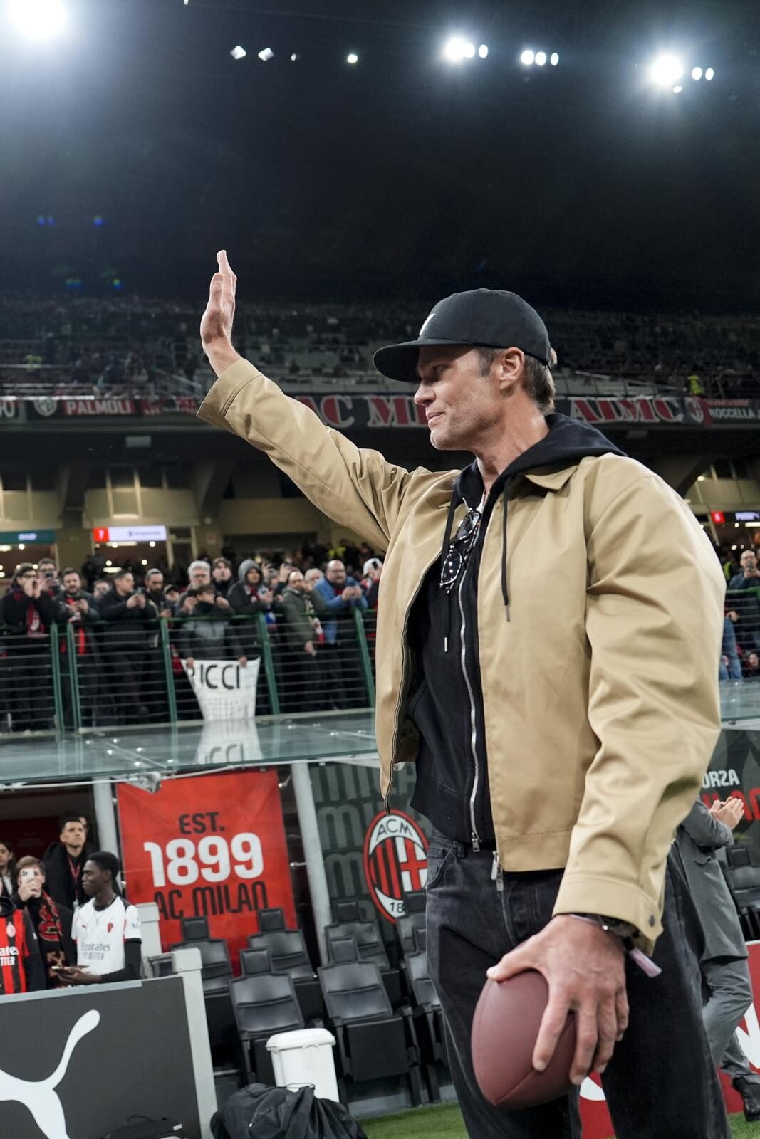Il campione di football americano, marito della top model brasiliana Gisele Bundchen, è l'ospite d'onore del recupero della 24esima giornata di Serie A. Eccolo in campo insieme al senior advisor rossonero