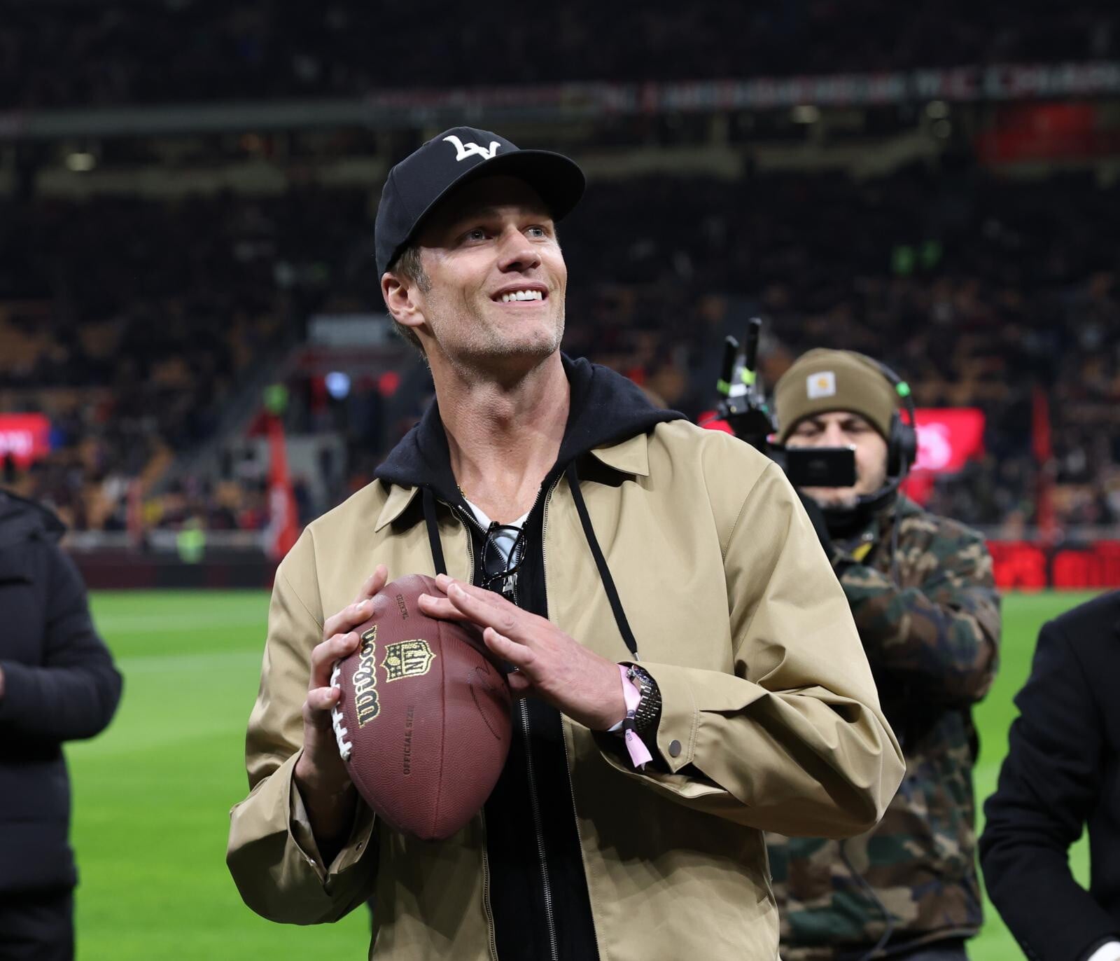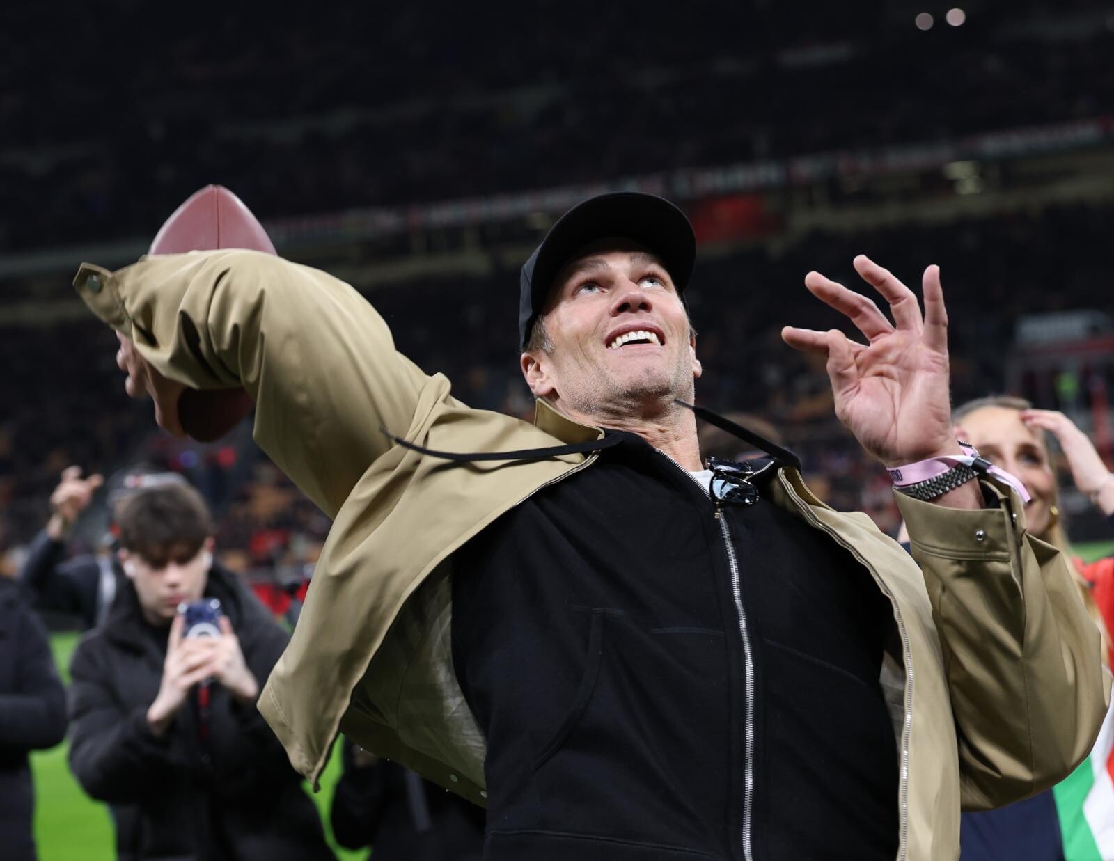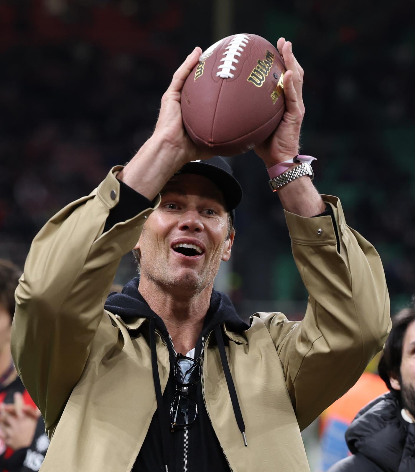 Il campione di football americano, marito della top model brasiliana Gisele Bundchen, è l'ospite d'onore del recupero della 24esima giornata di Serie A. Eccolo in campo insieme al senior advisor rossonero