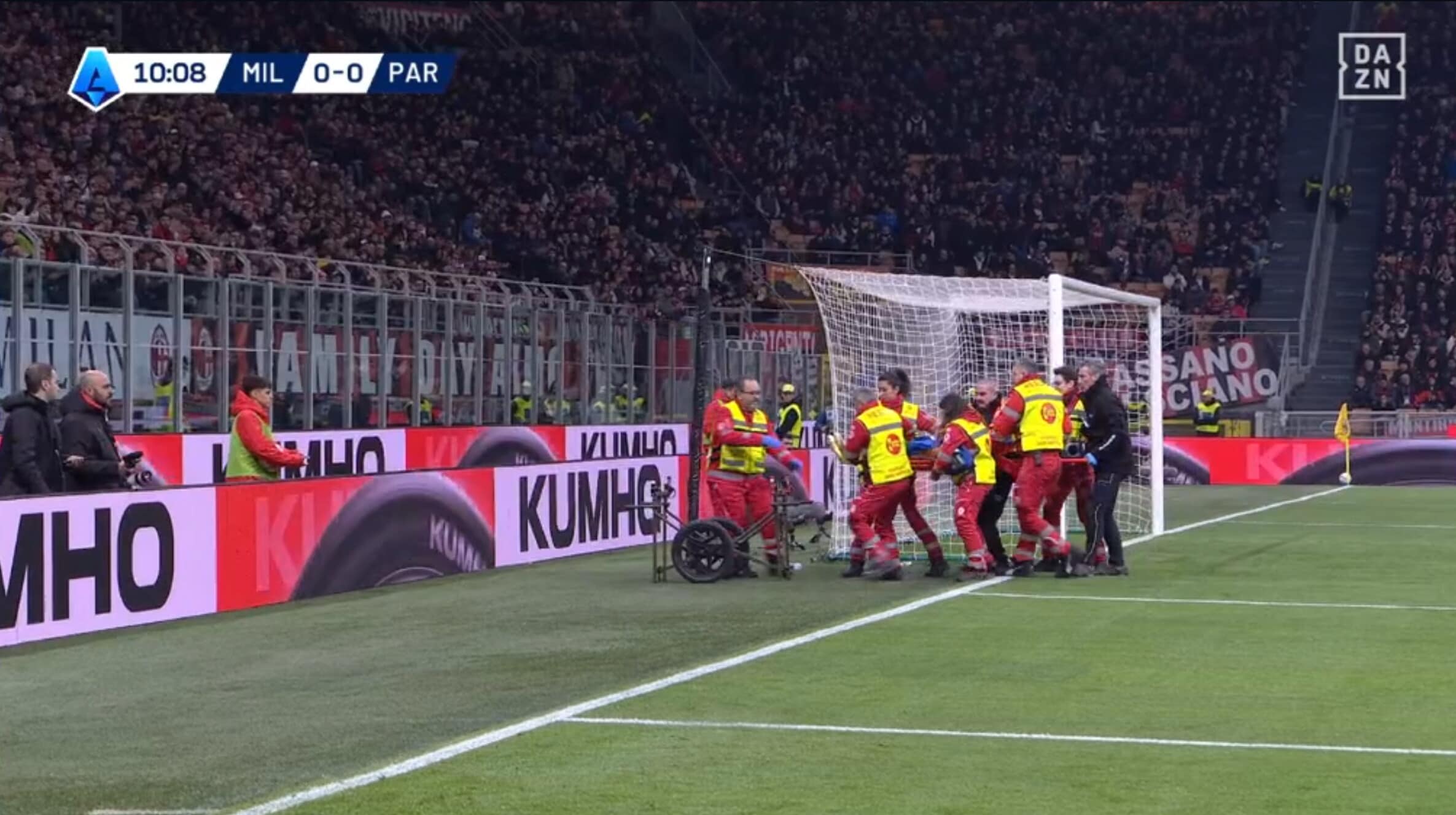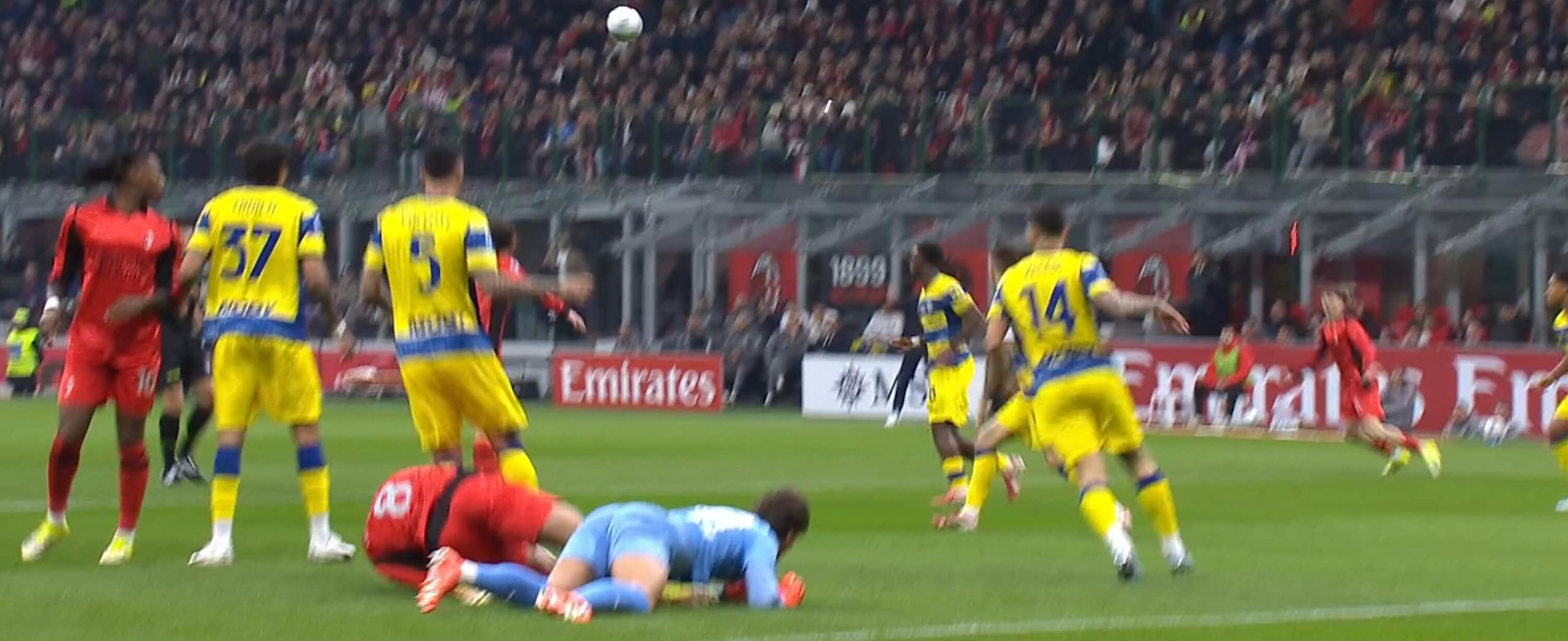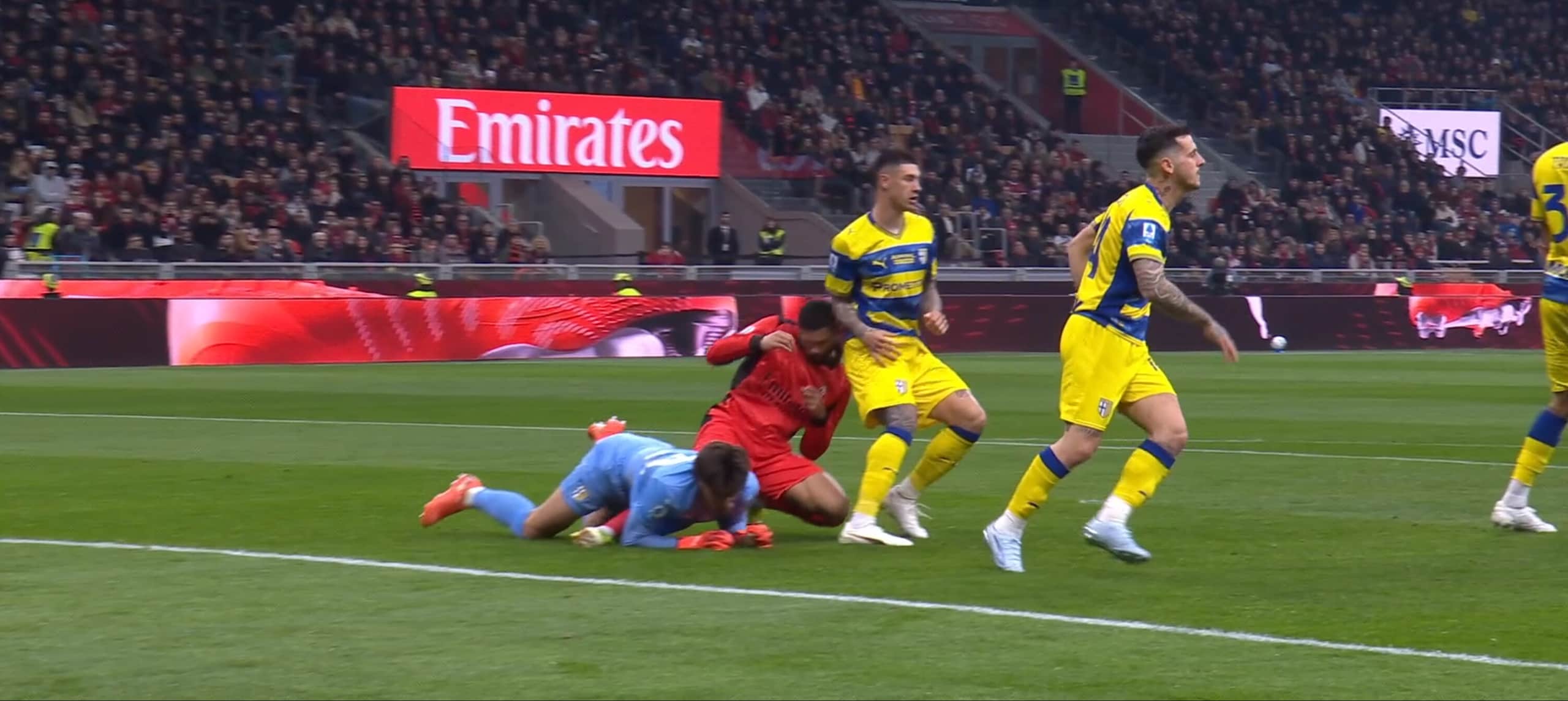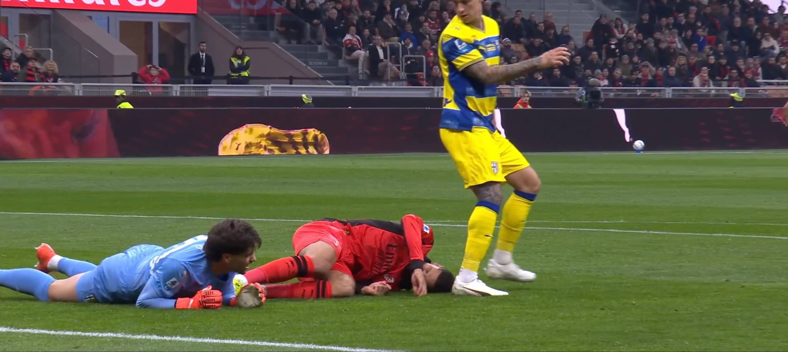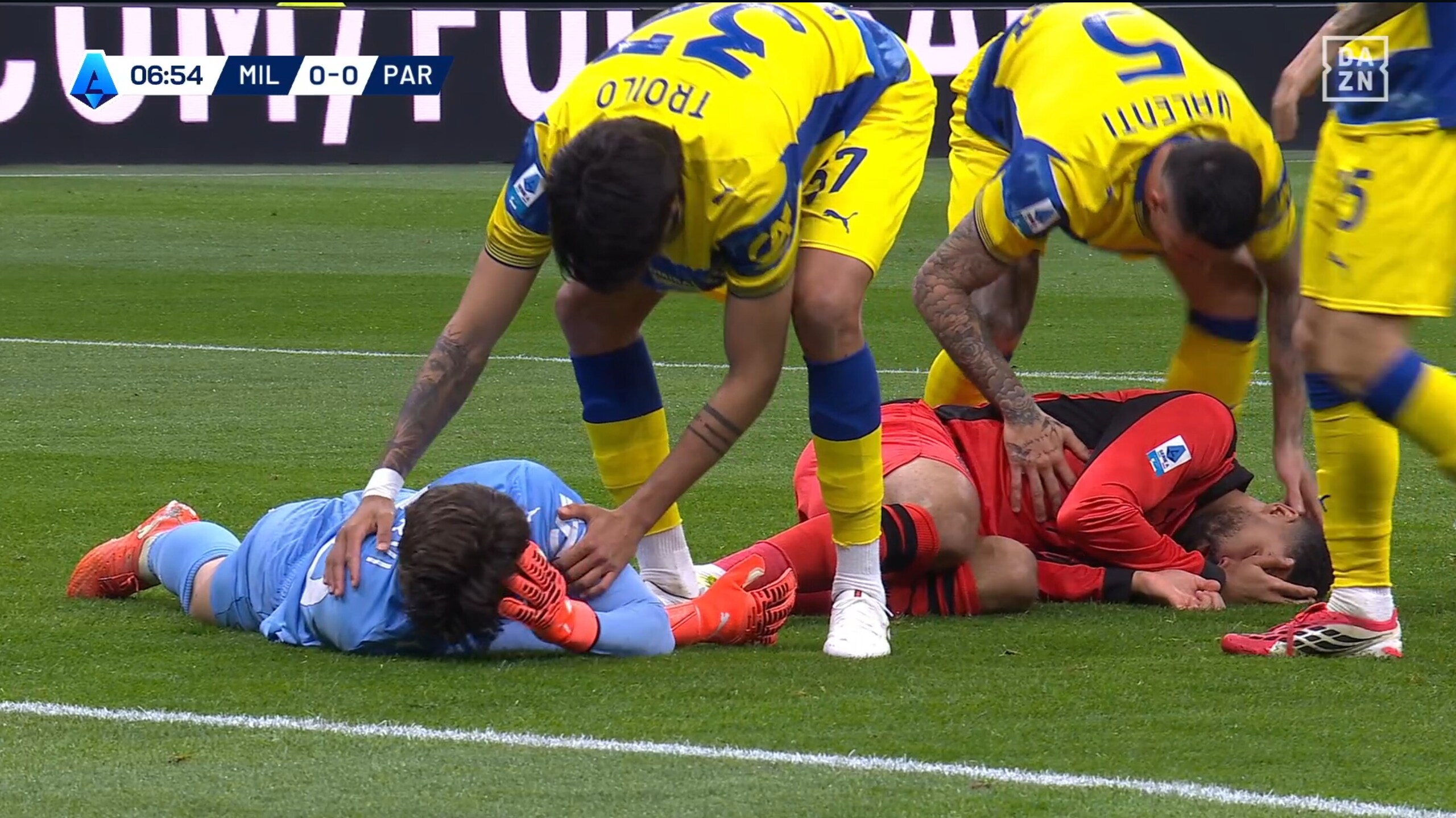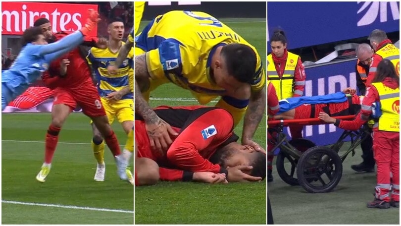 Forte scontro tra la testa del centrocampista del Milan e quella del portiere del Parma in uscita: ha la peggio l'inglese che resta a terra stordito prima di lasciare il campo in barella tra gli applausi del pubblico