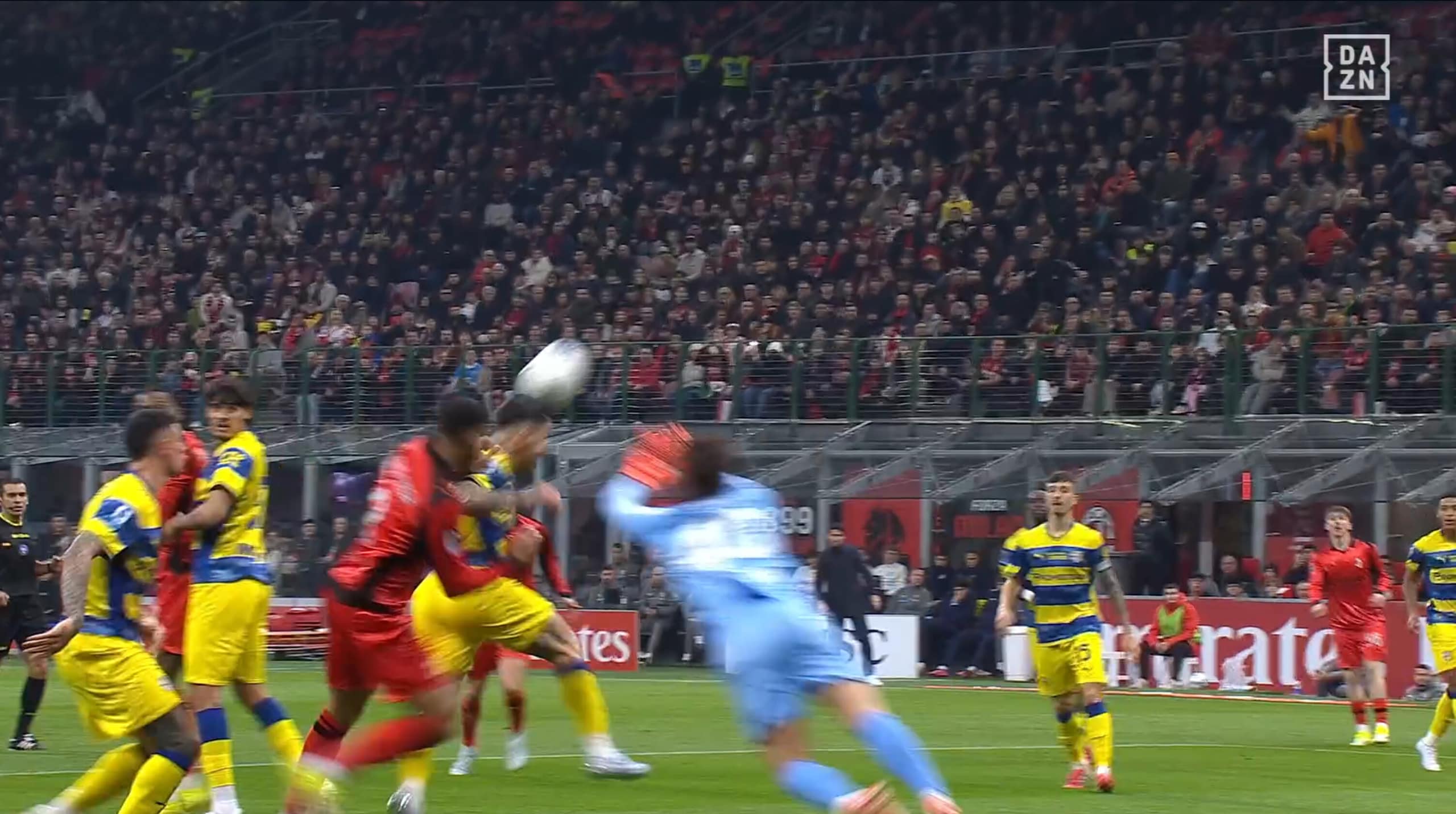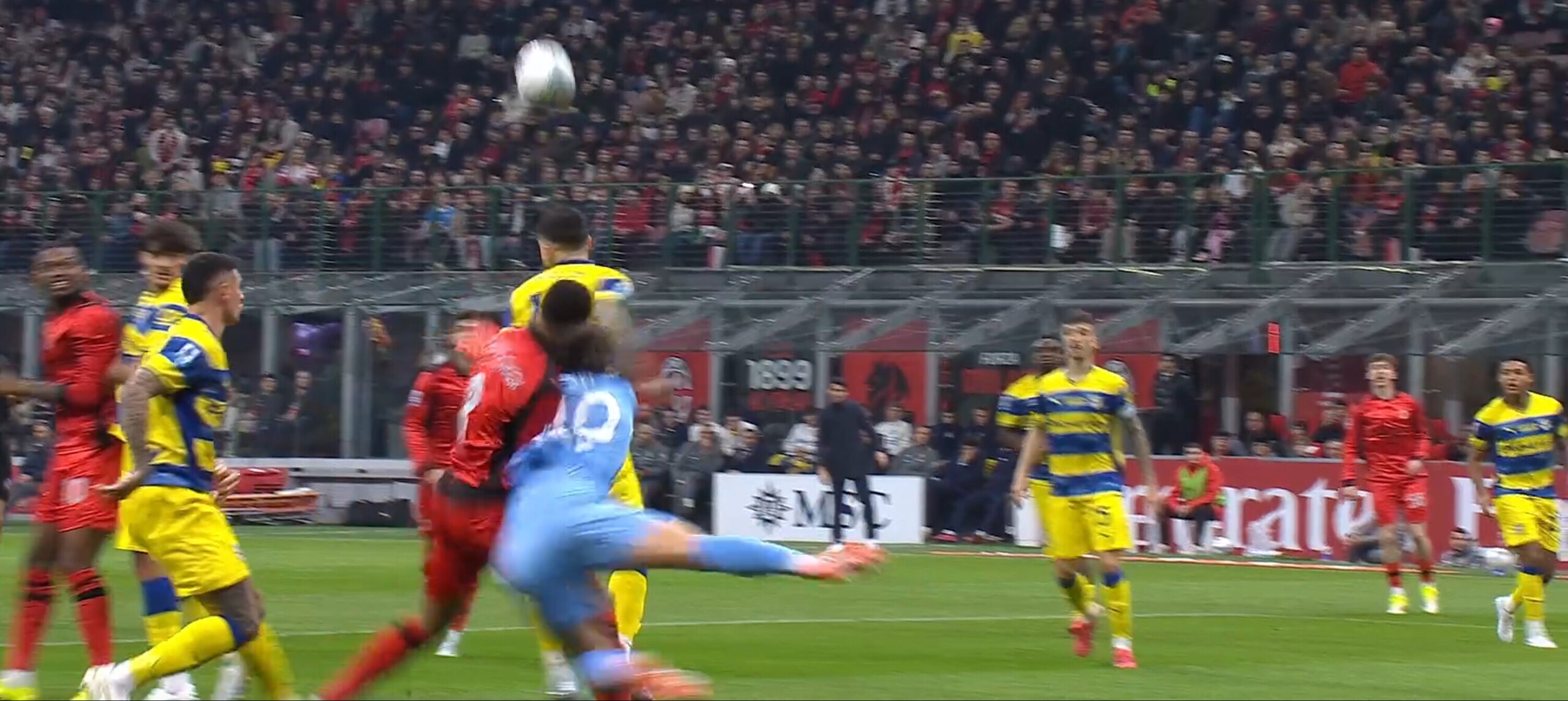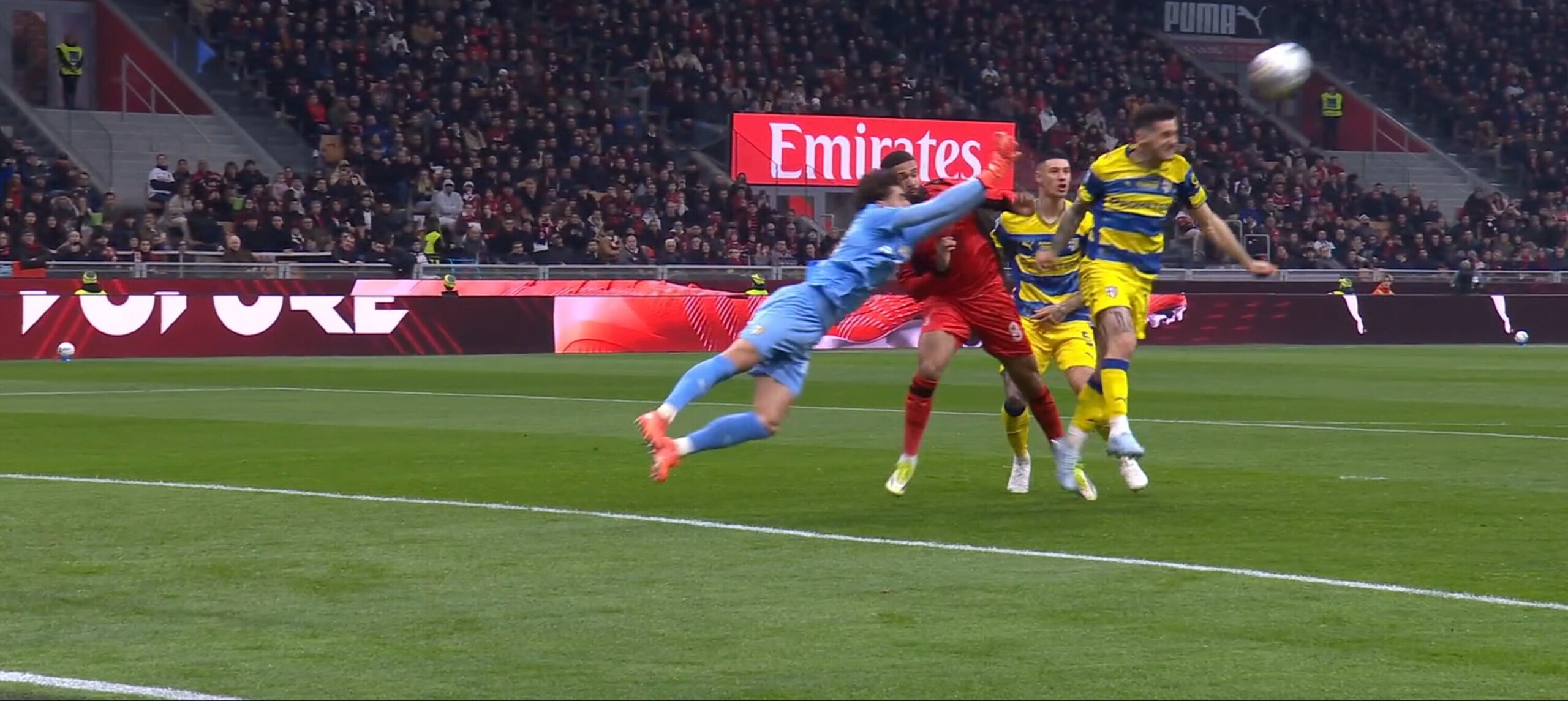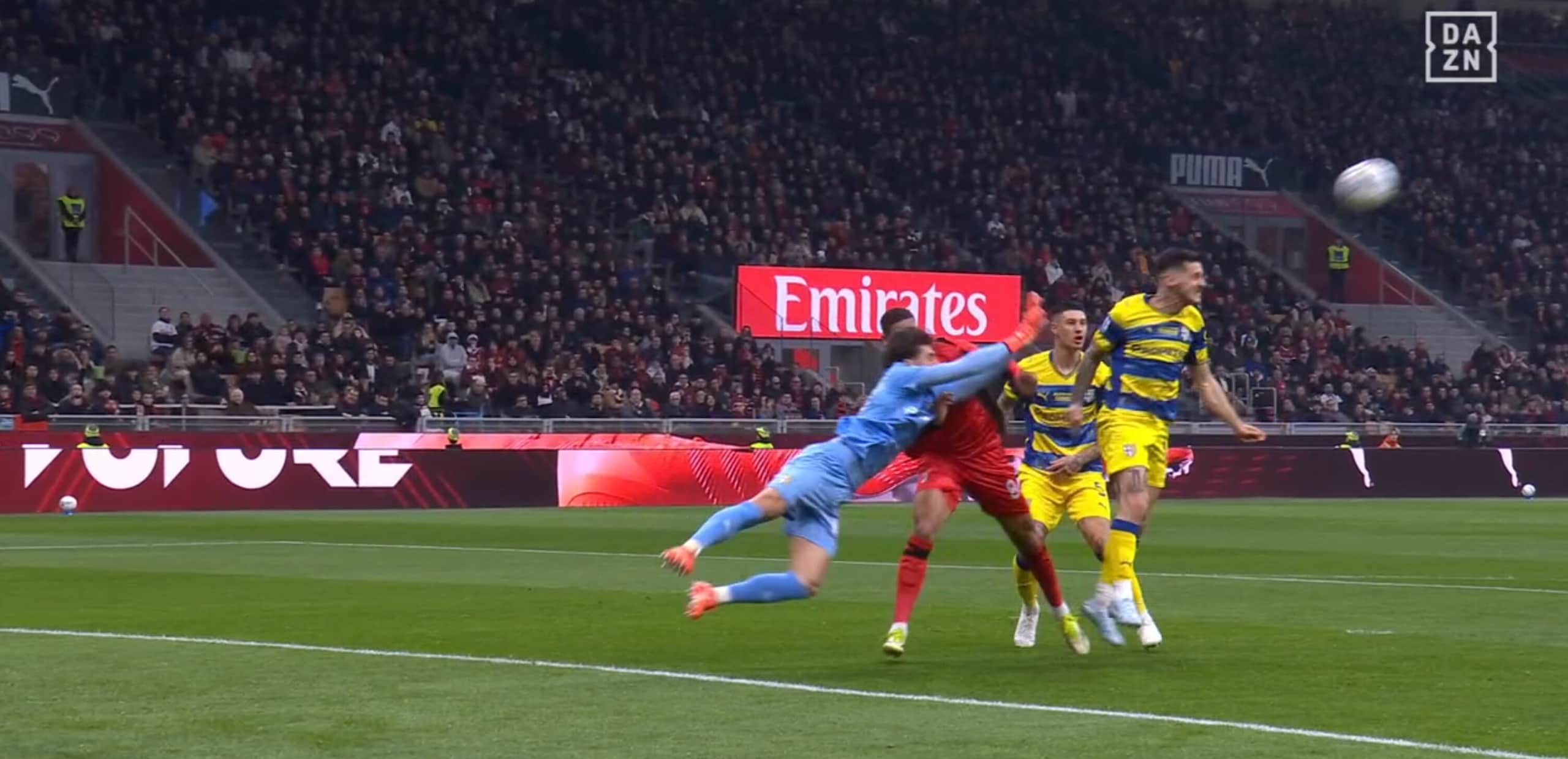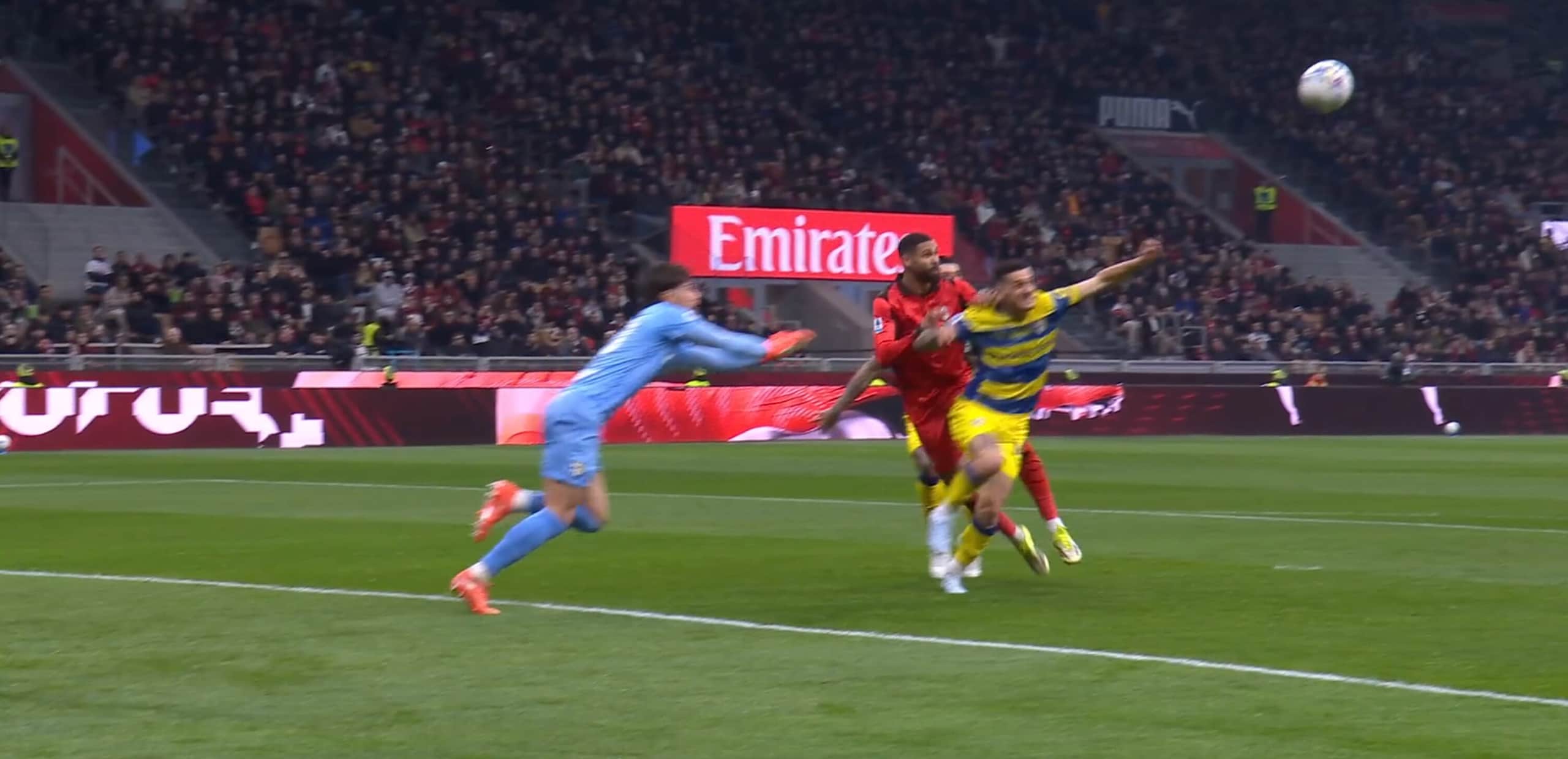 Forte scontro tra la testa del centrocampista del Milan e quella del portiere del Parma in uscita: ha la peggio l'inglese che resta a terra stordito prima di lasciare il campo in barella tra gli applausi del pubblico